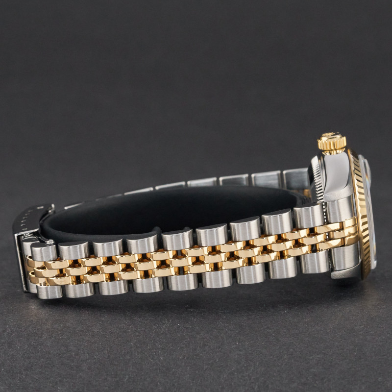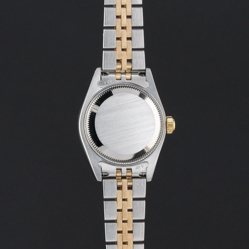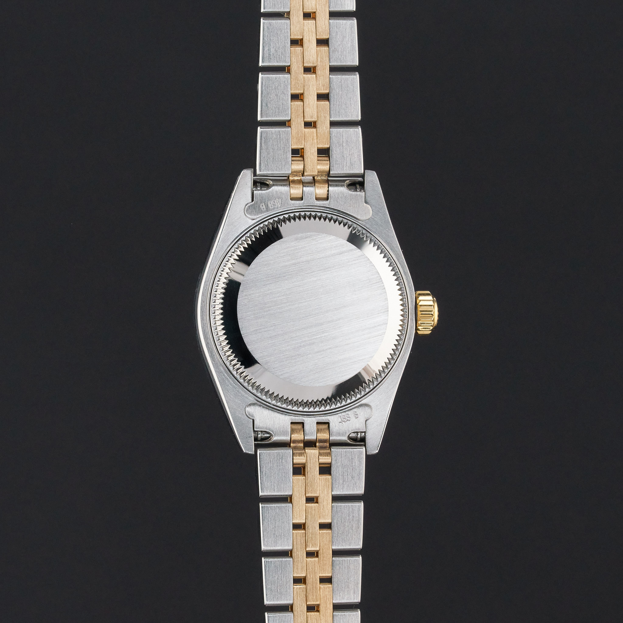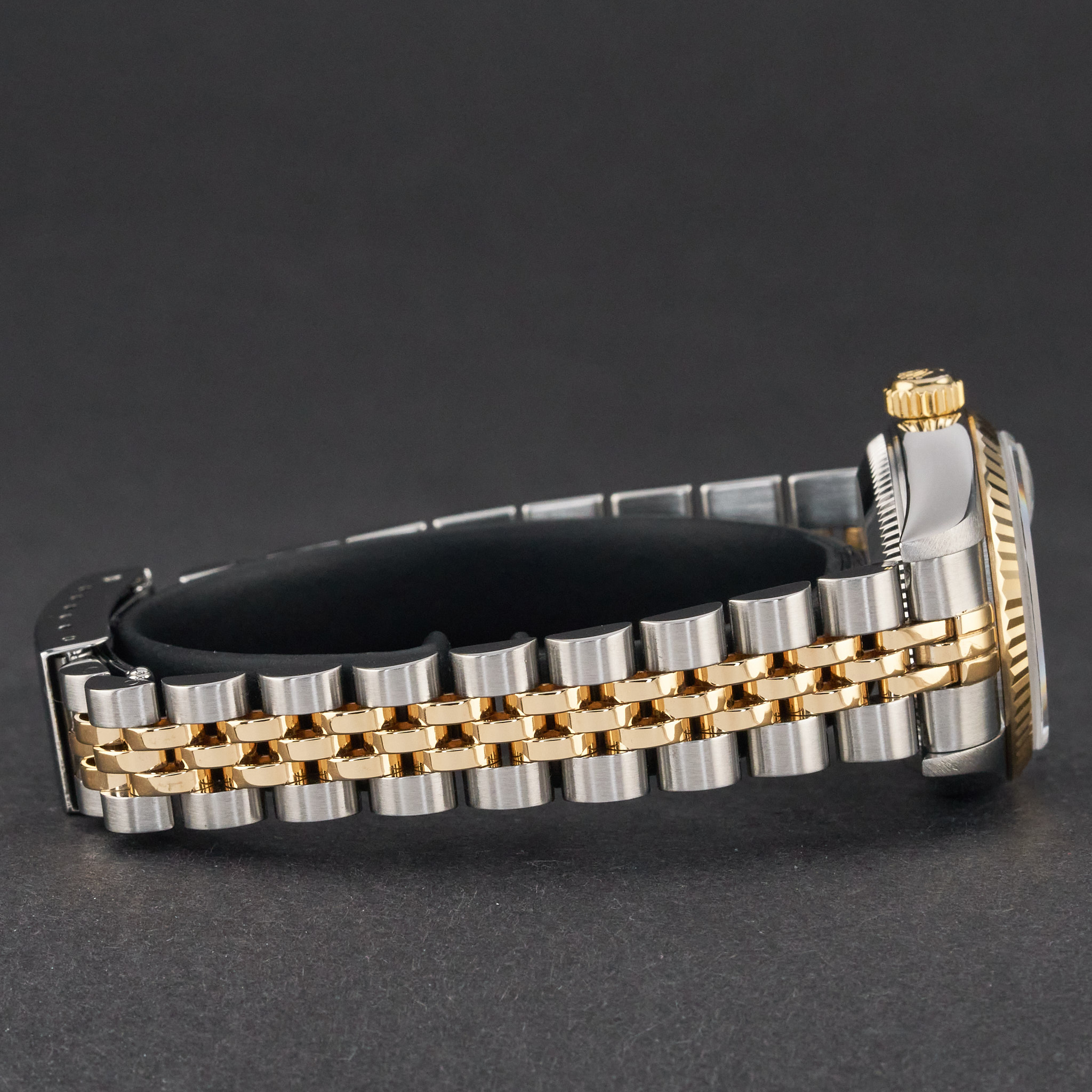 This Rolex Lady-Datejust 79173 features a White Roman diamond dial and is crafted from 18K yellow gold and stainless steel, with a production year of 2000.
