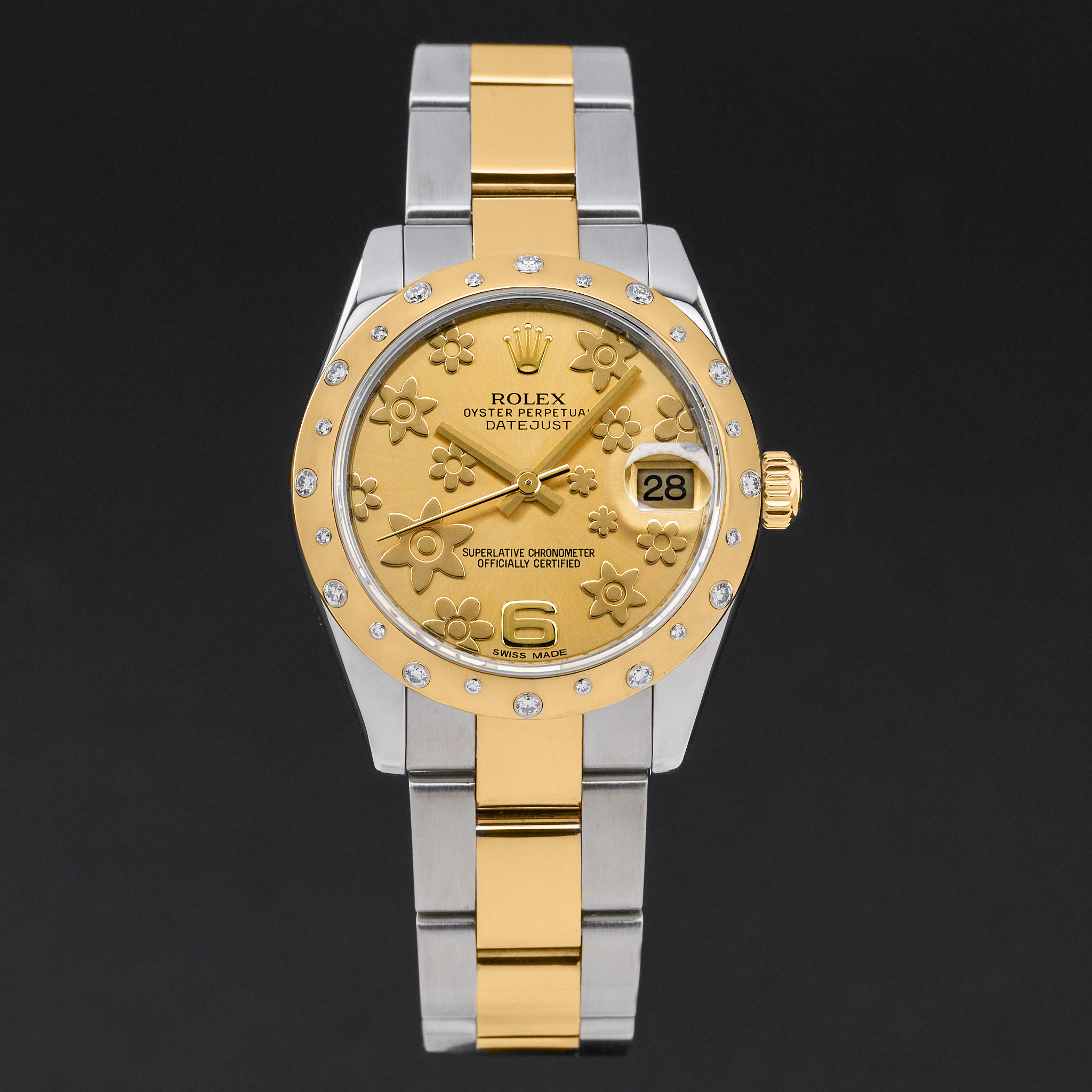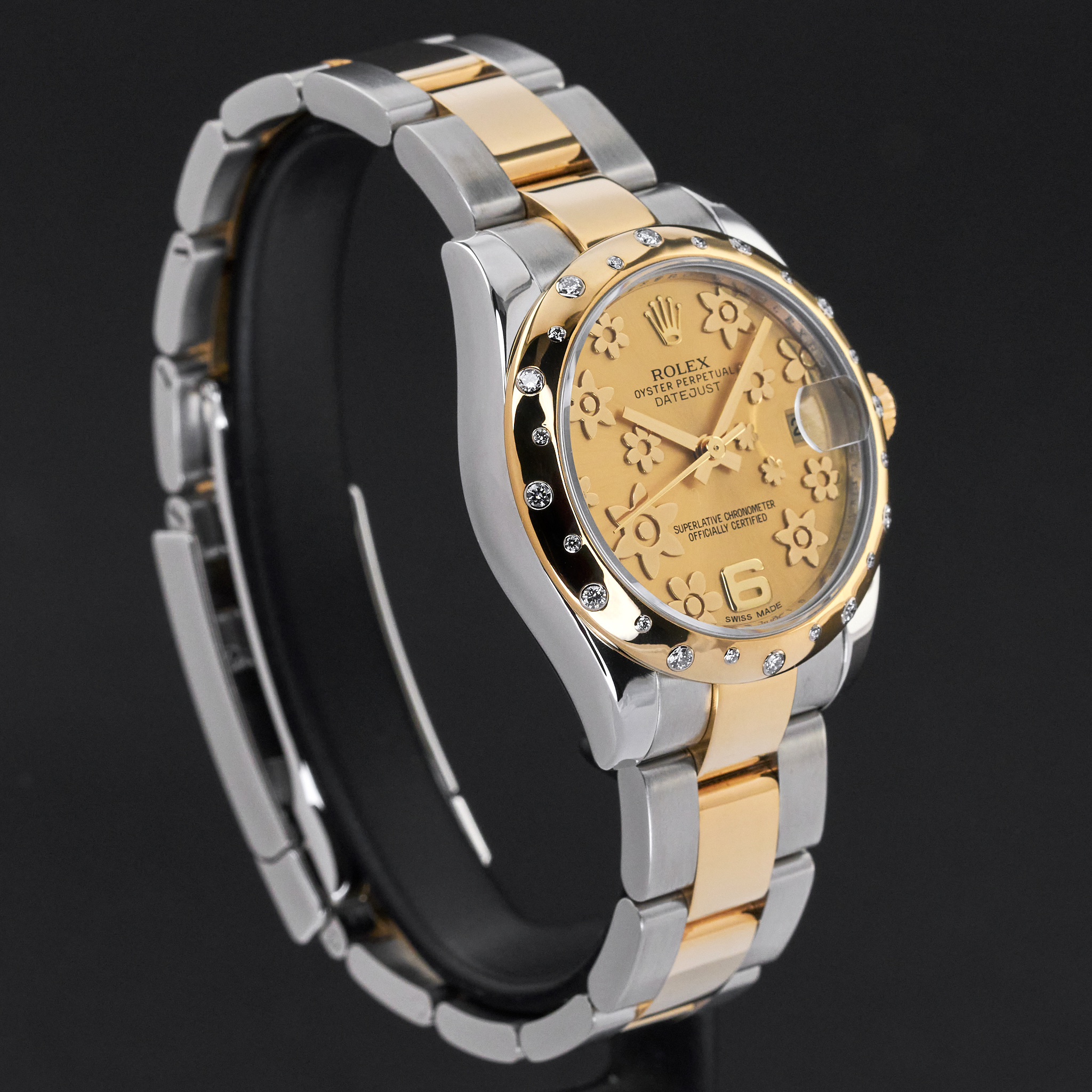 This Rolex Datejust 178343 features a Champagne floral arabic dial and is crafted from 18K yellow gold and stainless steel, with a production year of 2010.