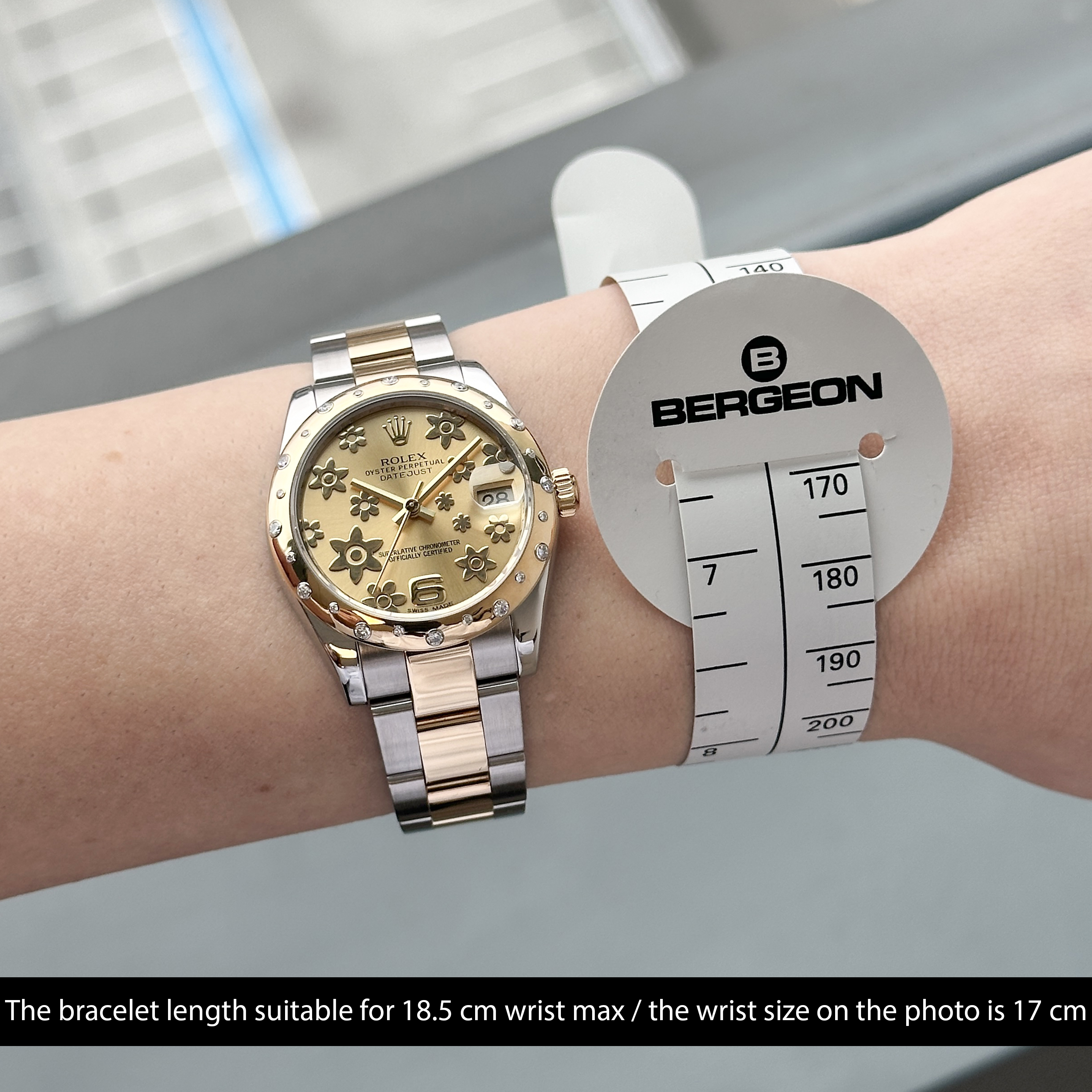 This particular Rolex Datejust introduced in 2010, the design blends a unique two-tone aesthetic with refined luxury. The champagne dial, featuring a floral pattern and Arabic numerals, adds sophistication and a distinctive style to the timepiece. This detail gives the watch a unique character while maintaining its elegance and versatility for any occasion.