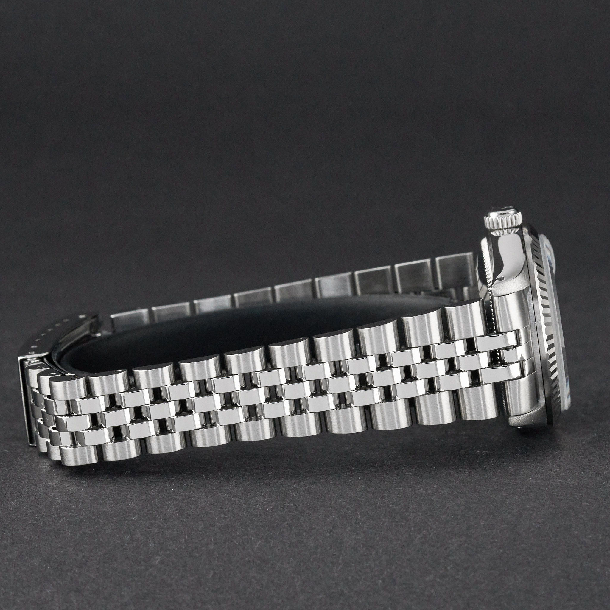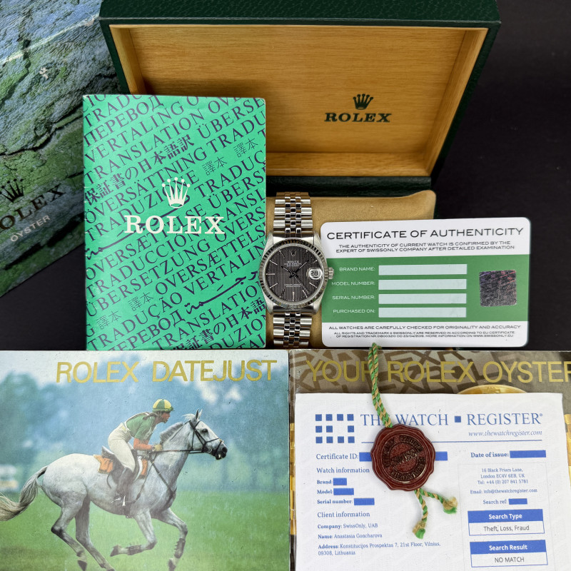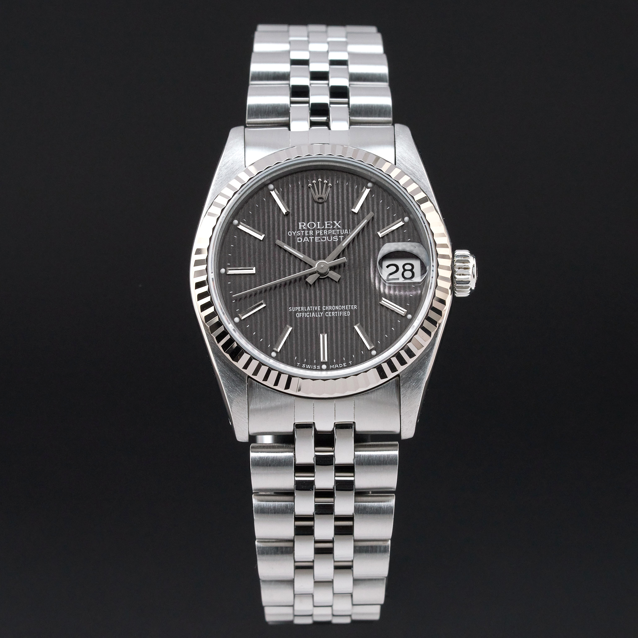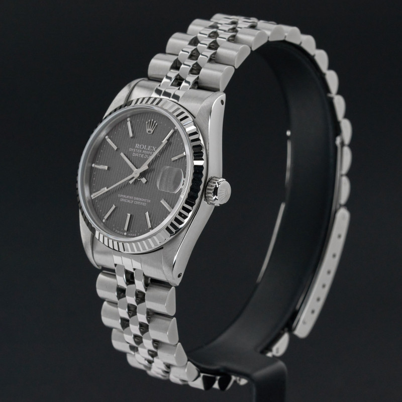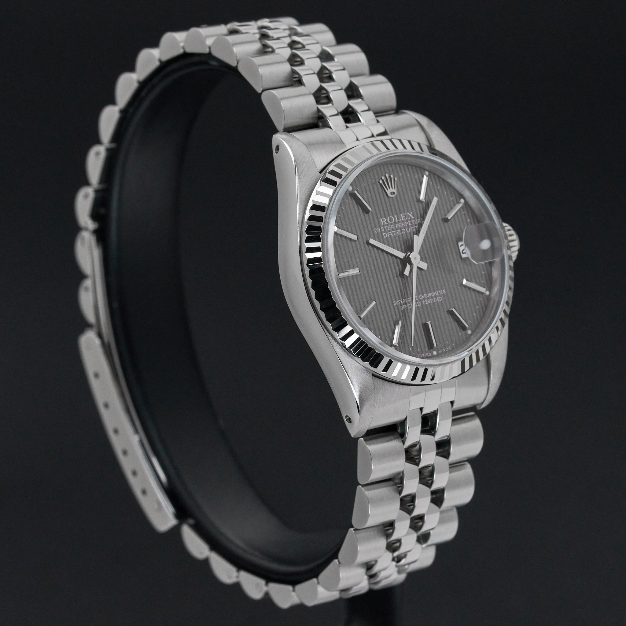 This Rolex Datejust 68274 features a Grey Tapestry dial and is crafted from from stainless steel, with a production year of 1991.