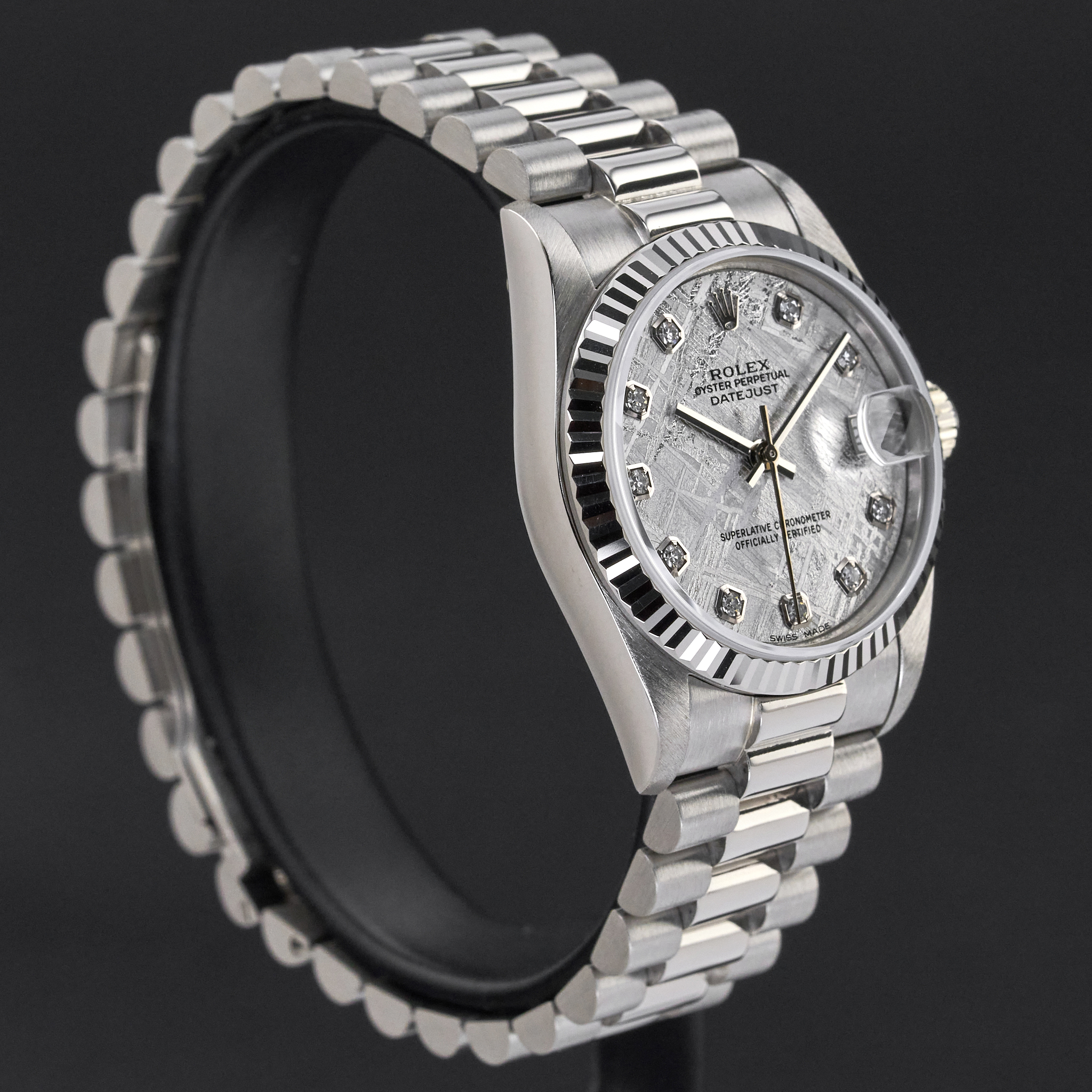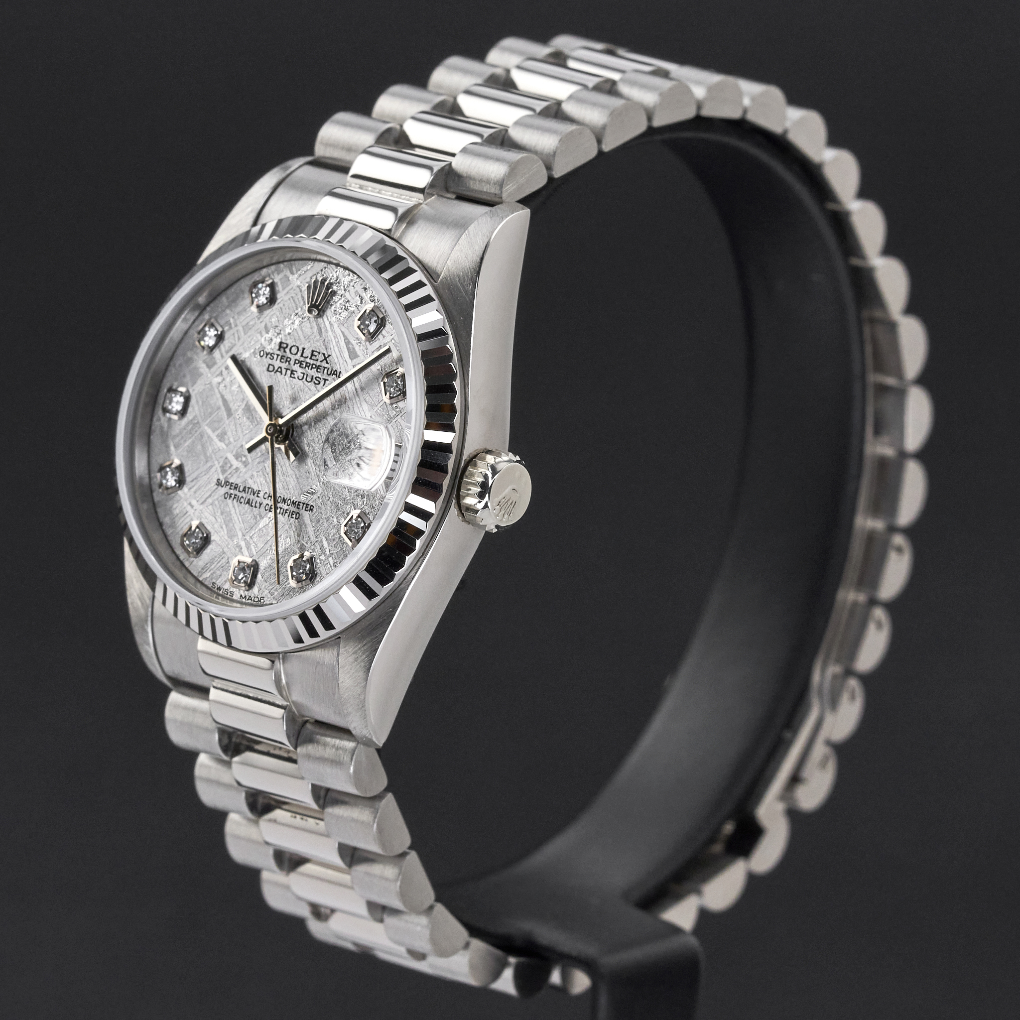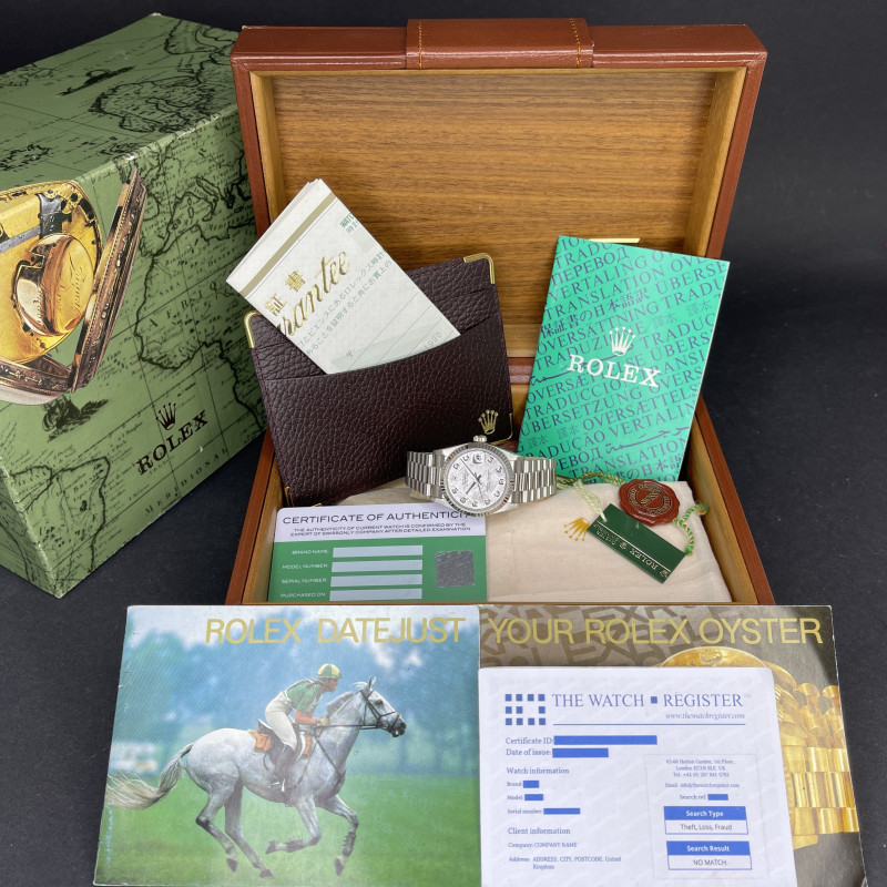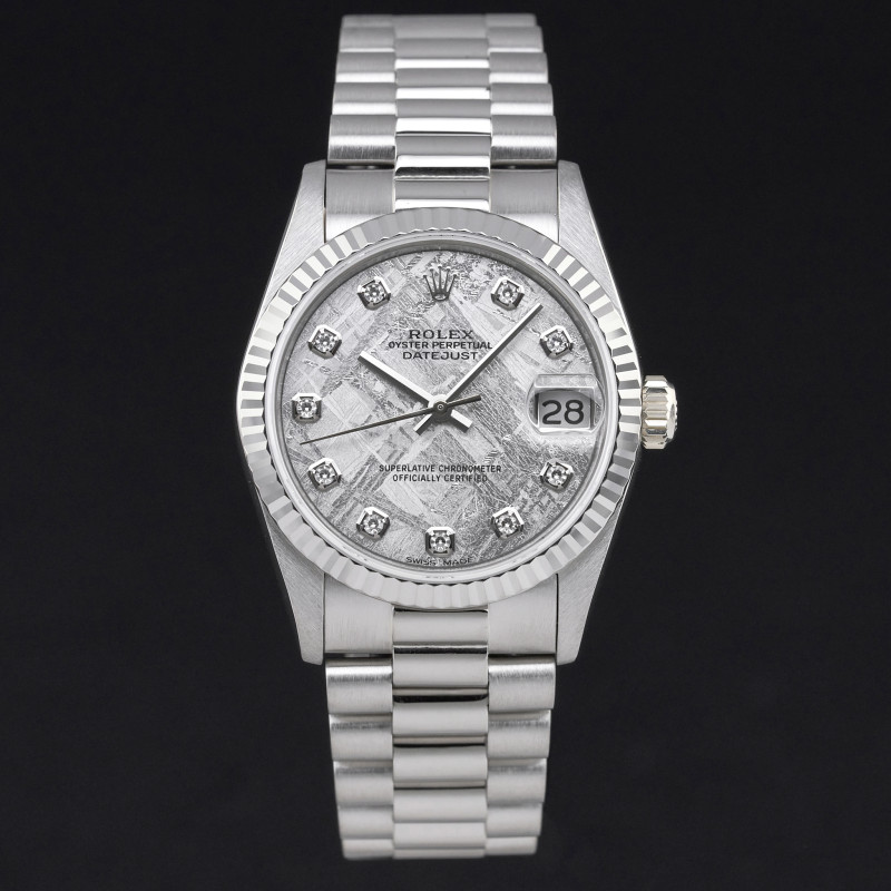 This Rolex Datejust 68279 features a Silver Meteorite big diamond dial and is crafted from 18K white gold, with a production year of 1989.