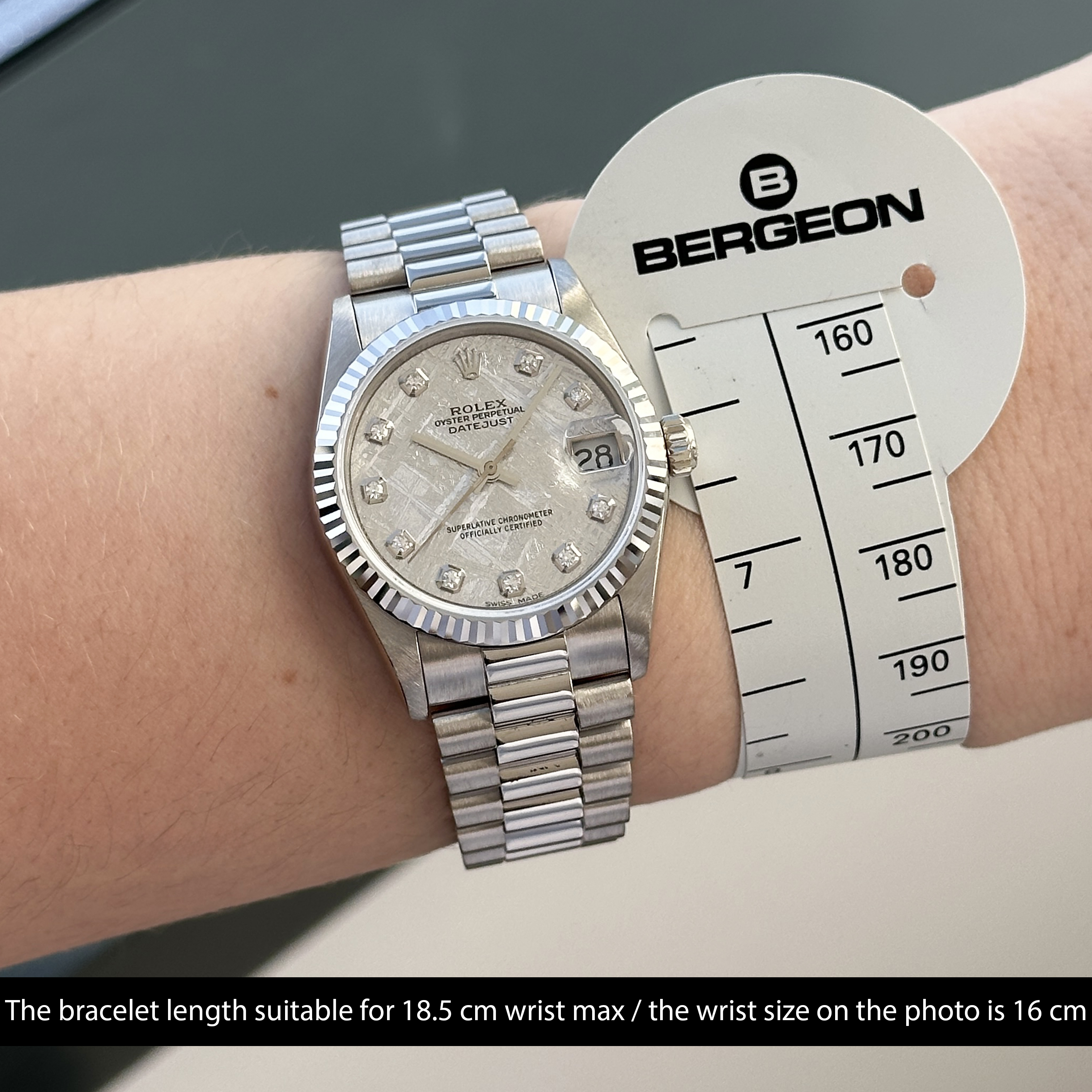 This particular Rolex Datejust introduced in 1989, stands out with its unique silver meteorite dial — a true reflection of the brand’s dedication to innovation and craftsmanship. The natural patterns of the meteorite give the dial a cosmic allure, making this model truly one of a kind. Enhancing this rare material are large diamond hour markers, adding a touch of luxury and brilliance.