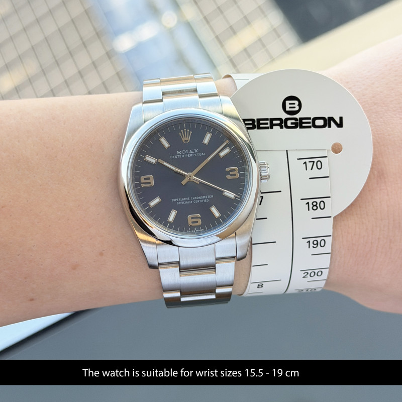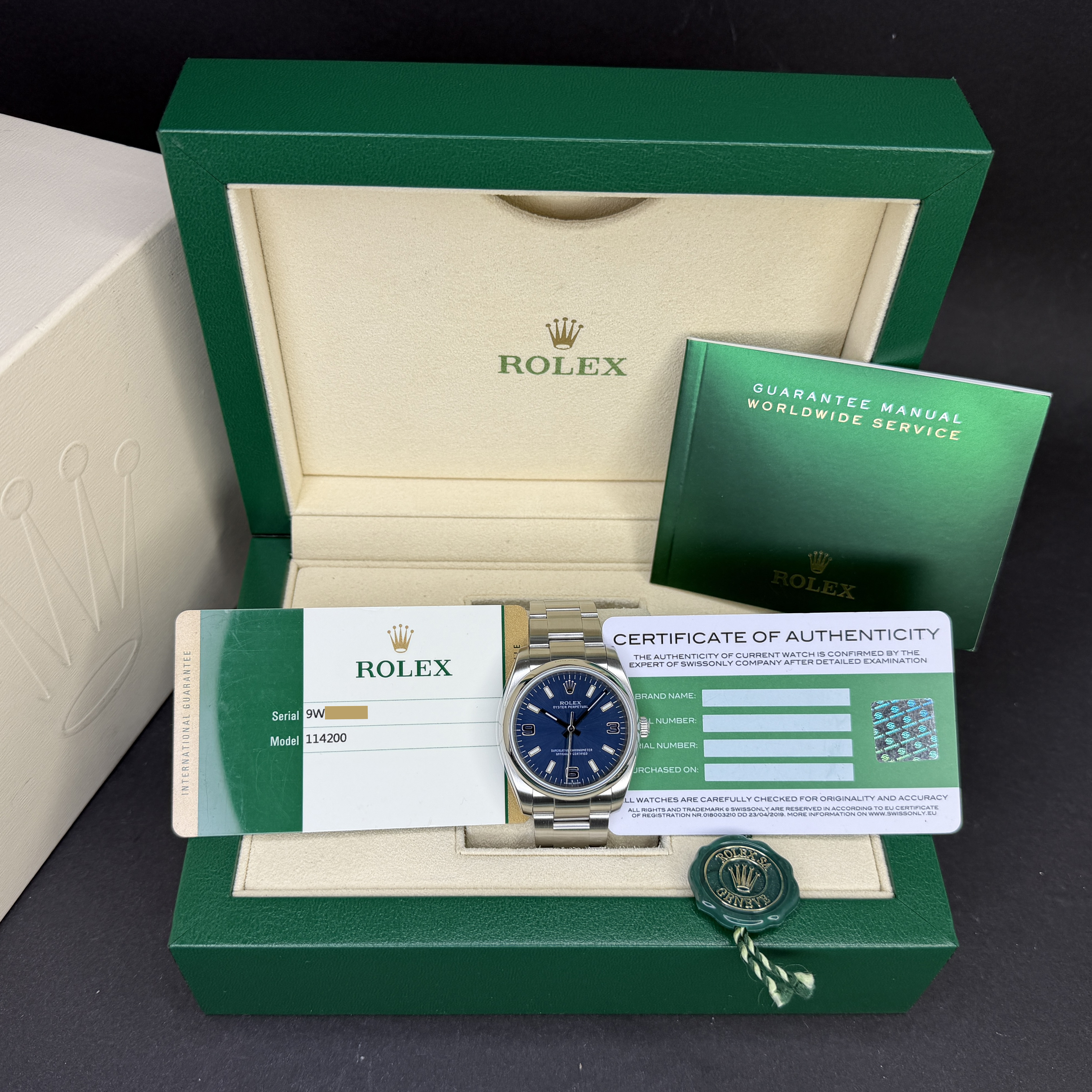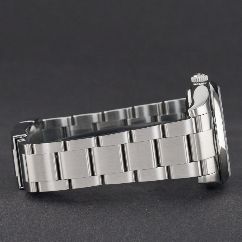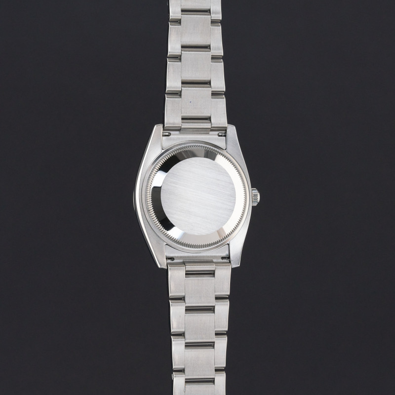 This Rolex Oyster Perpetual 114200 features an Olive dial and is crafted from stainless steel, with a production year of 2017.