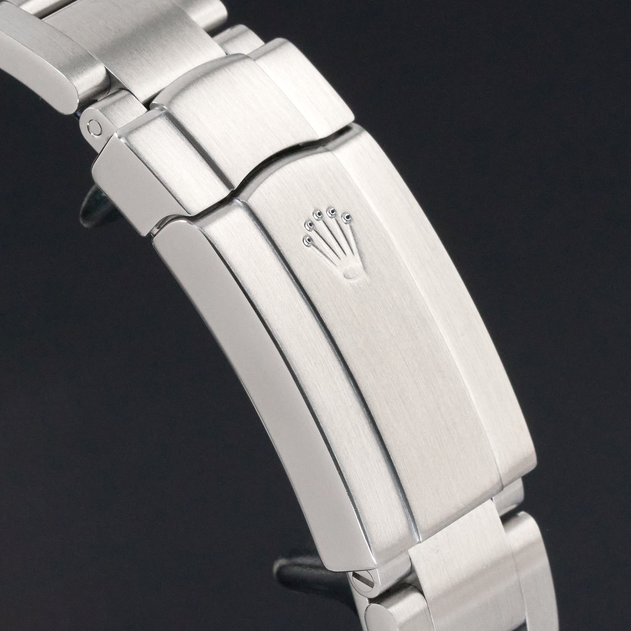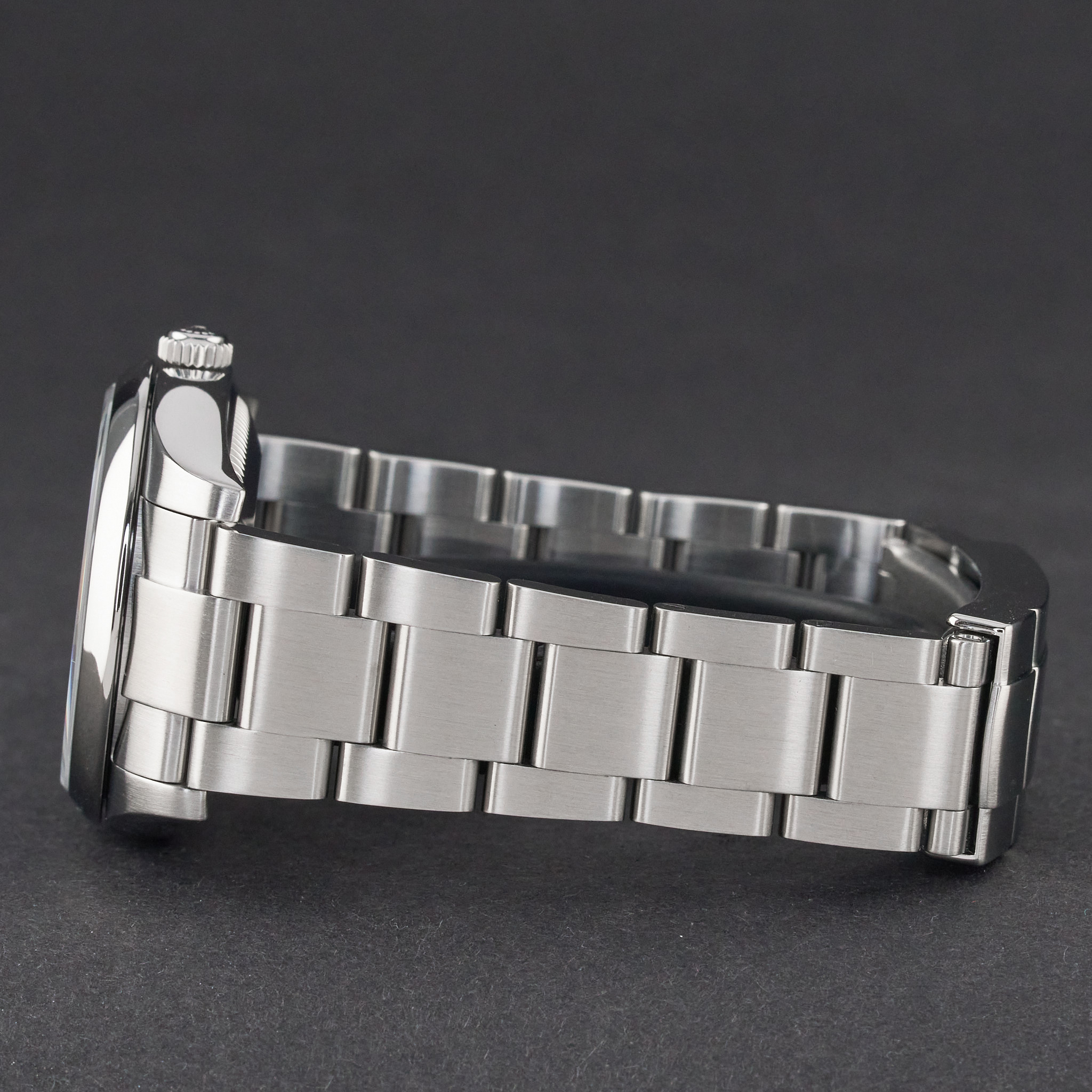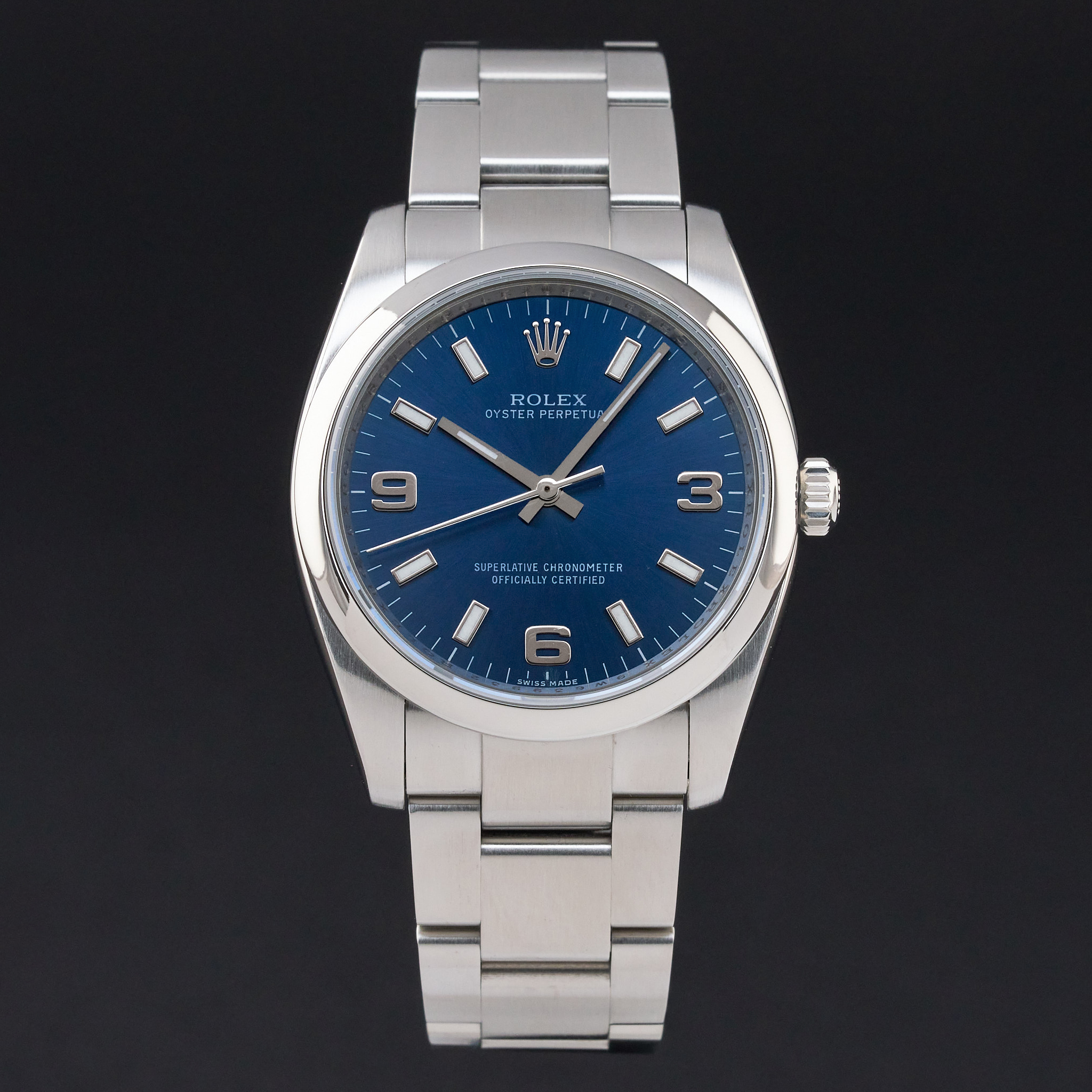 This Rolex Oyster Perpetual 114200 features an Olive dial and is crafted from stainless steel, with a production year of 2017.