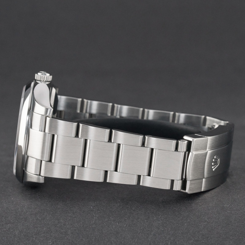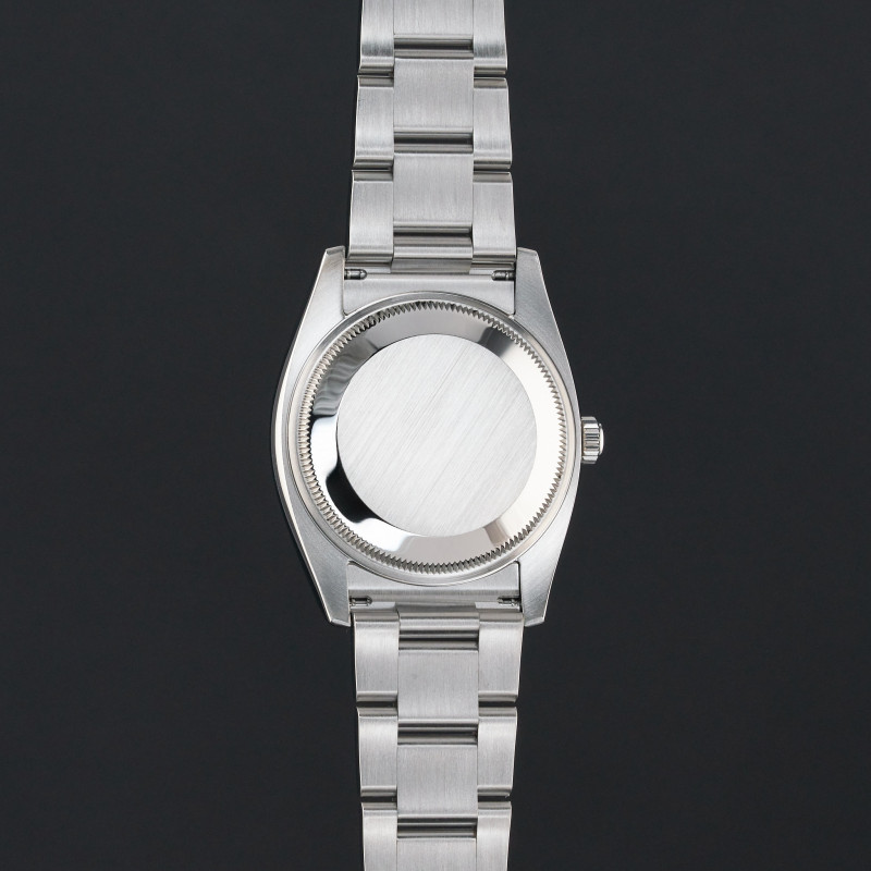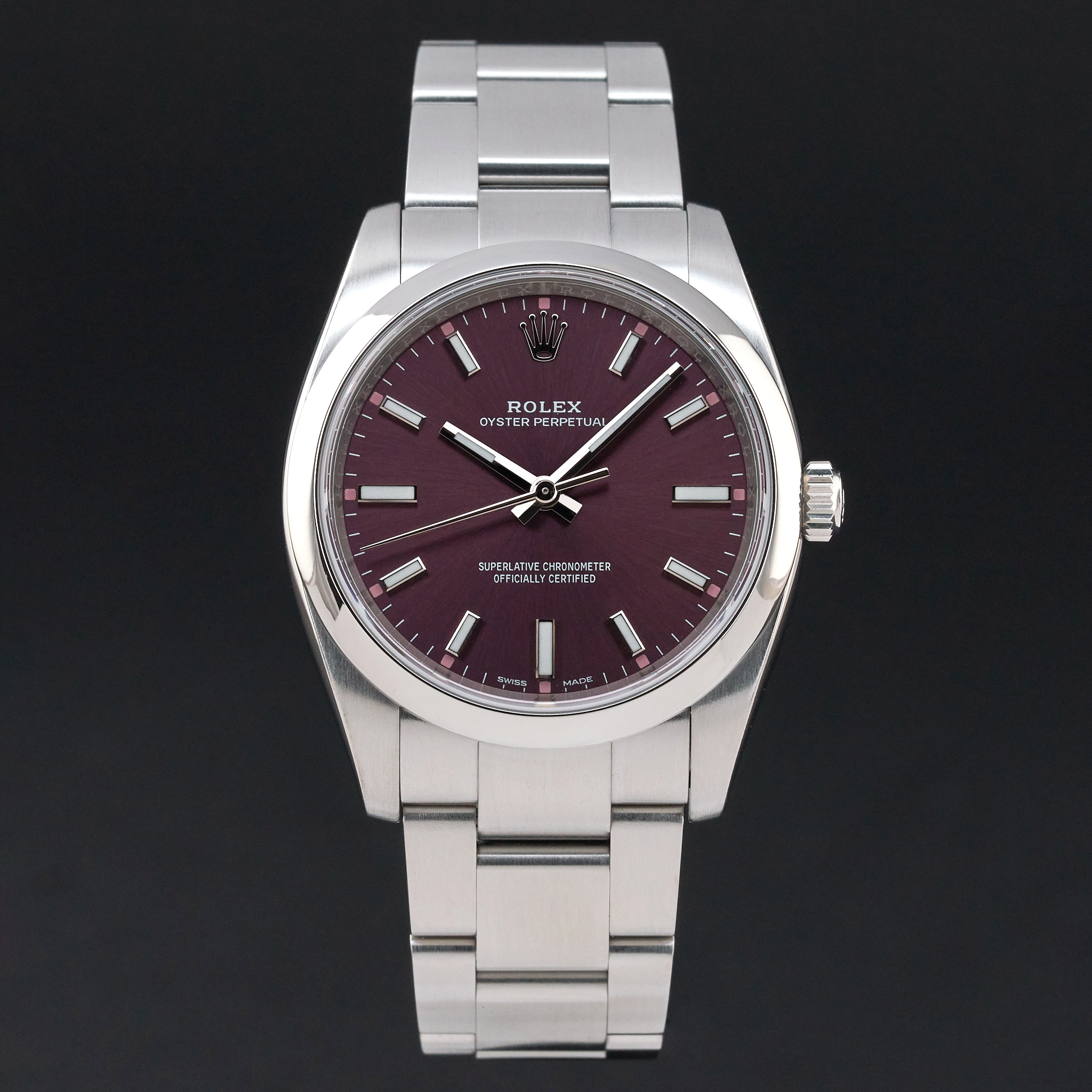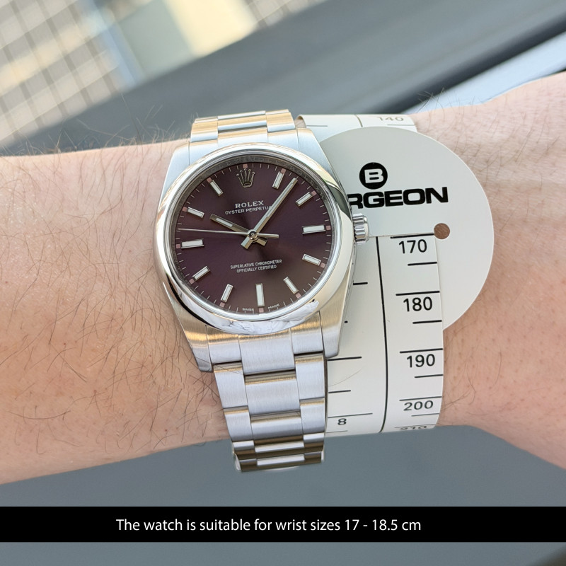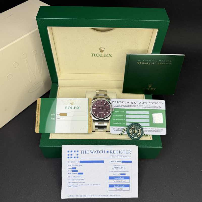 This Rolex Oyster Perpetual 114200 features a Red grape dial and is crafted from stainless steel, with a production year of 2017.