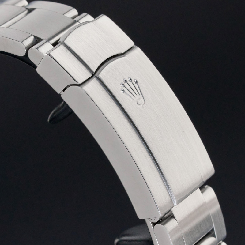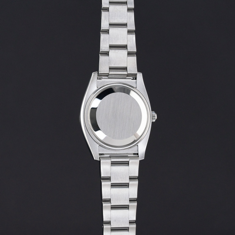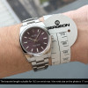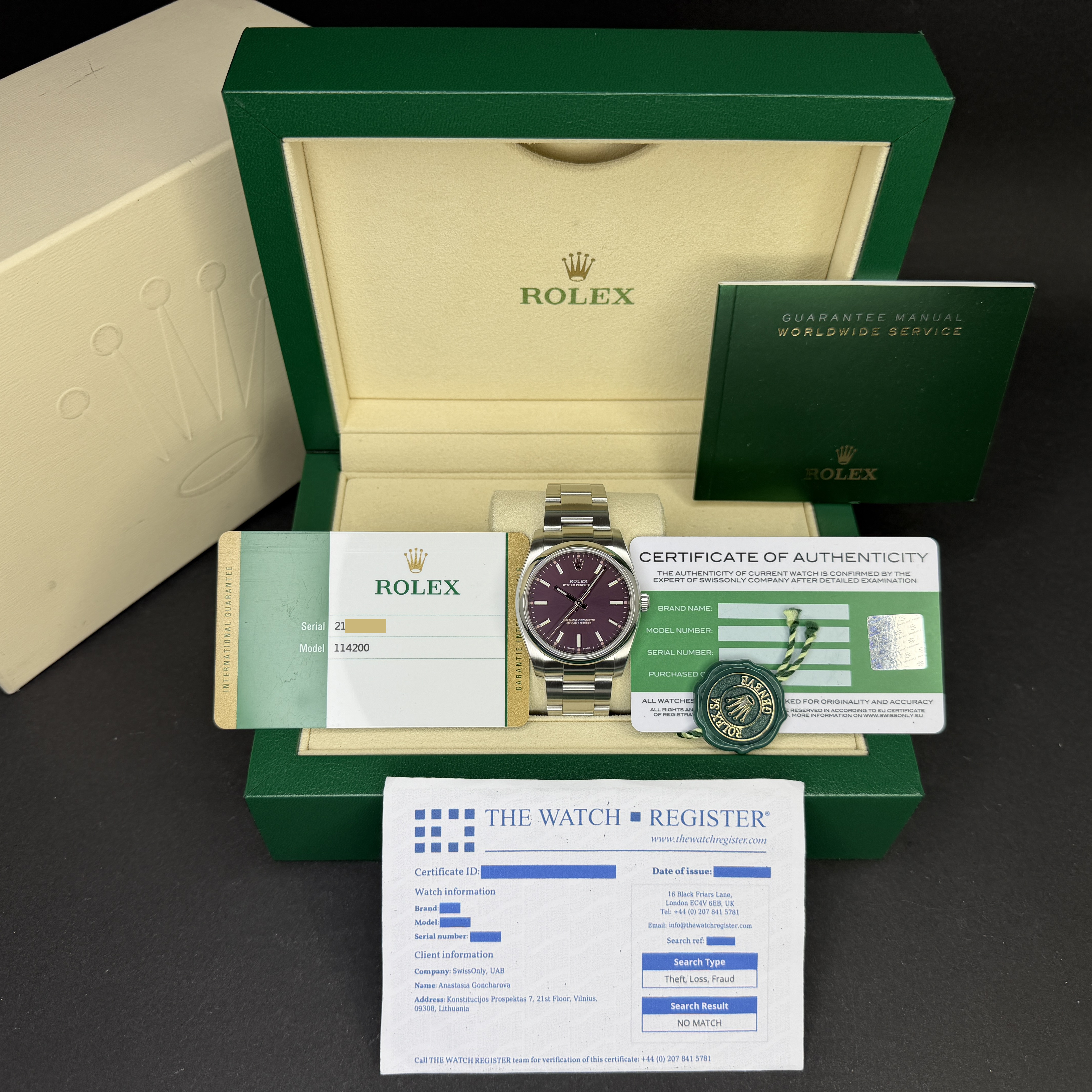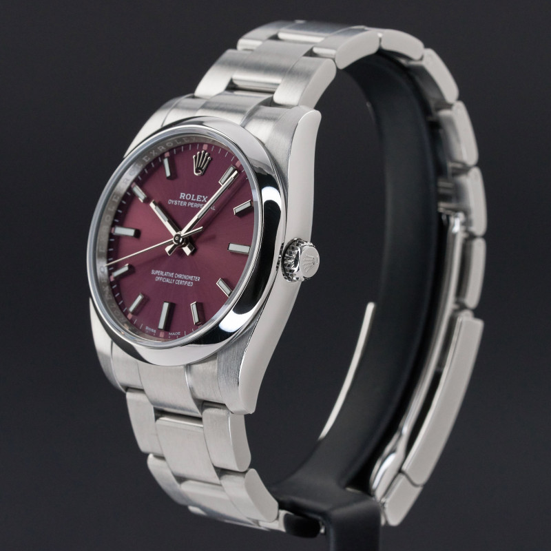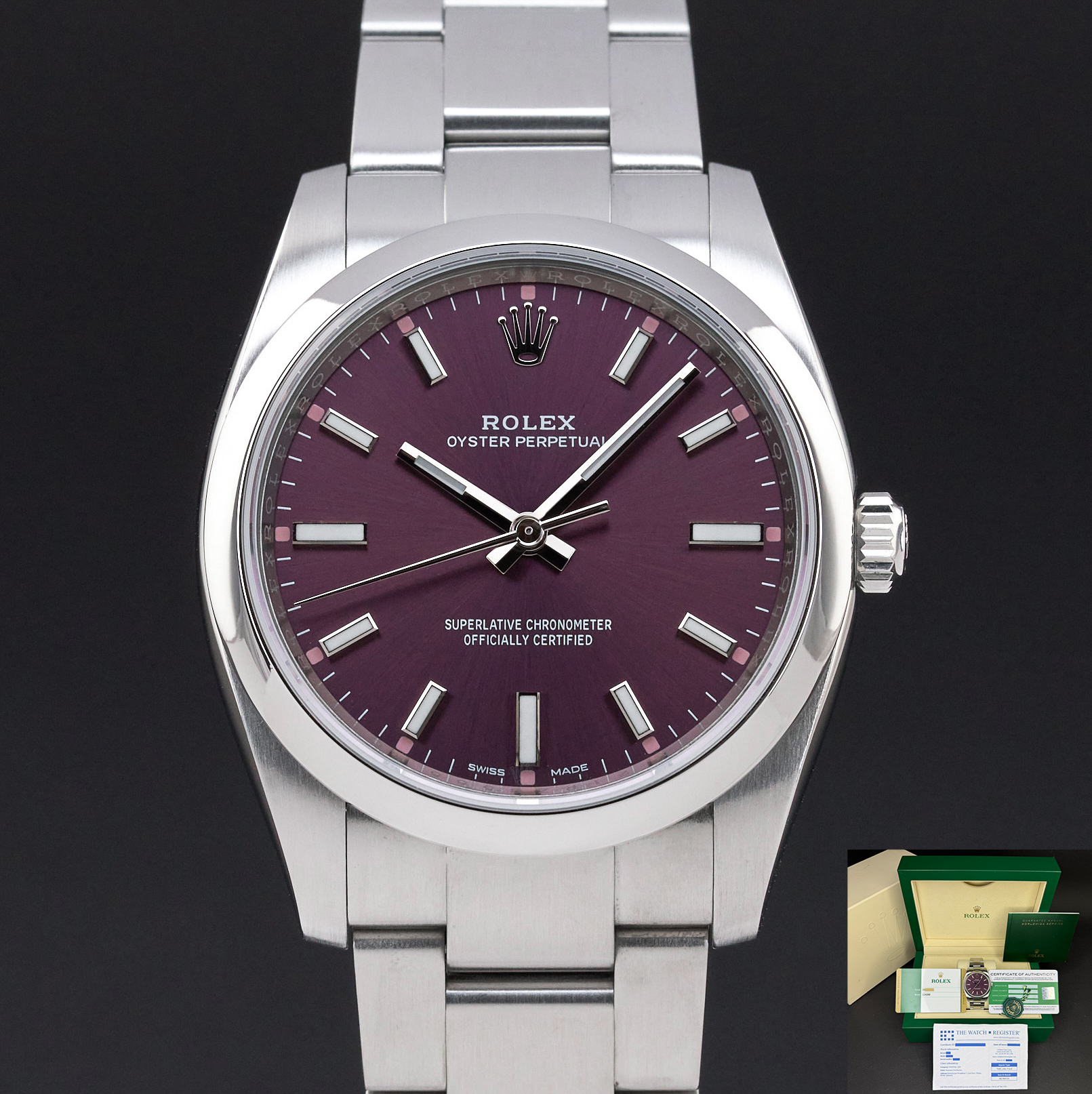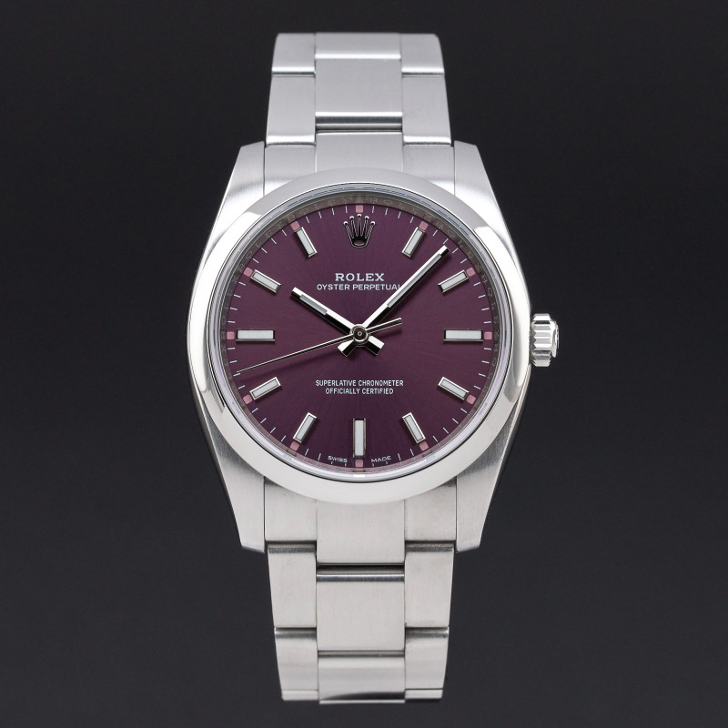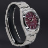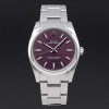 This Rolex Oyster Perpetual 114200 features a Red grape dial and is crafted from stainless steel.