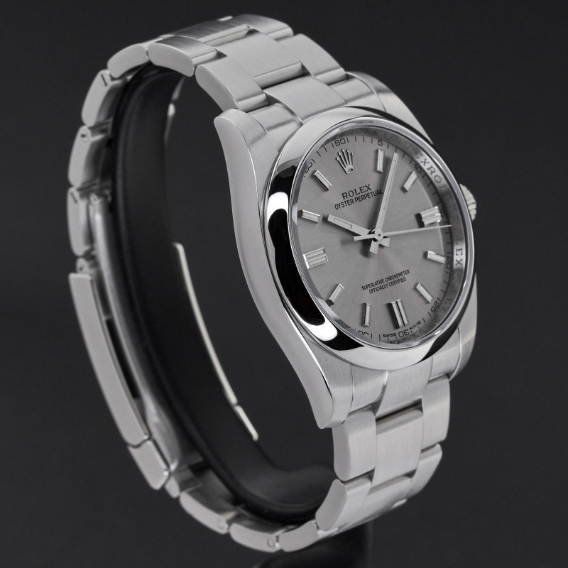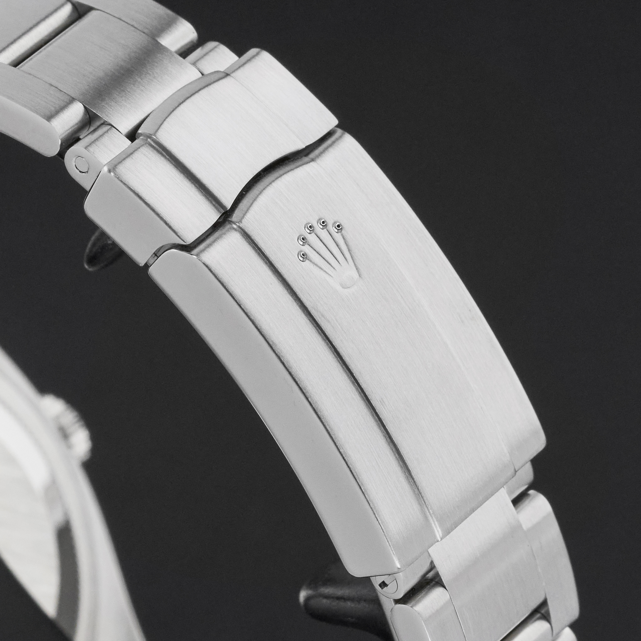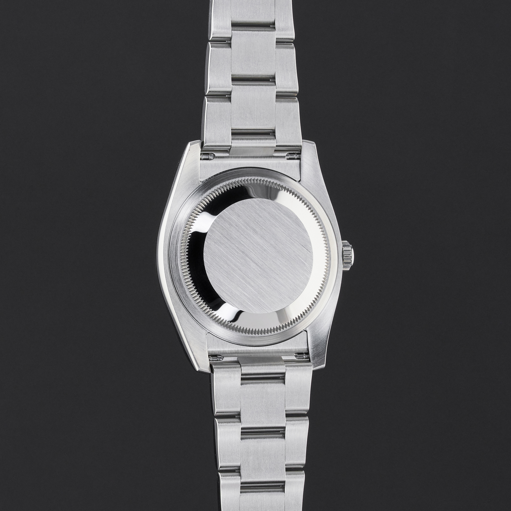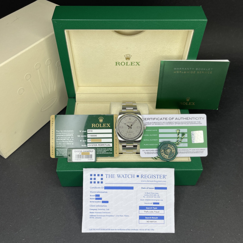 This Rolex Oyster Perpetual 116000 features a Grey dial and is crafted from stainless steel, with a production year of 2013.