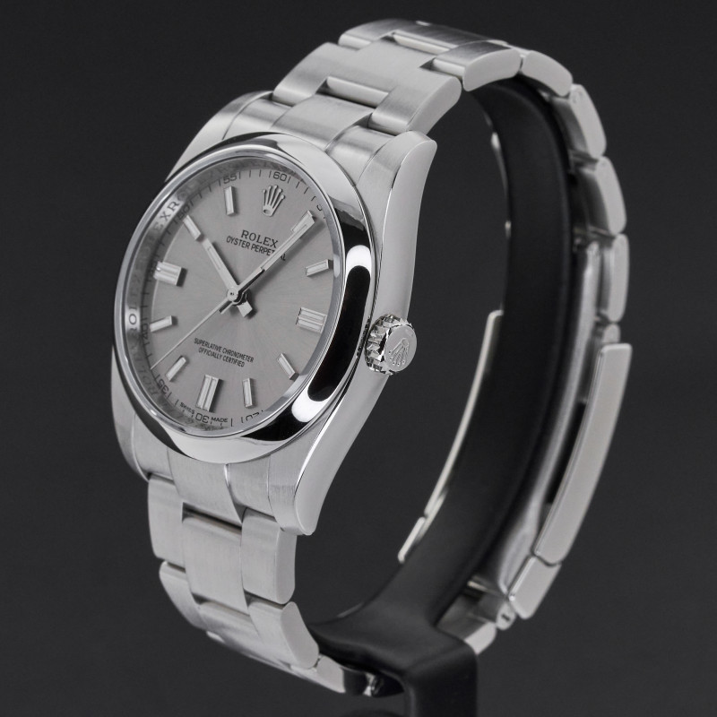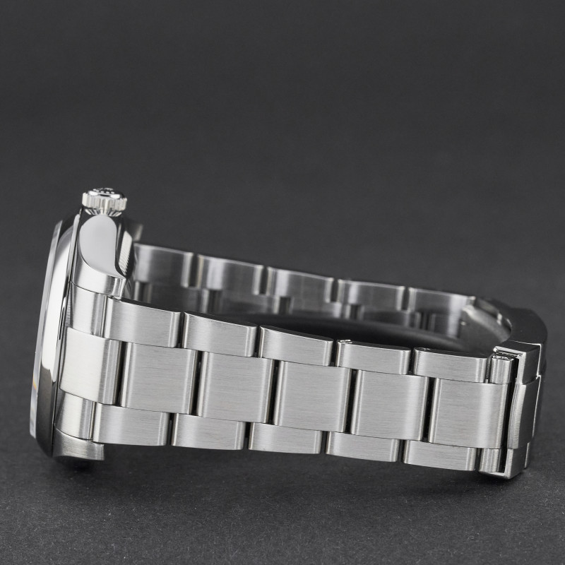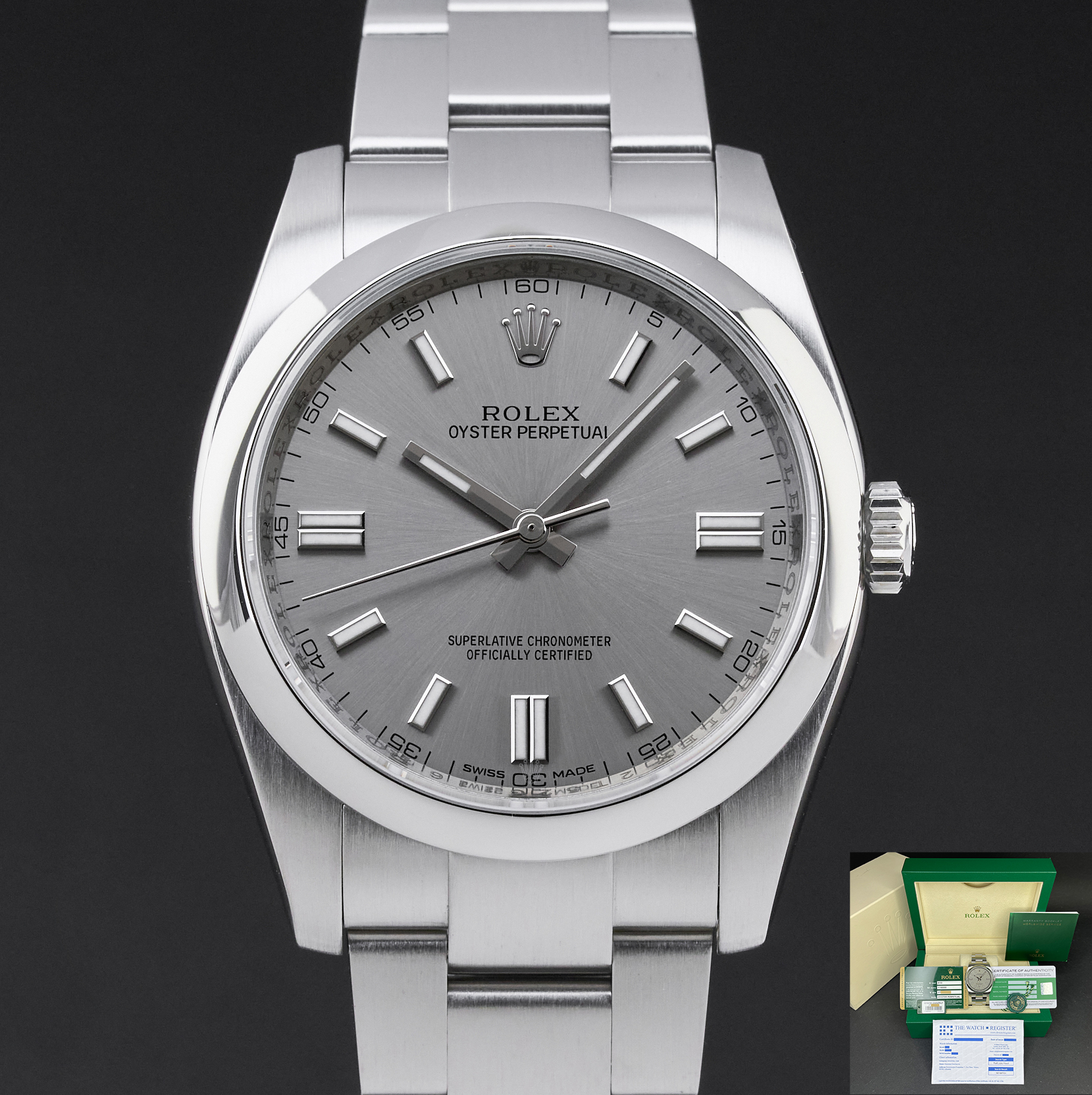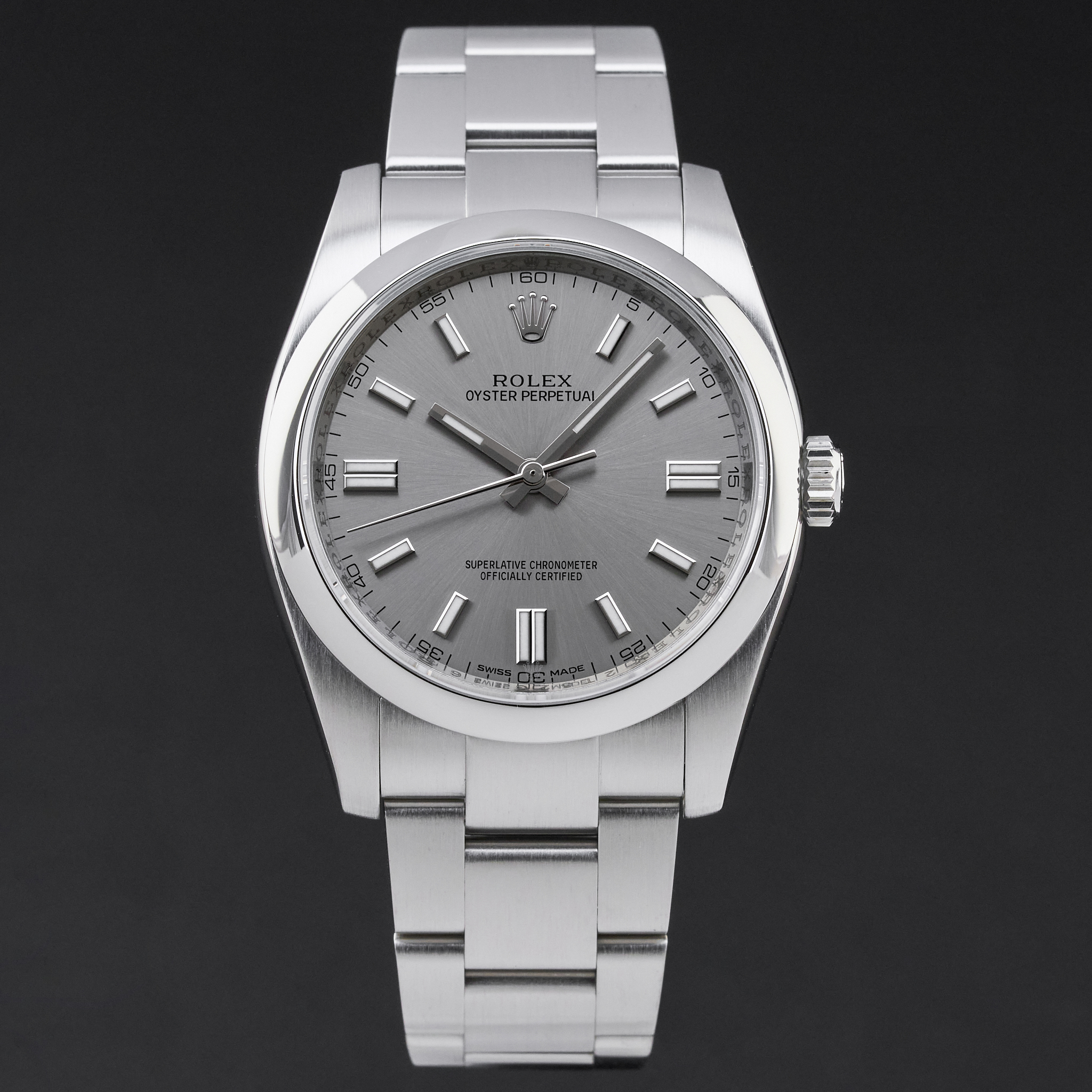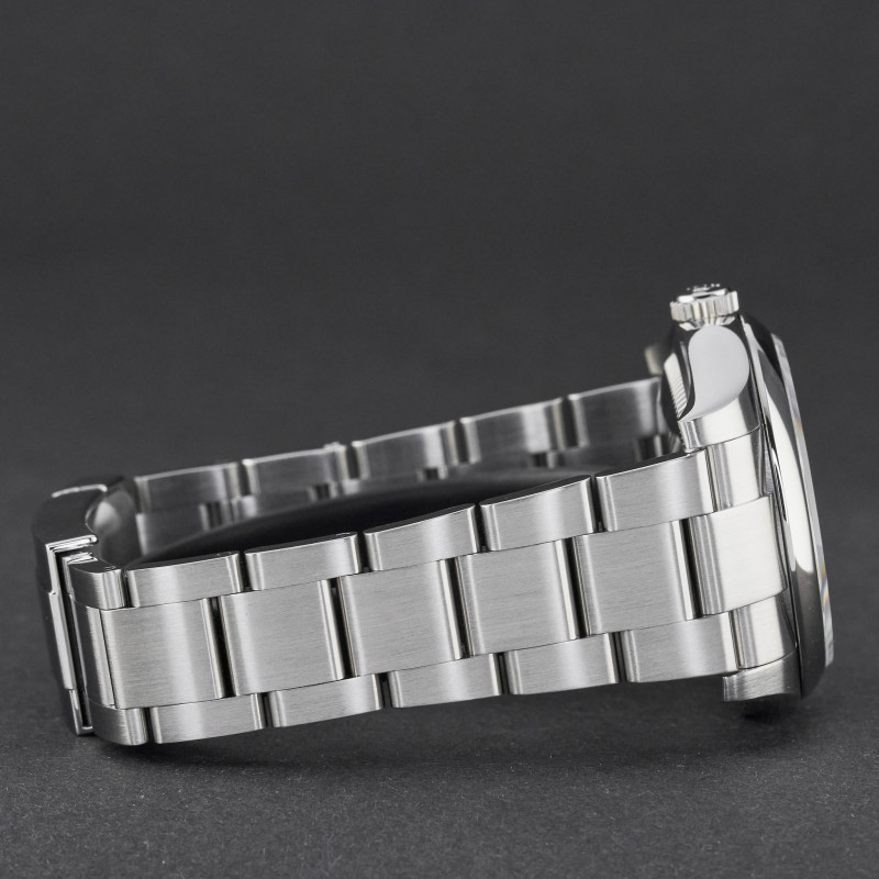 This Rolex Oyster Perpetual 116000 features a Grey dial and is crafted from stainless steel, with a production year of 2013.