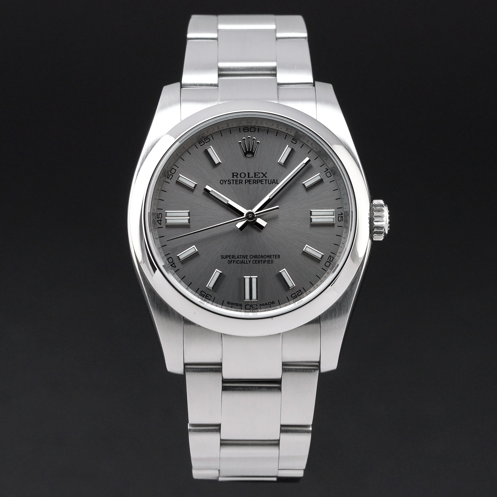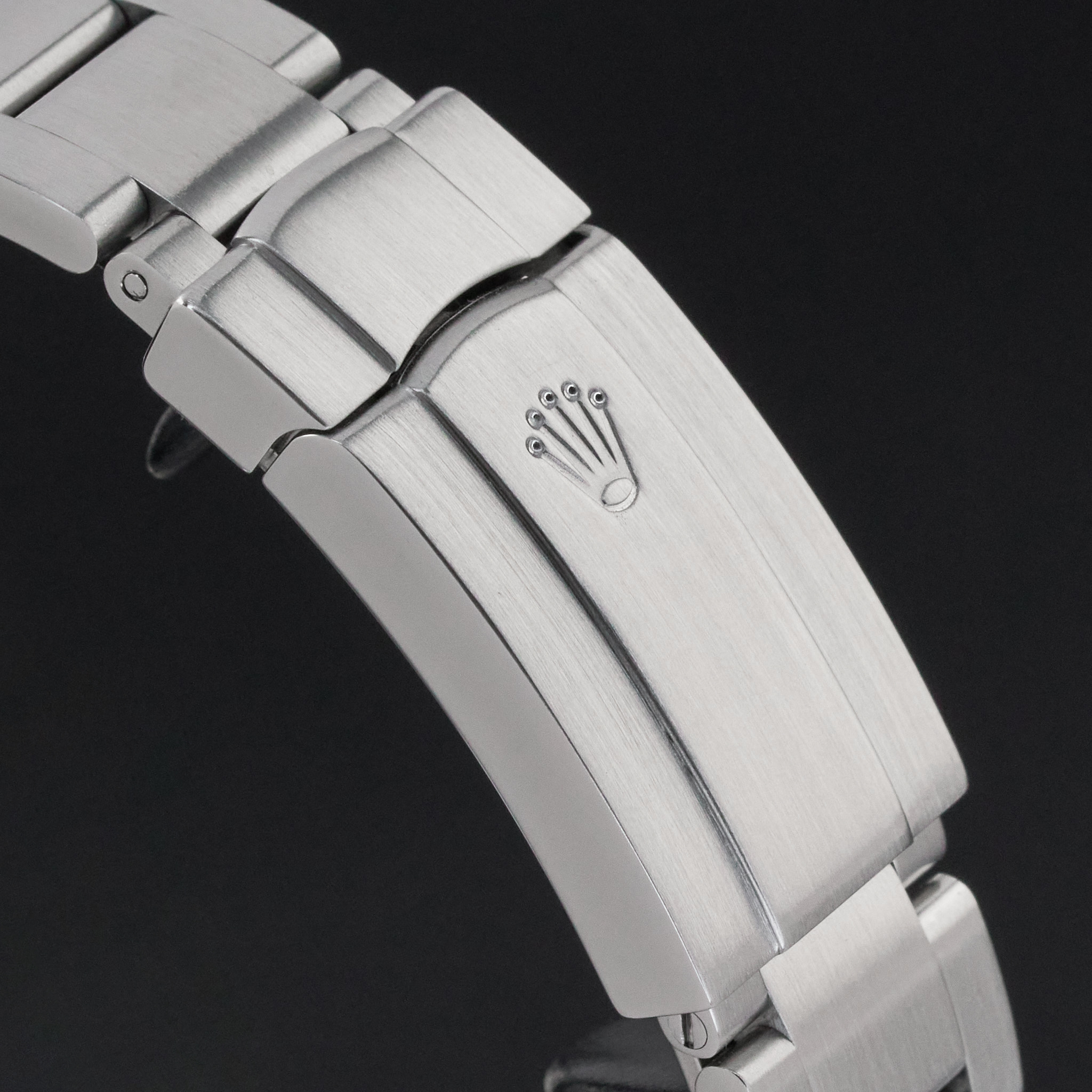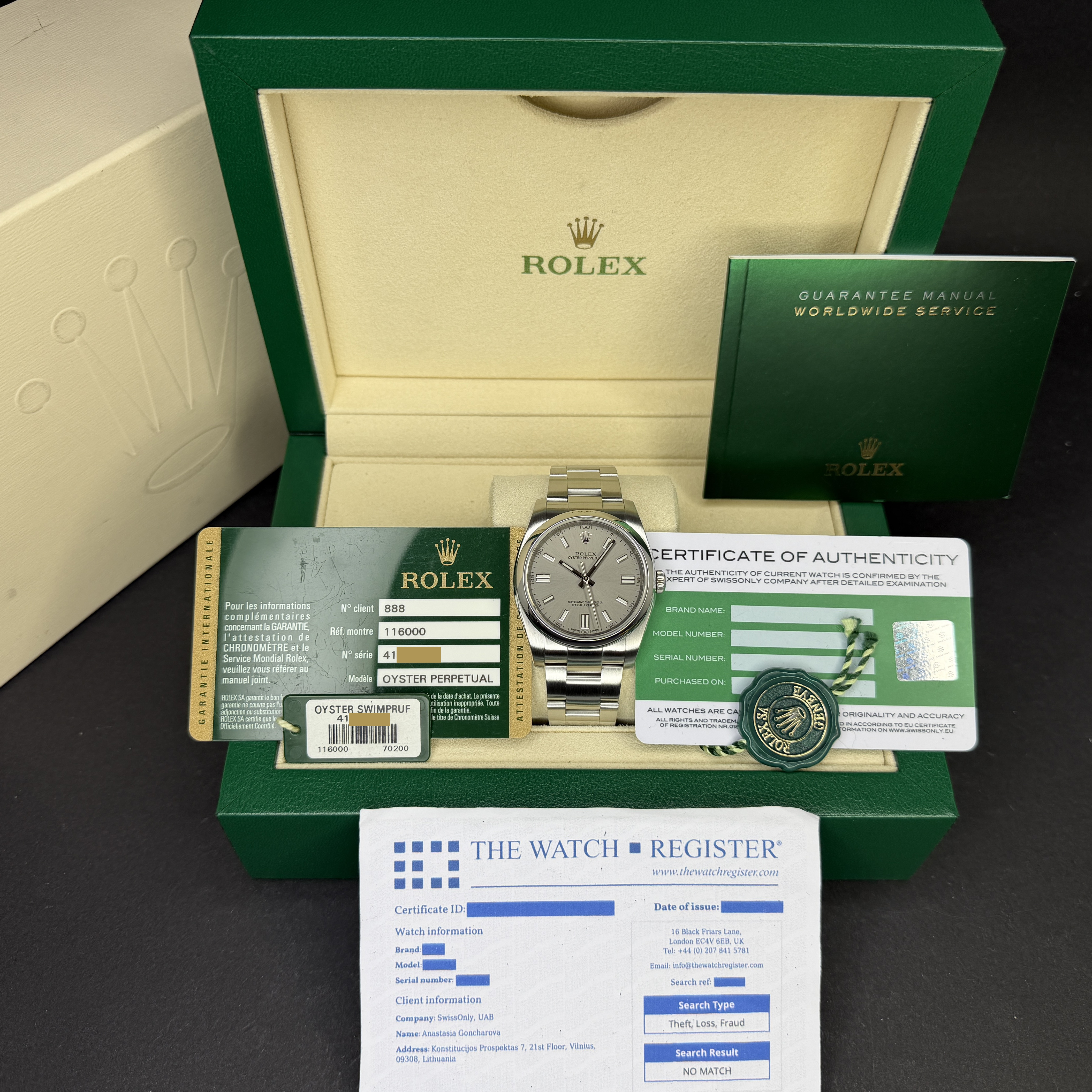 This Rolex Oyster Perpetual 116000 features a Grey dial and is crafted from stainless steel, with a production year of 2015.