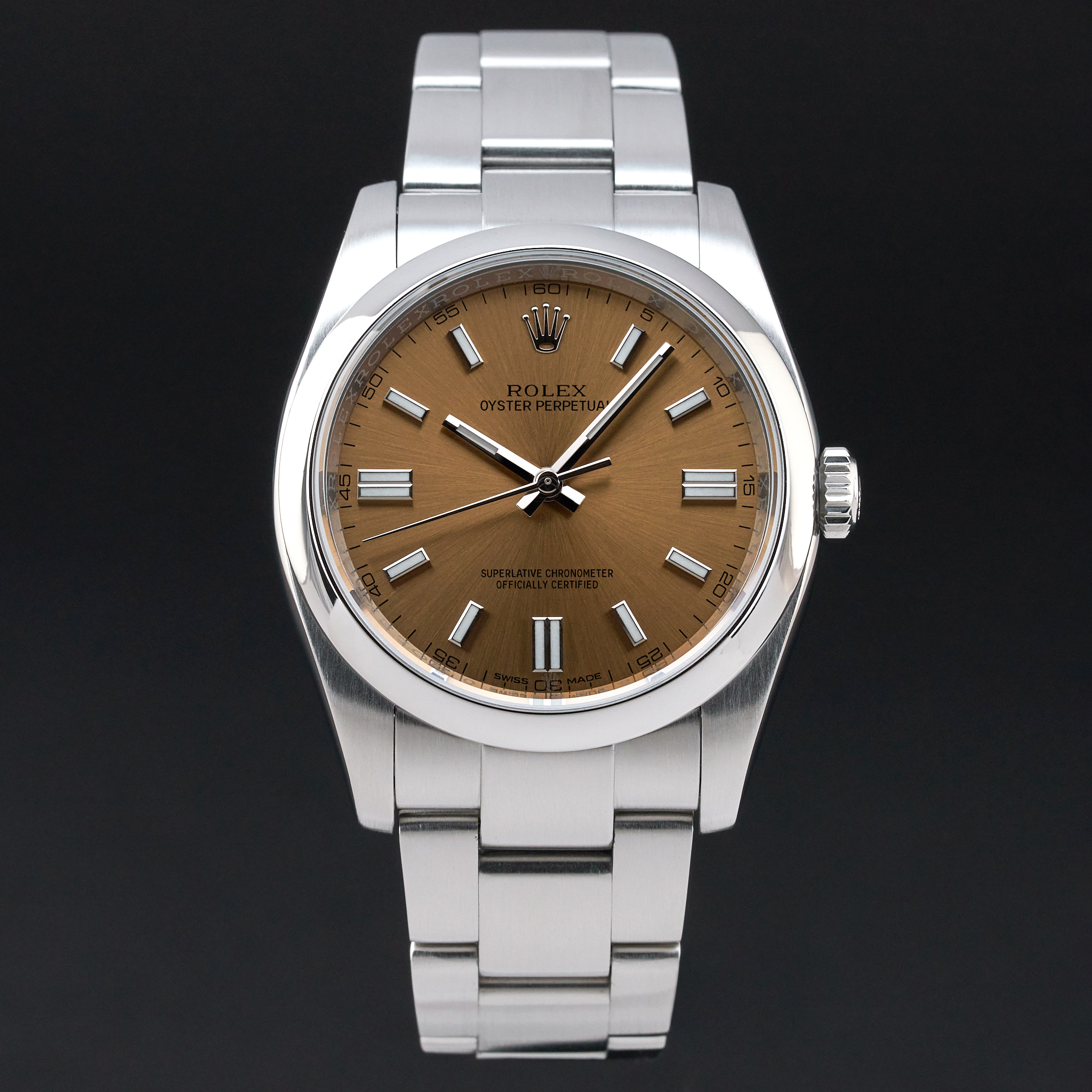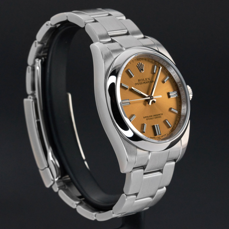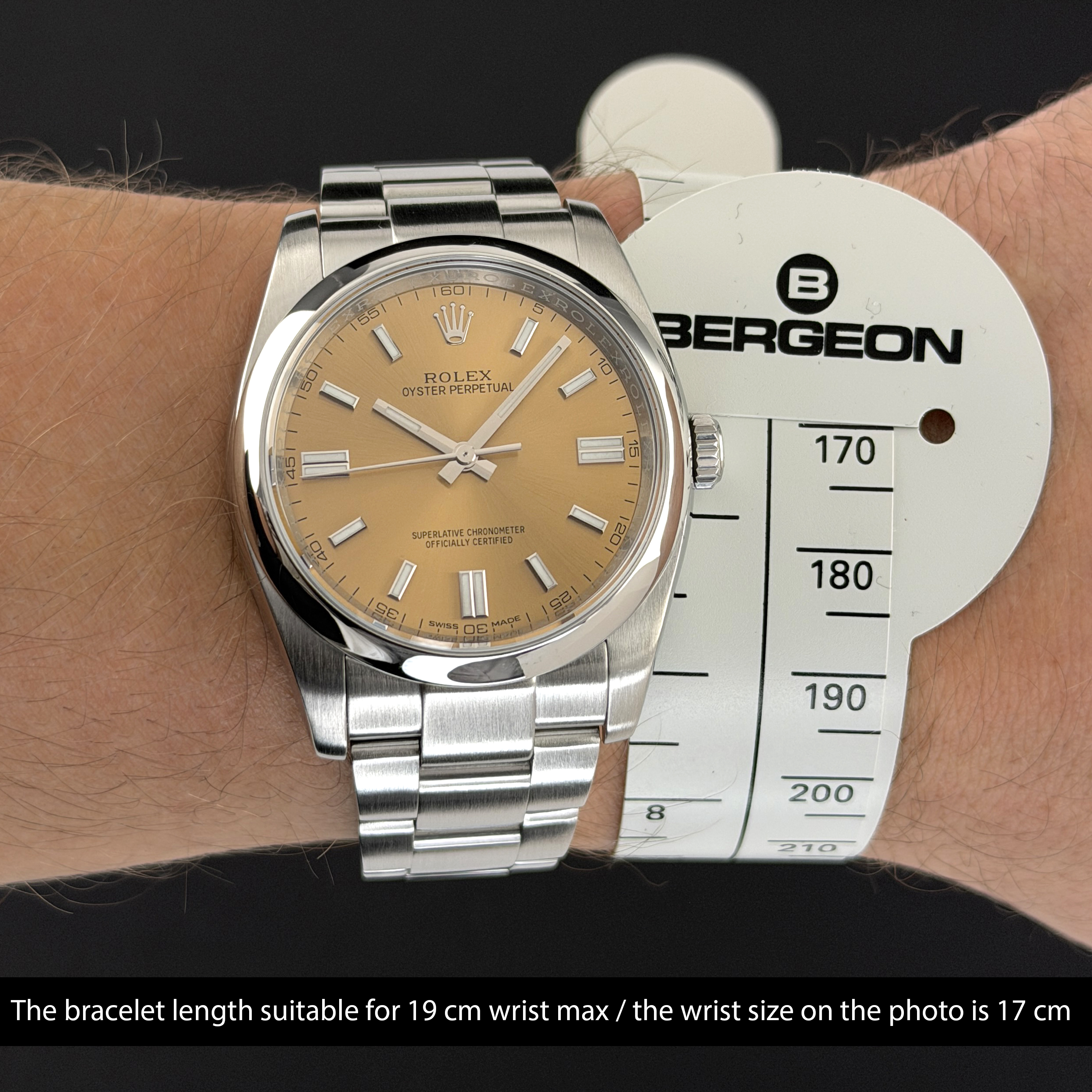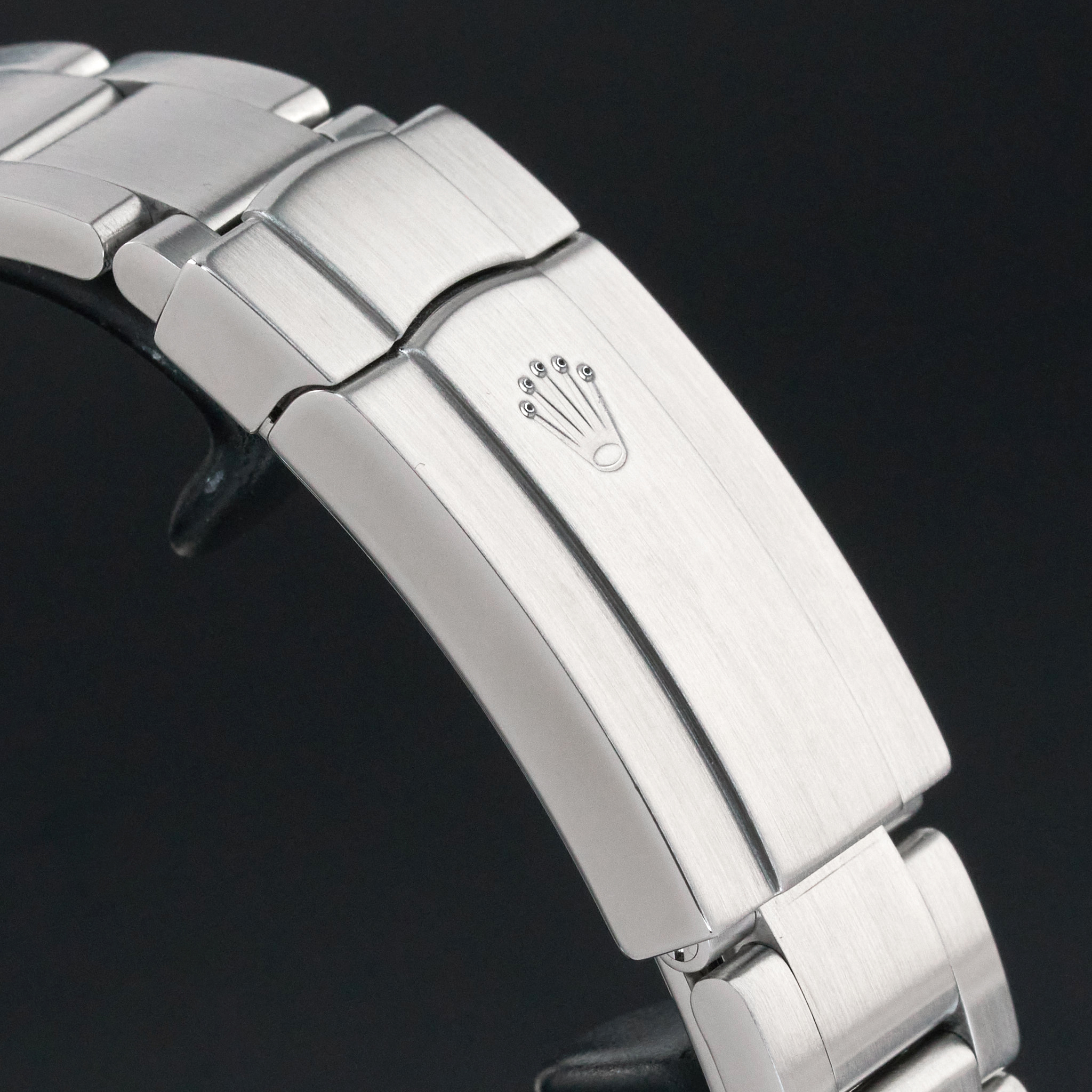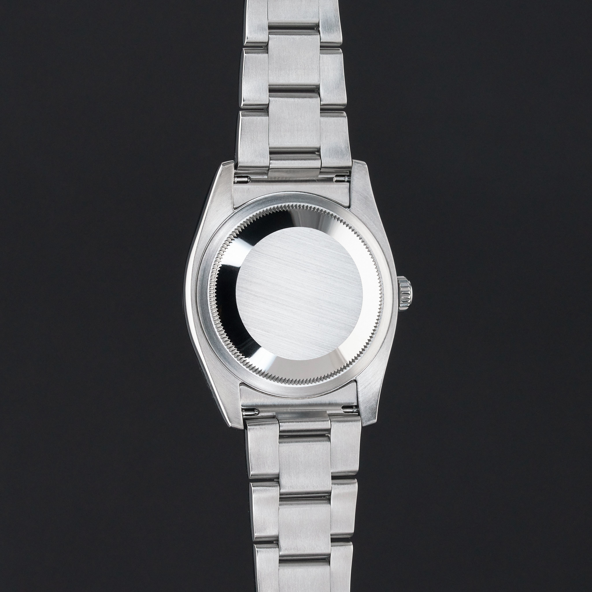 This Rolex Oyster Perpetual 116000 features a White grape dial and is crafted from stainless steel, with a production year of 2017.