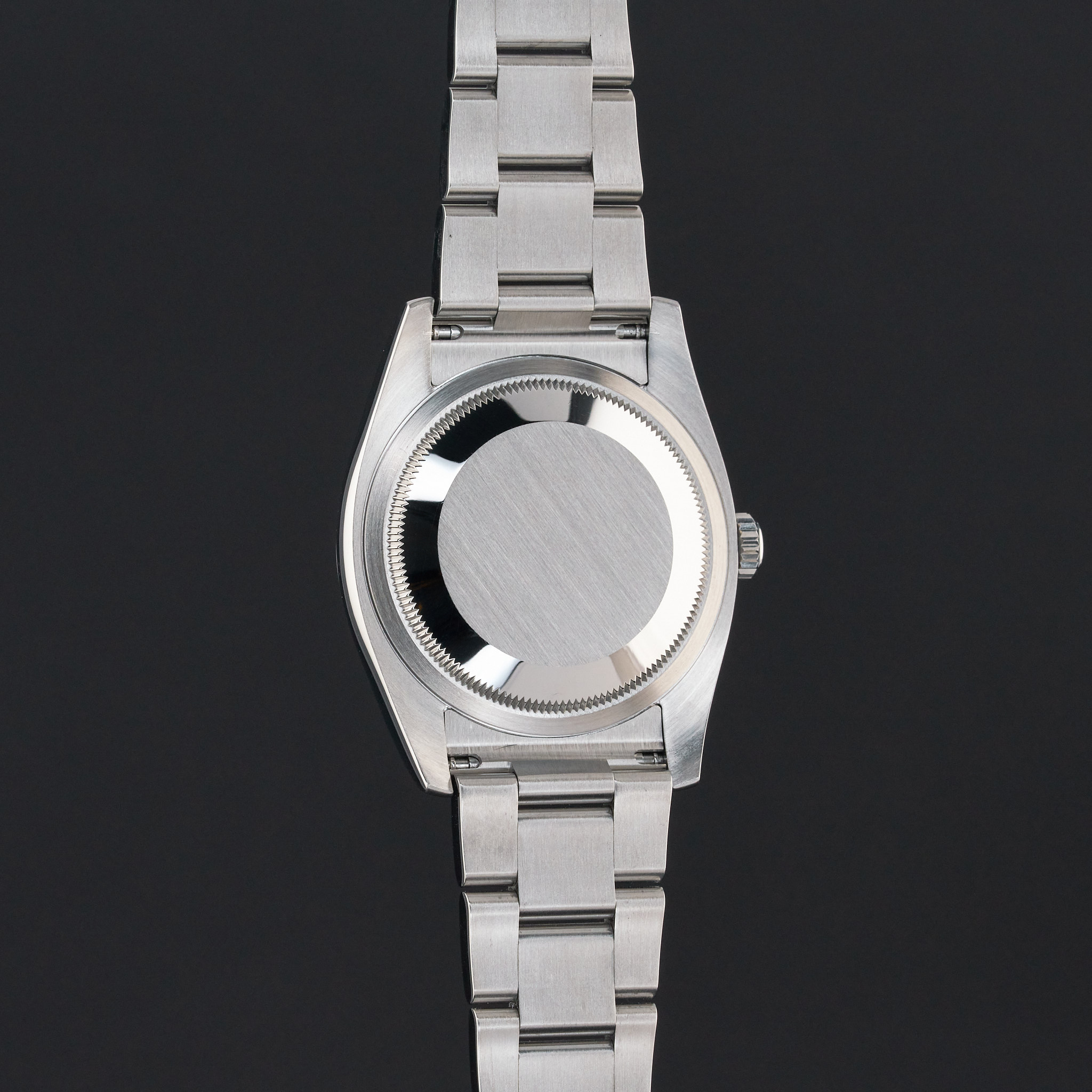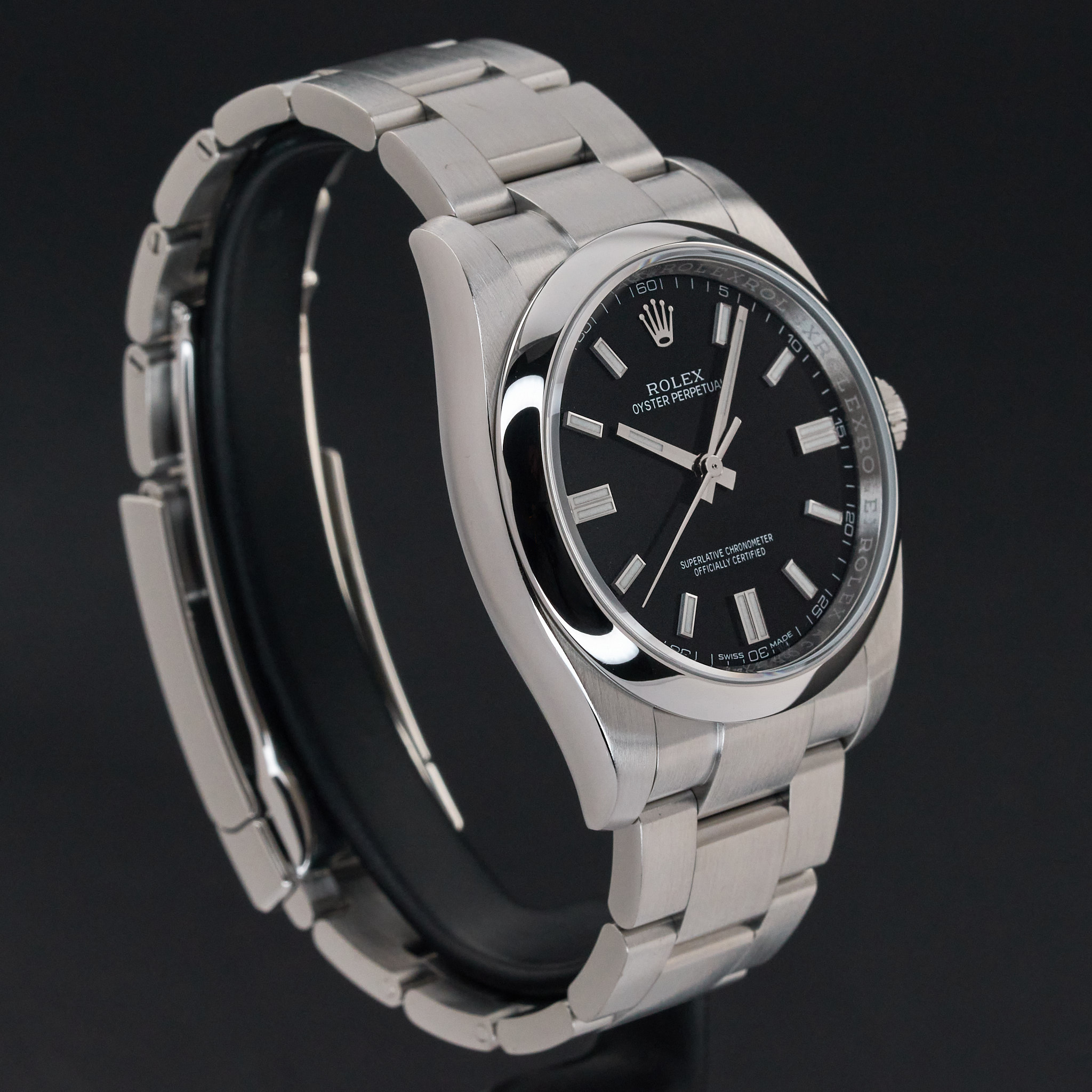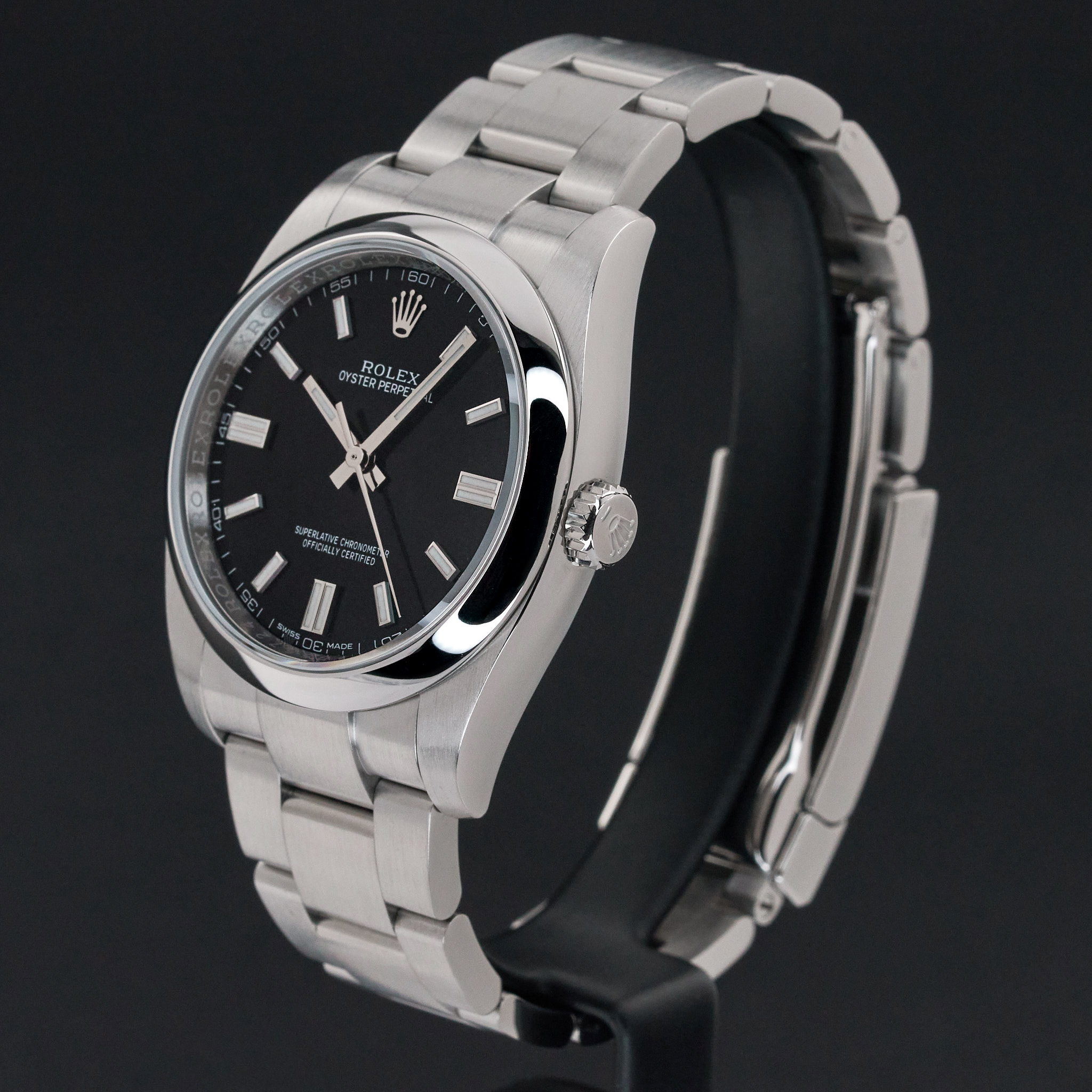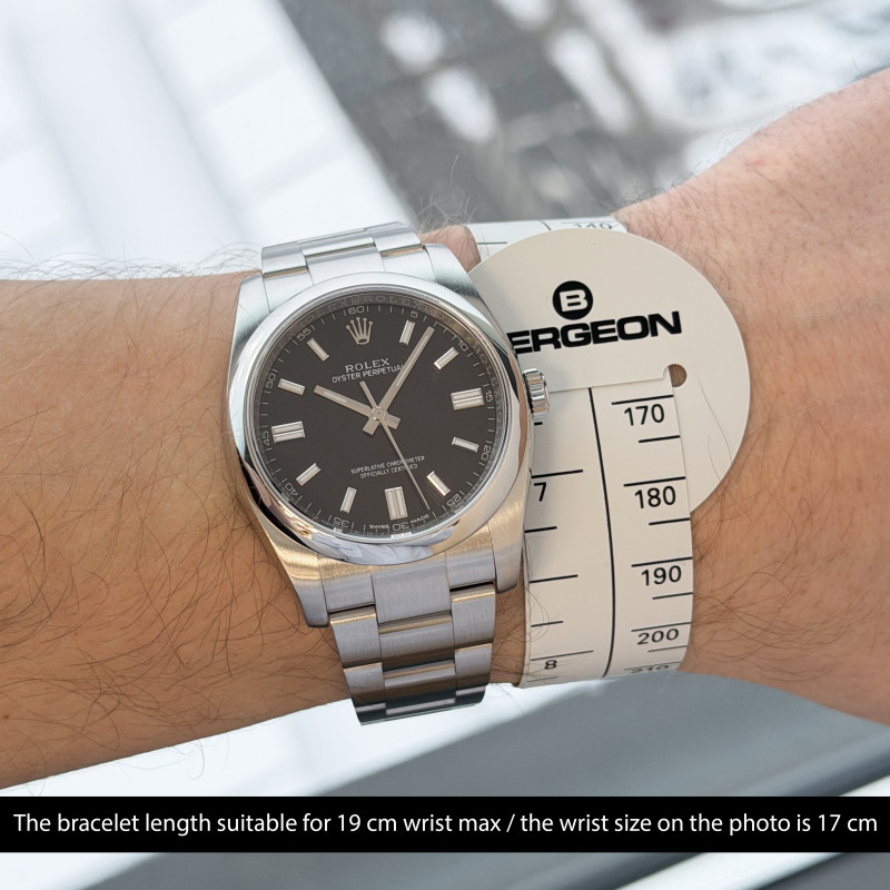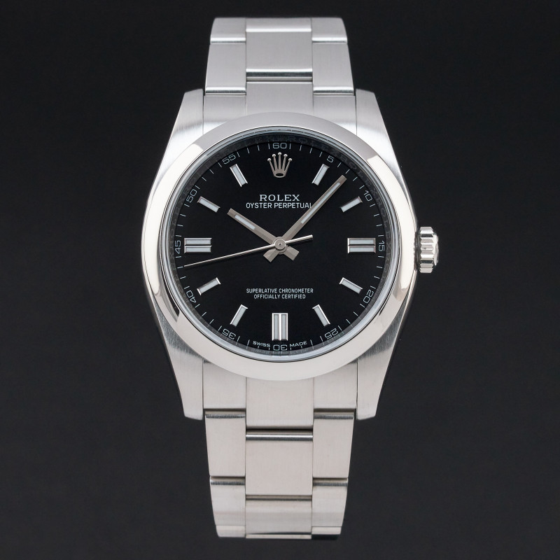 This Rolex Oyster Perpetual 116000 features a Black dial and is crafted from stainless steel, with a production year of 2018.