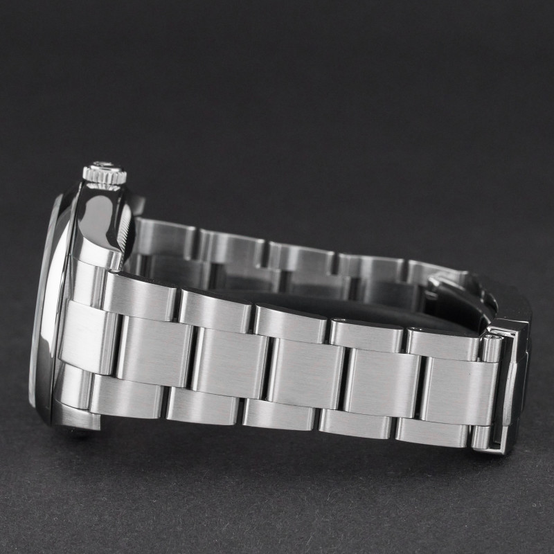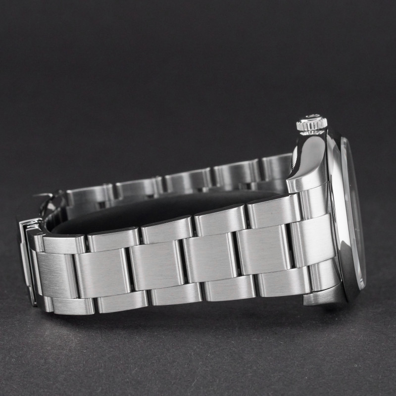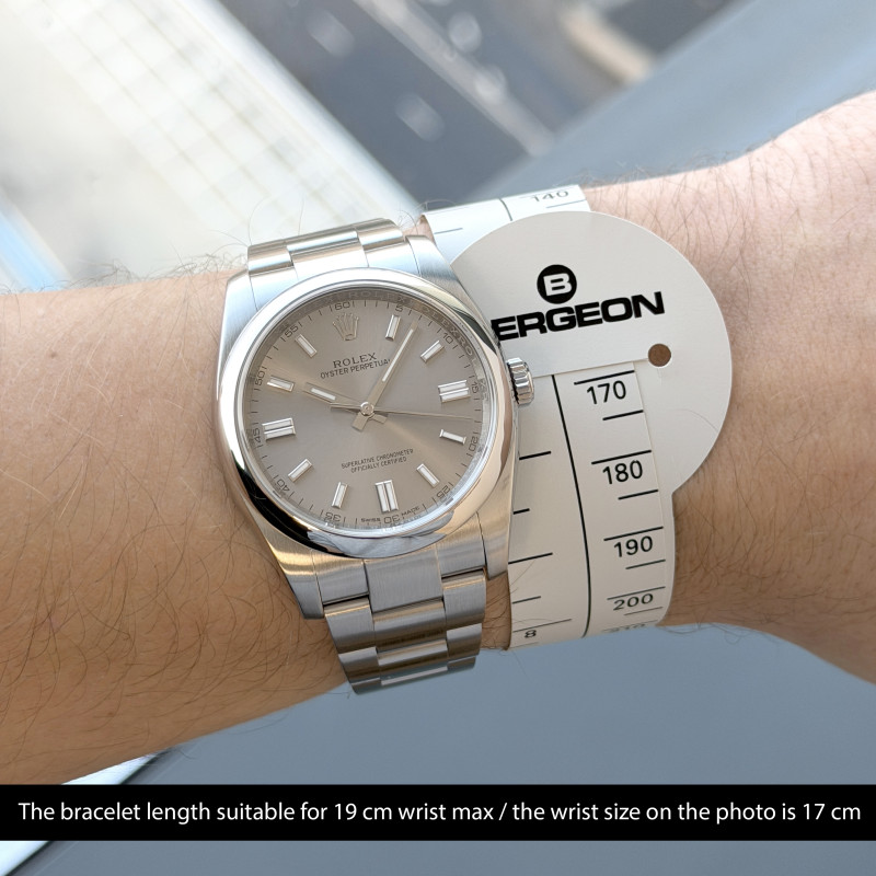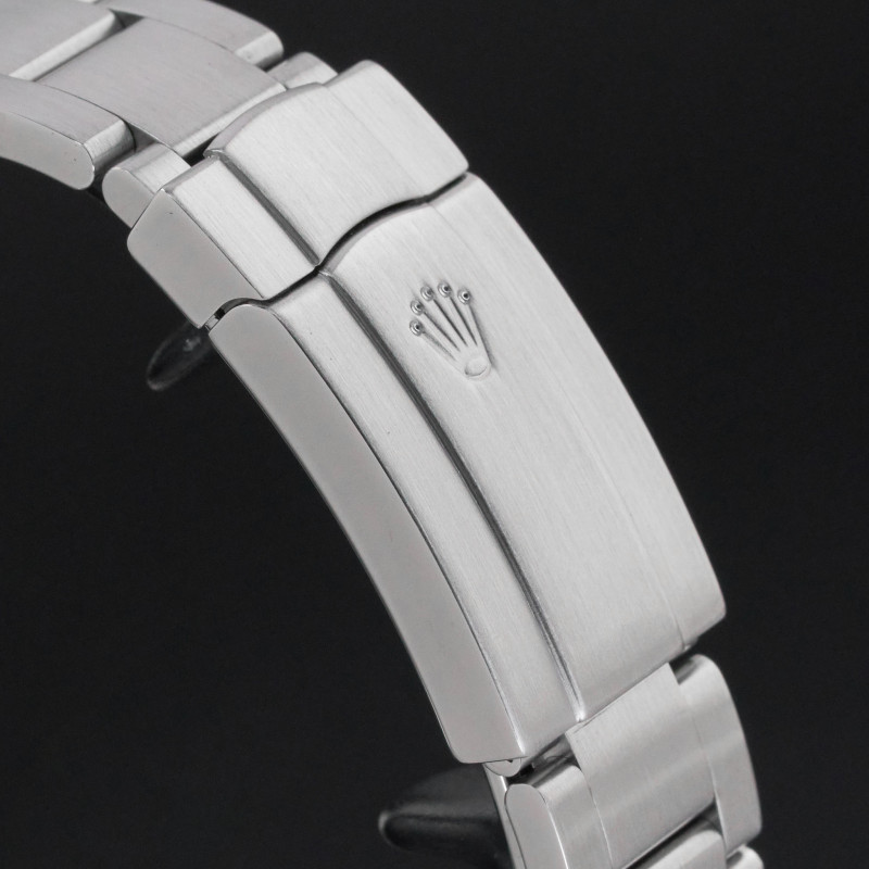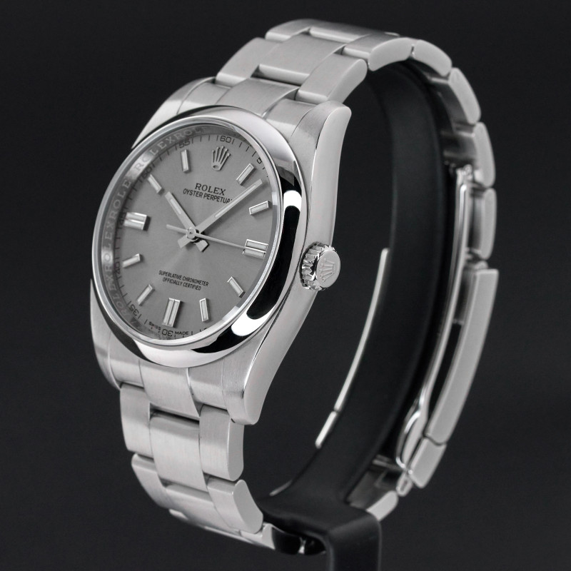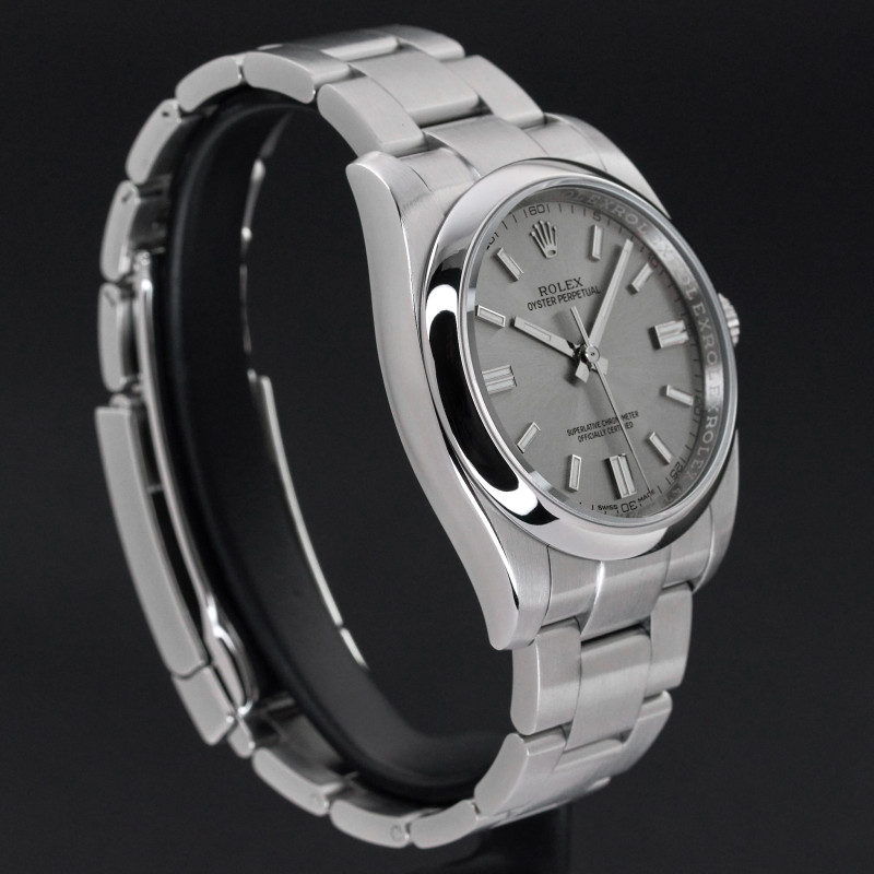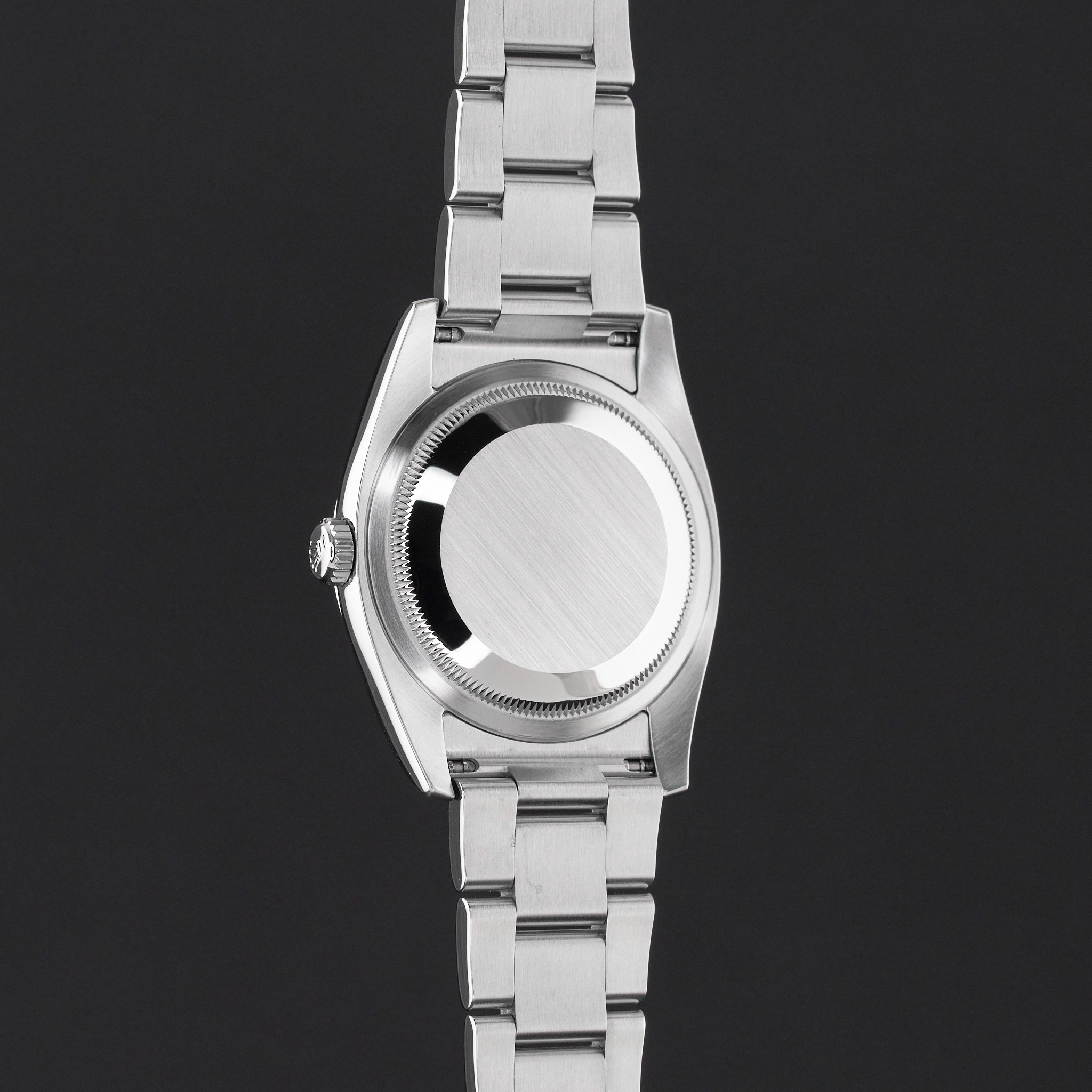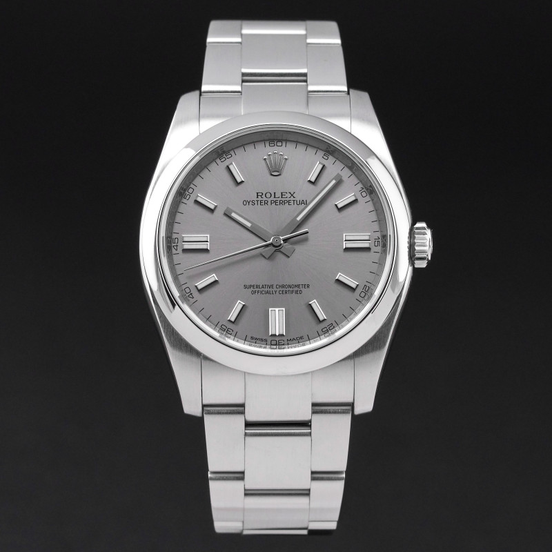This Rolex Oyster Perpetual 116000 features a Grey dial and is crafted from stainless steel, with a production year of 2018.