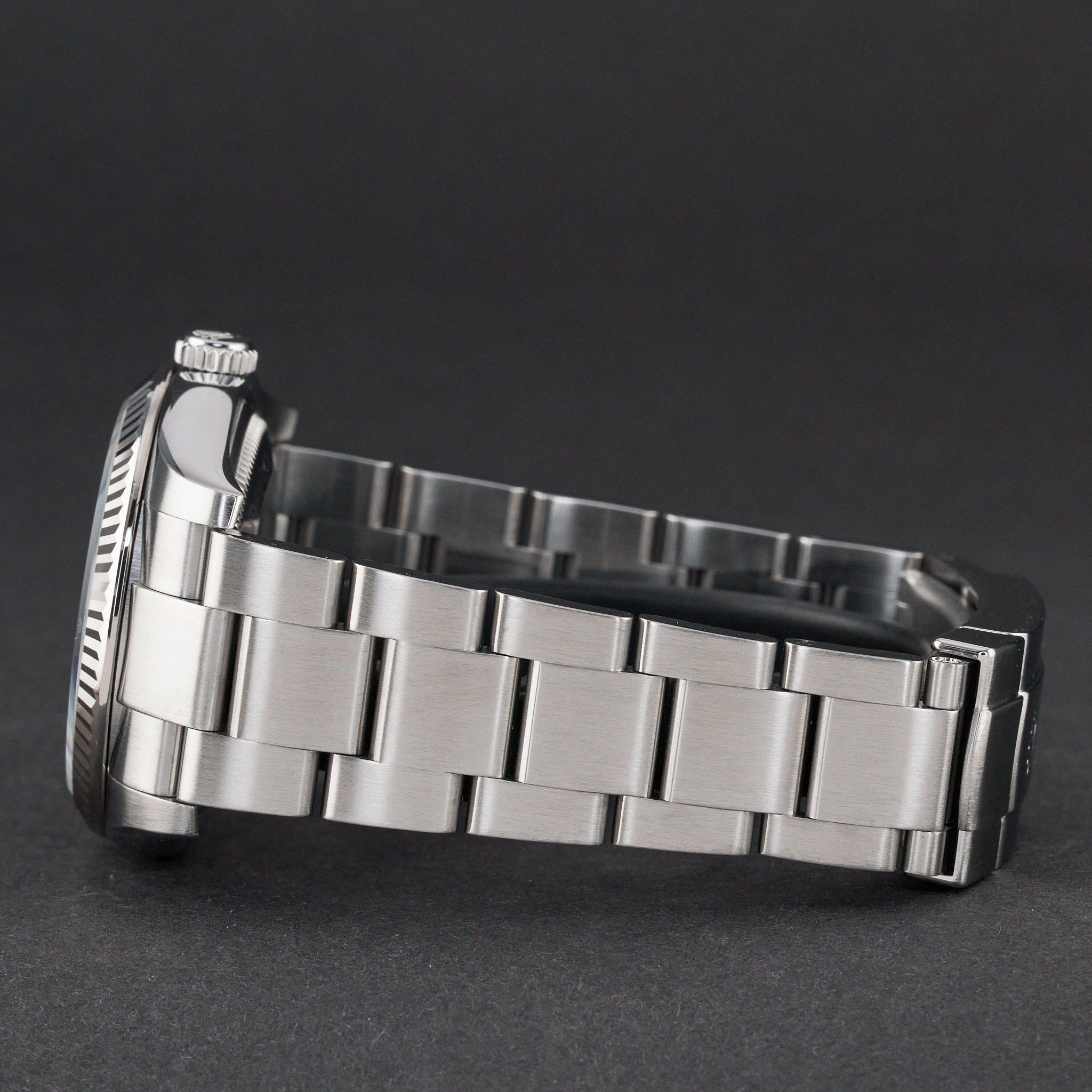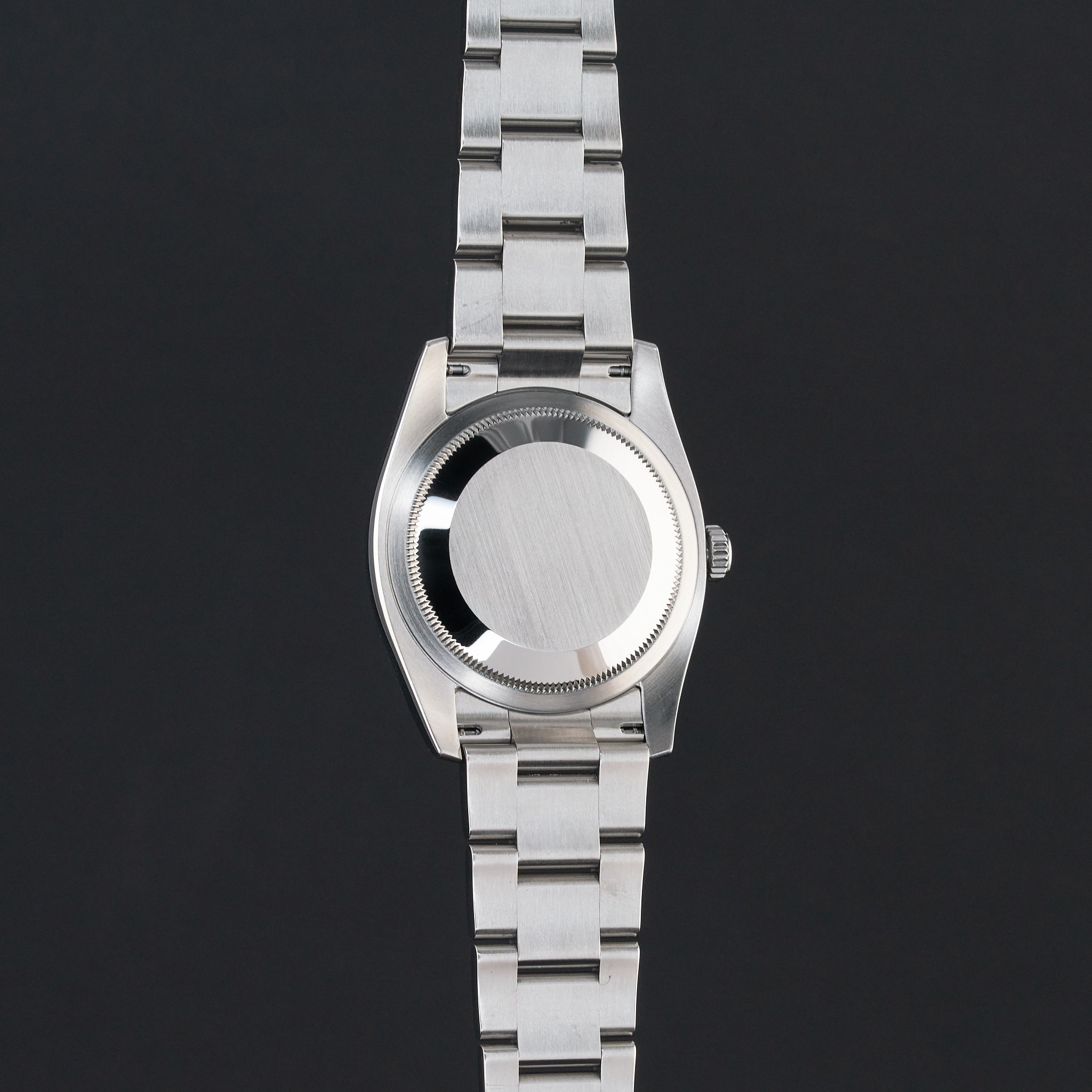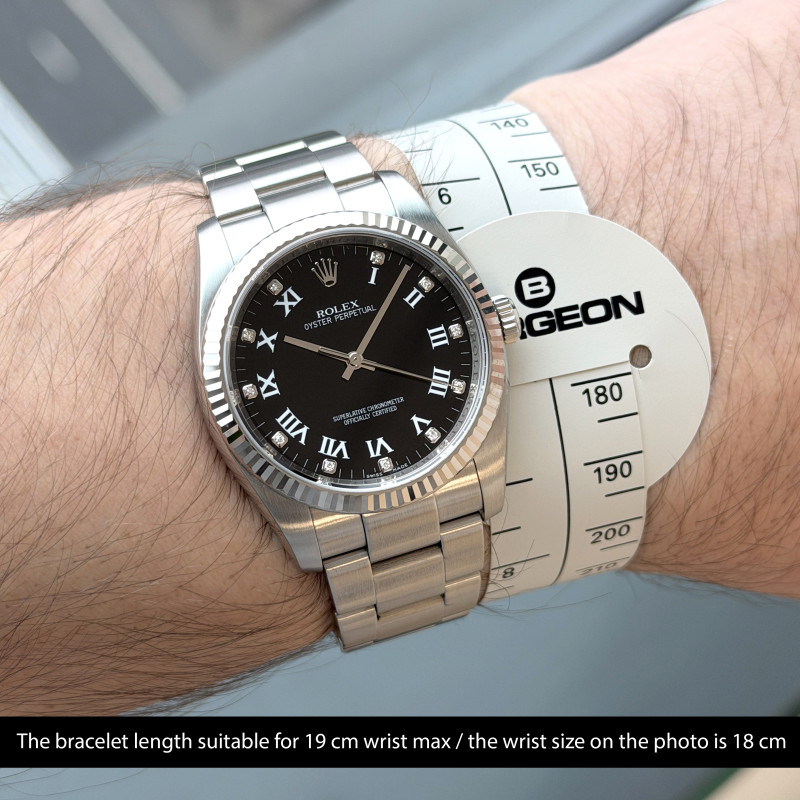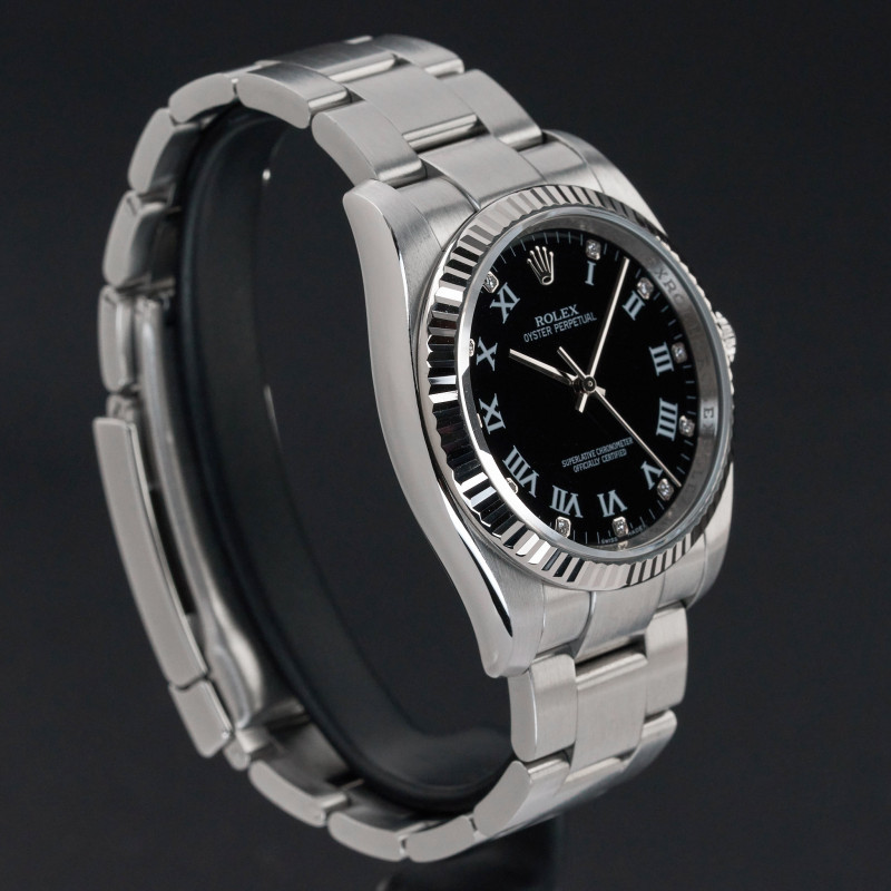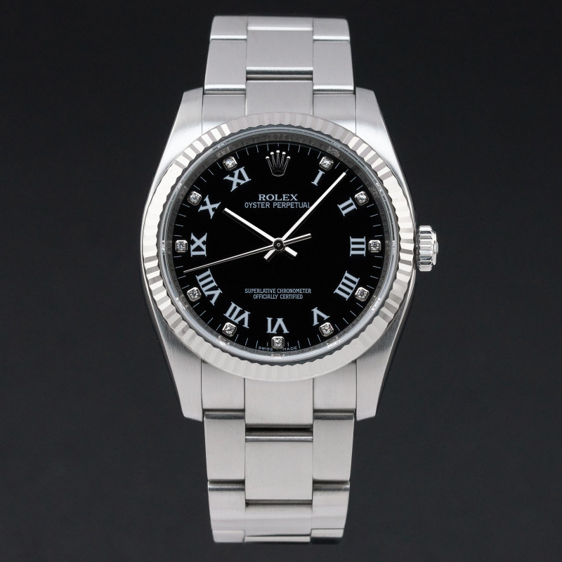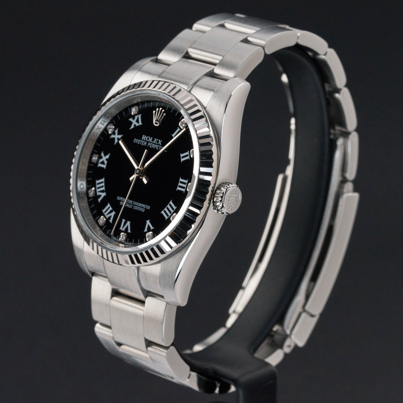 This Rolex Oyster Perpetual 116034 features a Black Roman diamond dial and is crafted from stainless steel, with a production year of 2008.