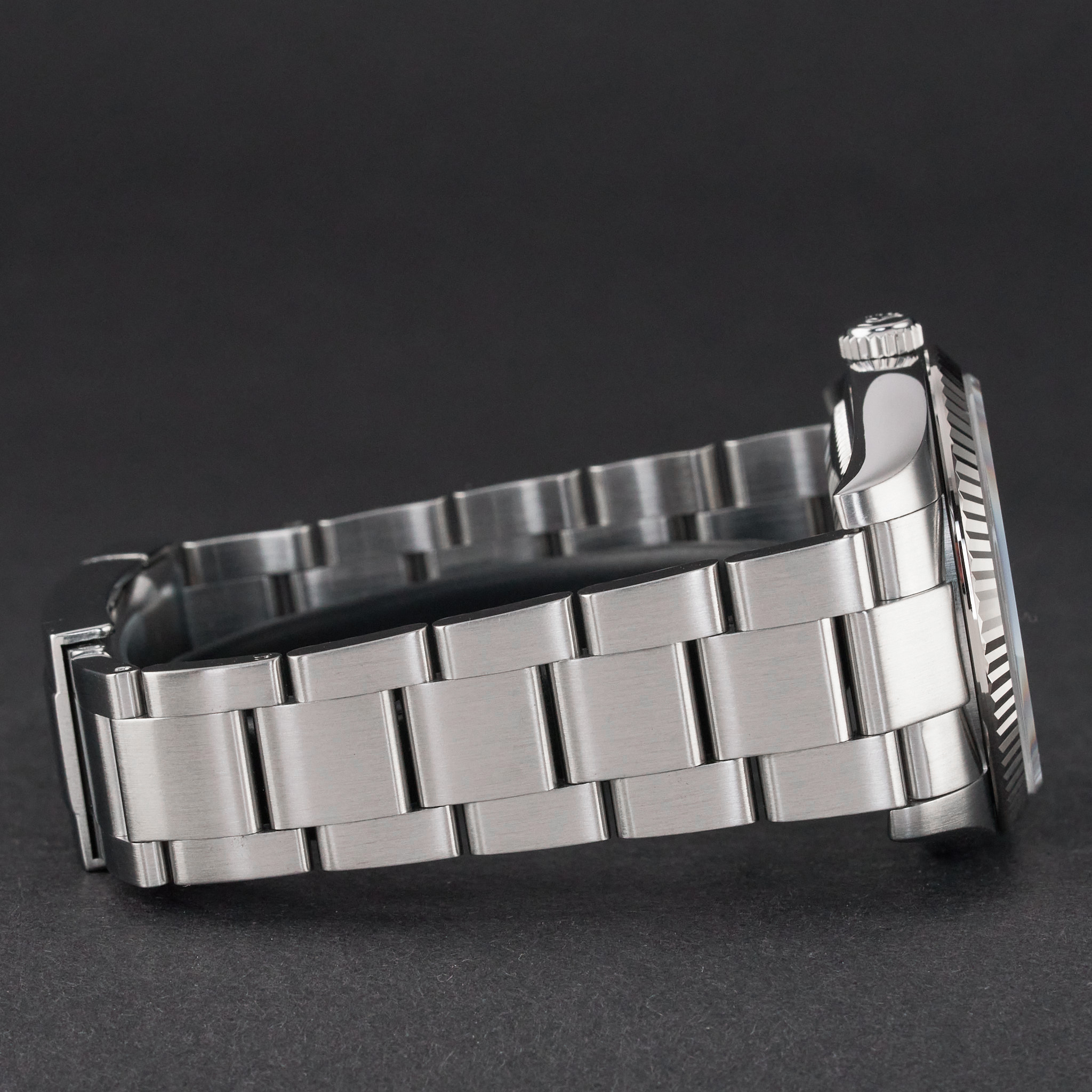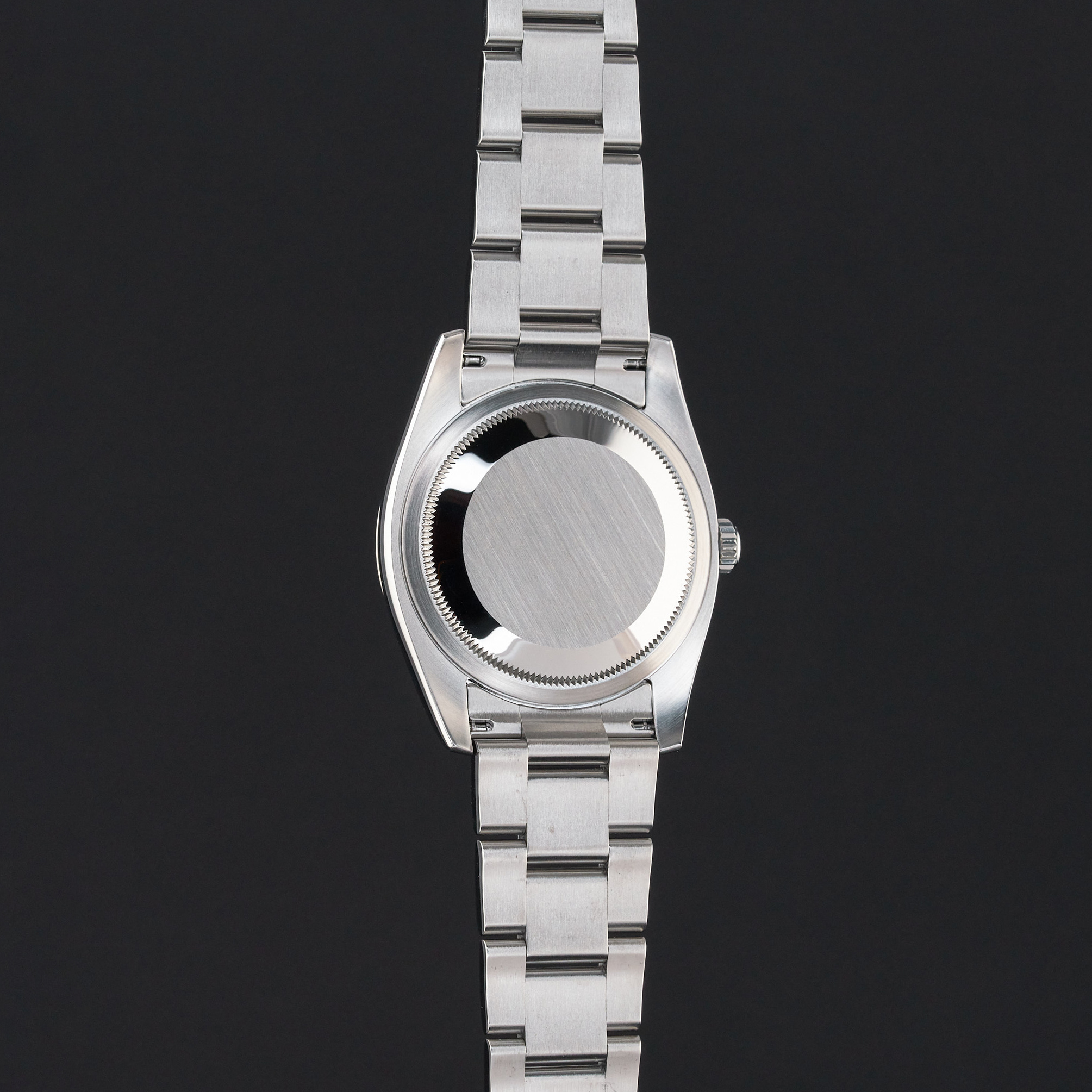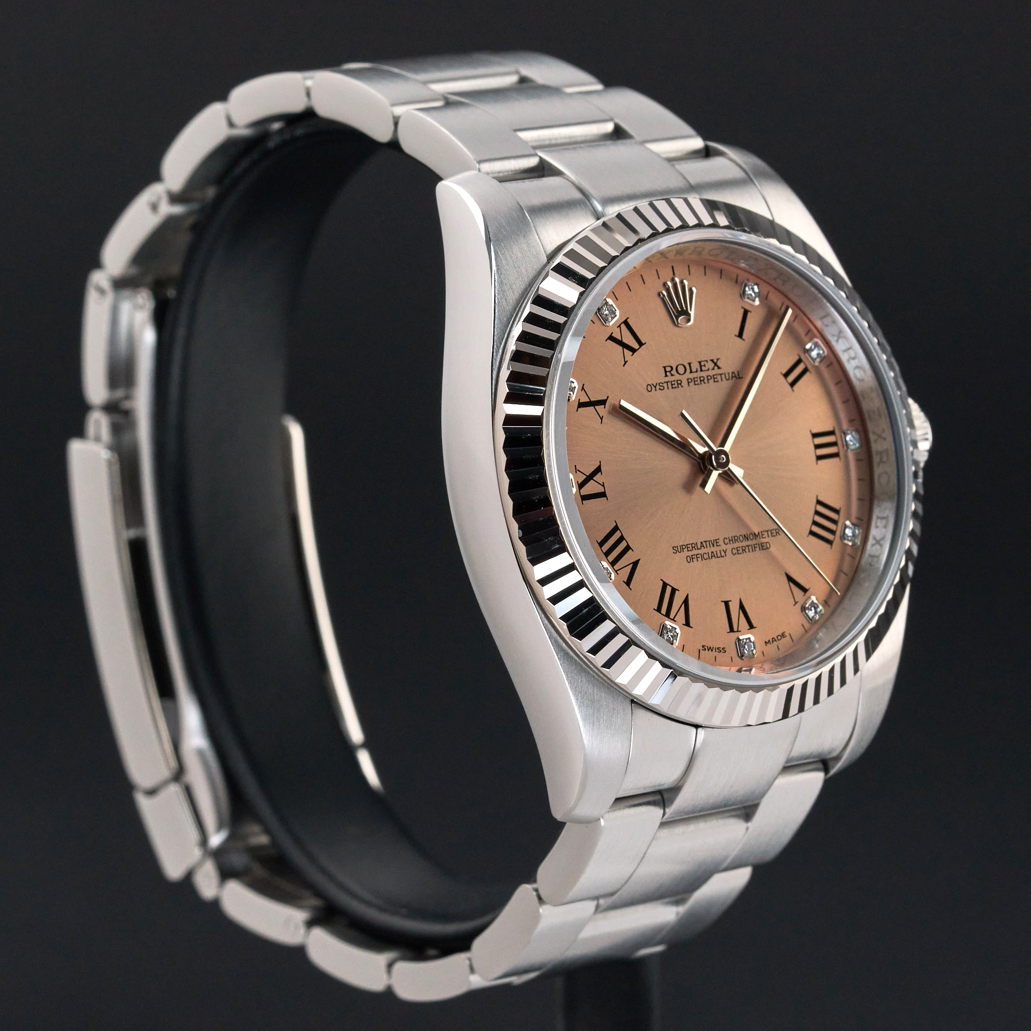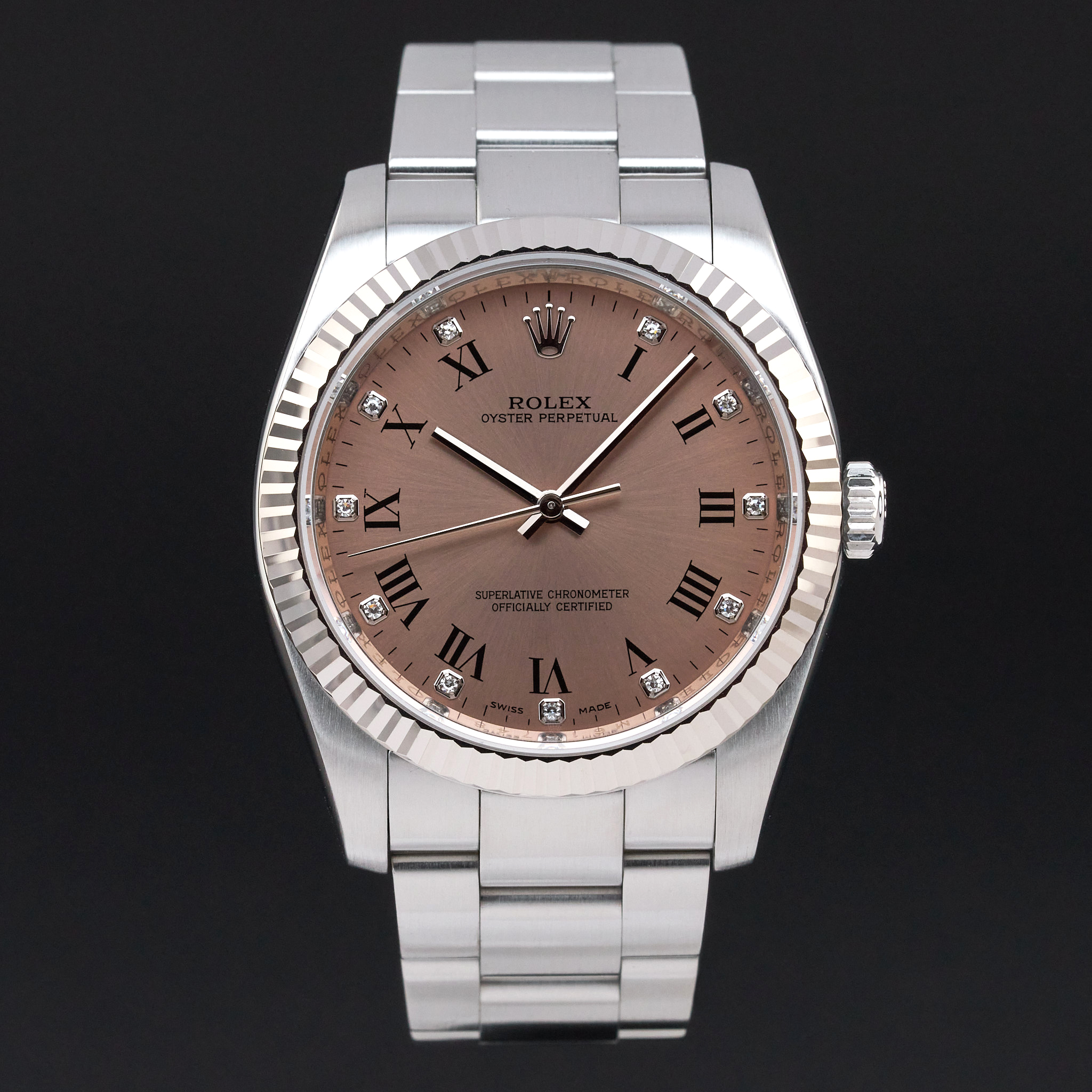 This Rolex Oyster Perpetual 116034 features a Pink diamond Roman dial and is crafted from stainless steel, with a production year of 2008.