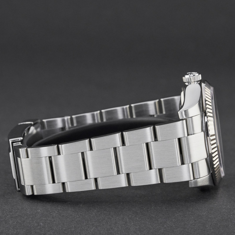 This Rolex Oyster Perpetual 116034 features a Salmon diamond Roman dial and is crafted from stainless steel, with a production year of 2008.