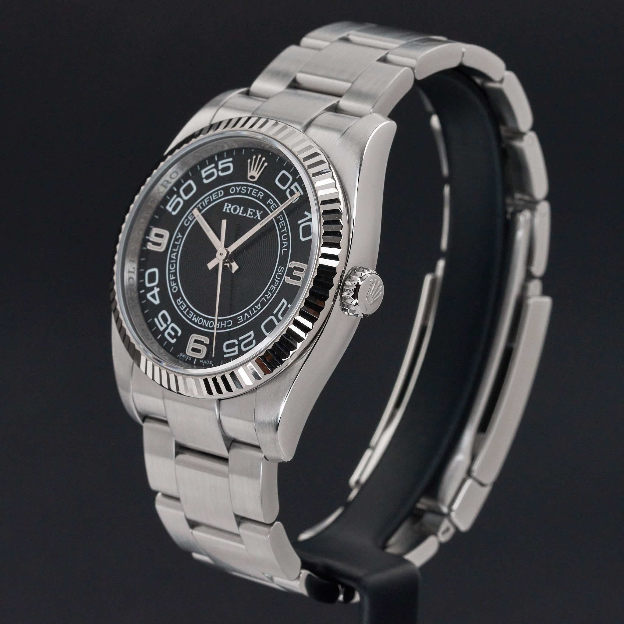 This Rolex Oyster Perpetual 116034 features a Black Arabic "Harley Davidson" dial and is crafted from stainless steel, with a production year of 2009.