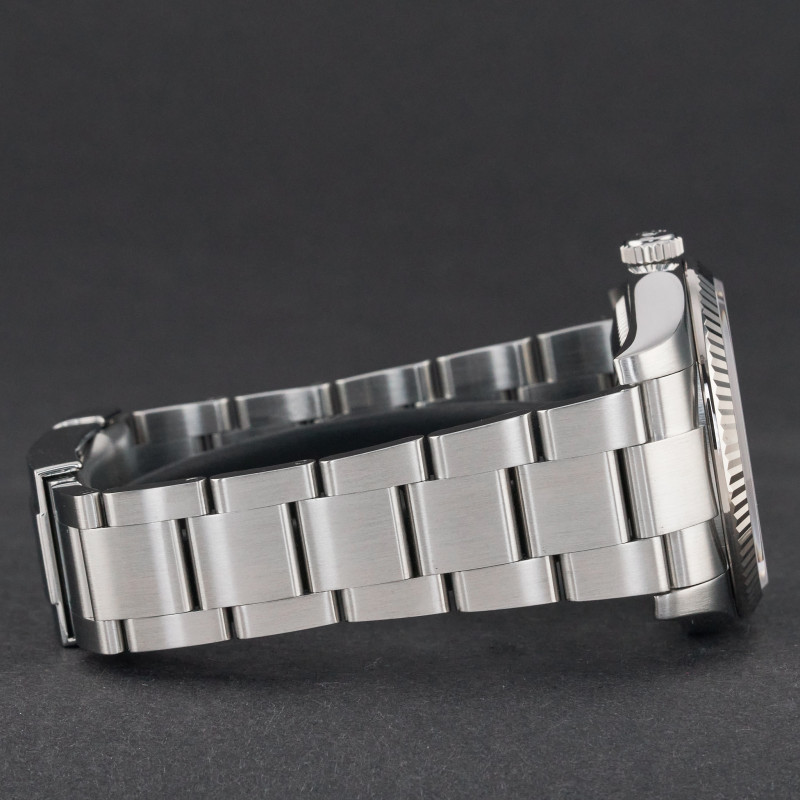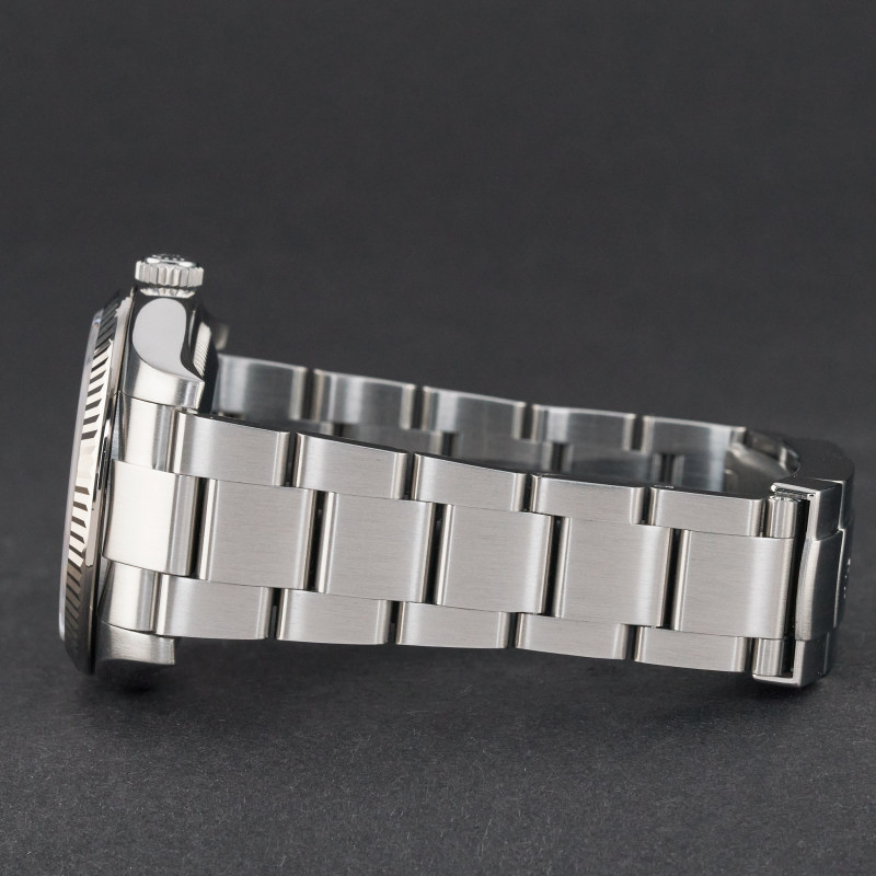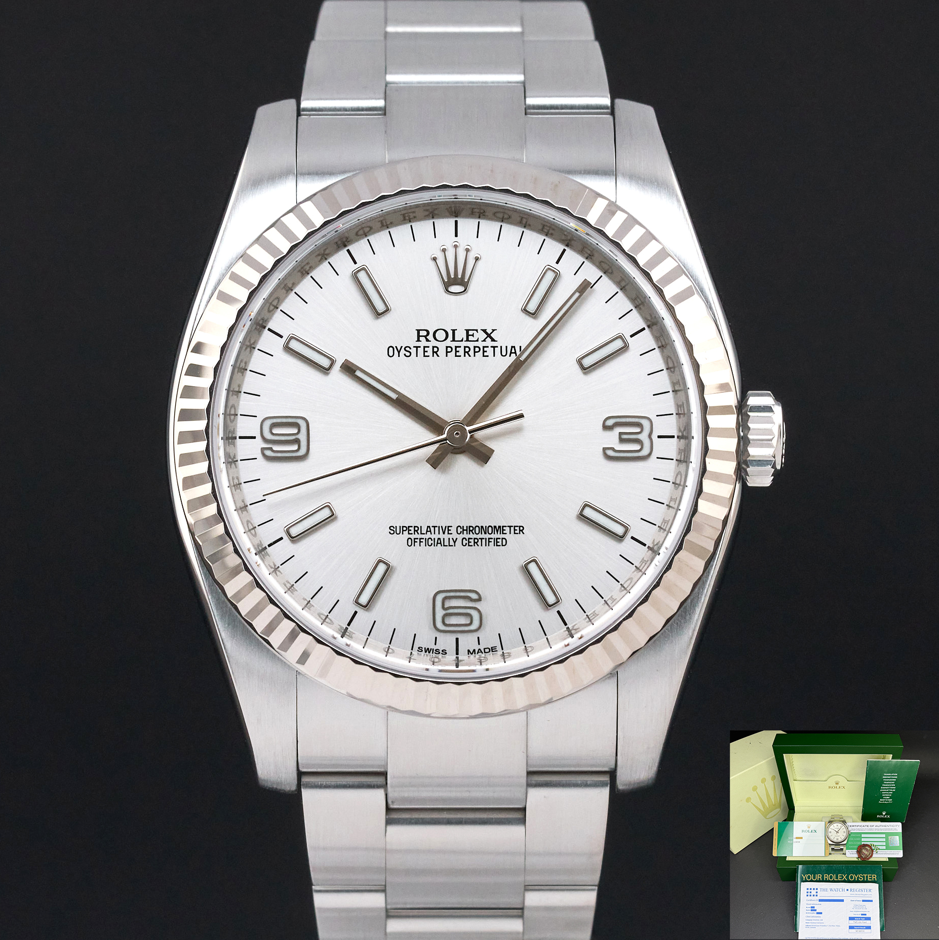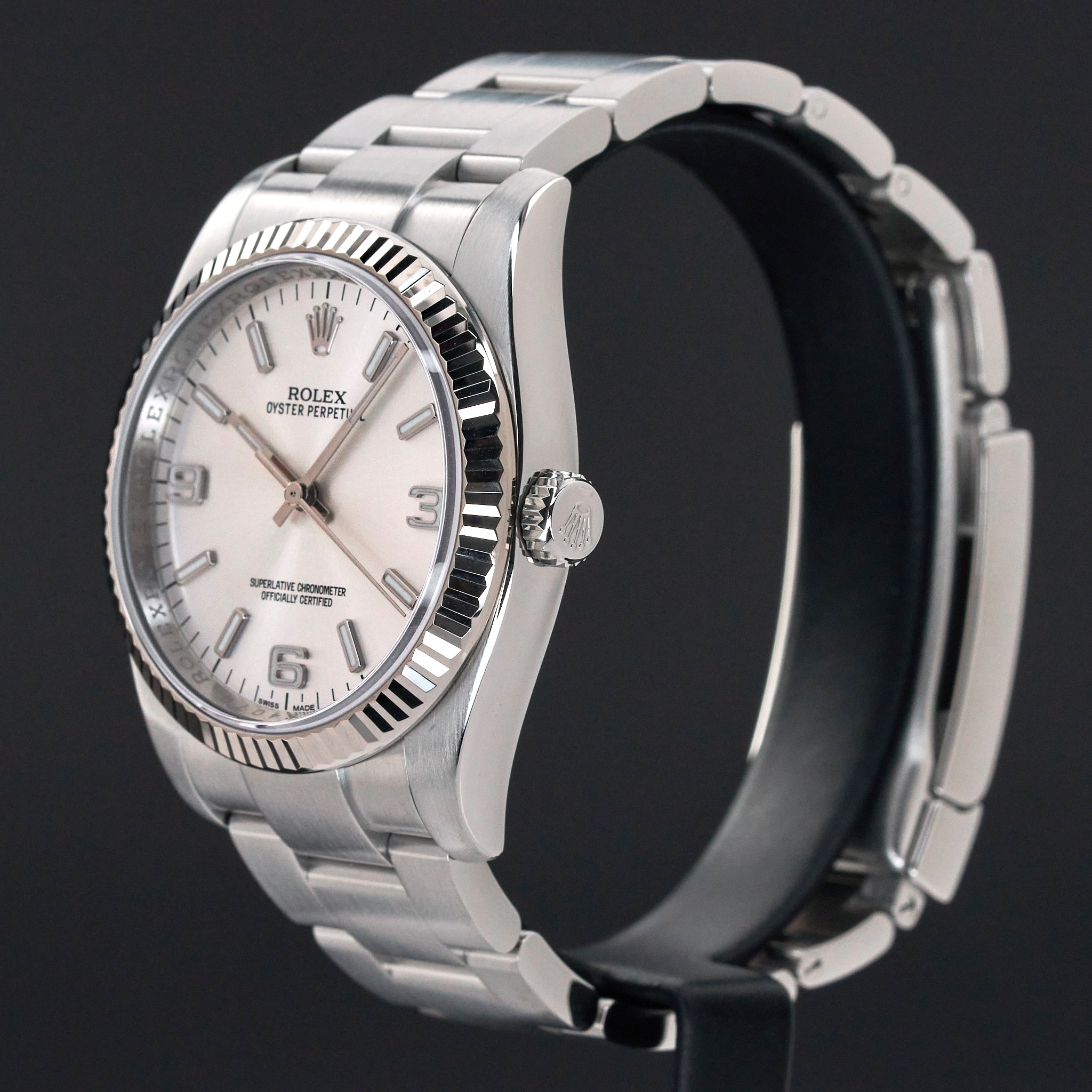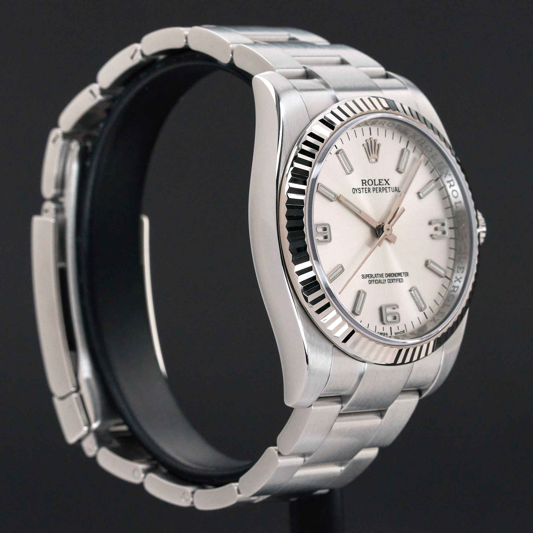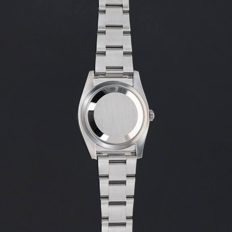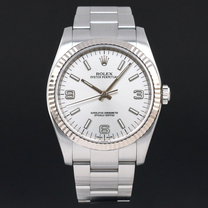 This Rolex Oyster Perpetual 116034 features a Silver Arabic dial and is crafted from stainless steel, with a production year of 2010.
