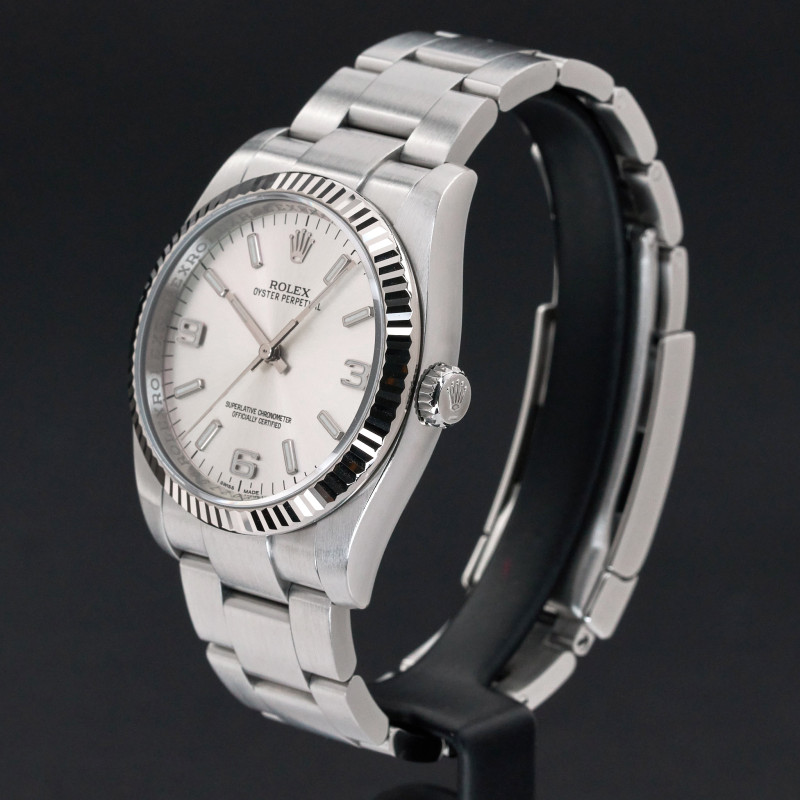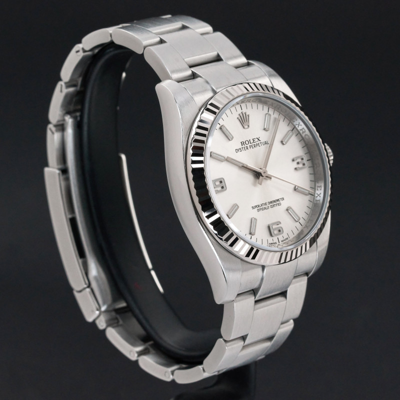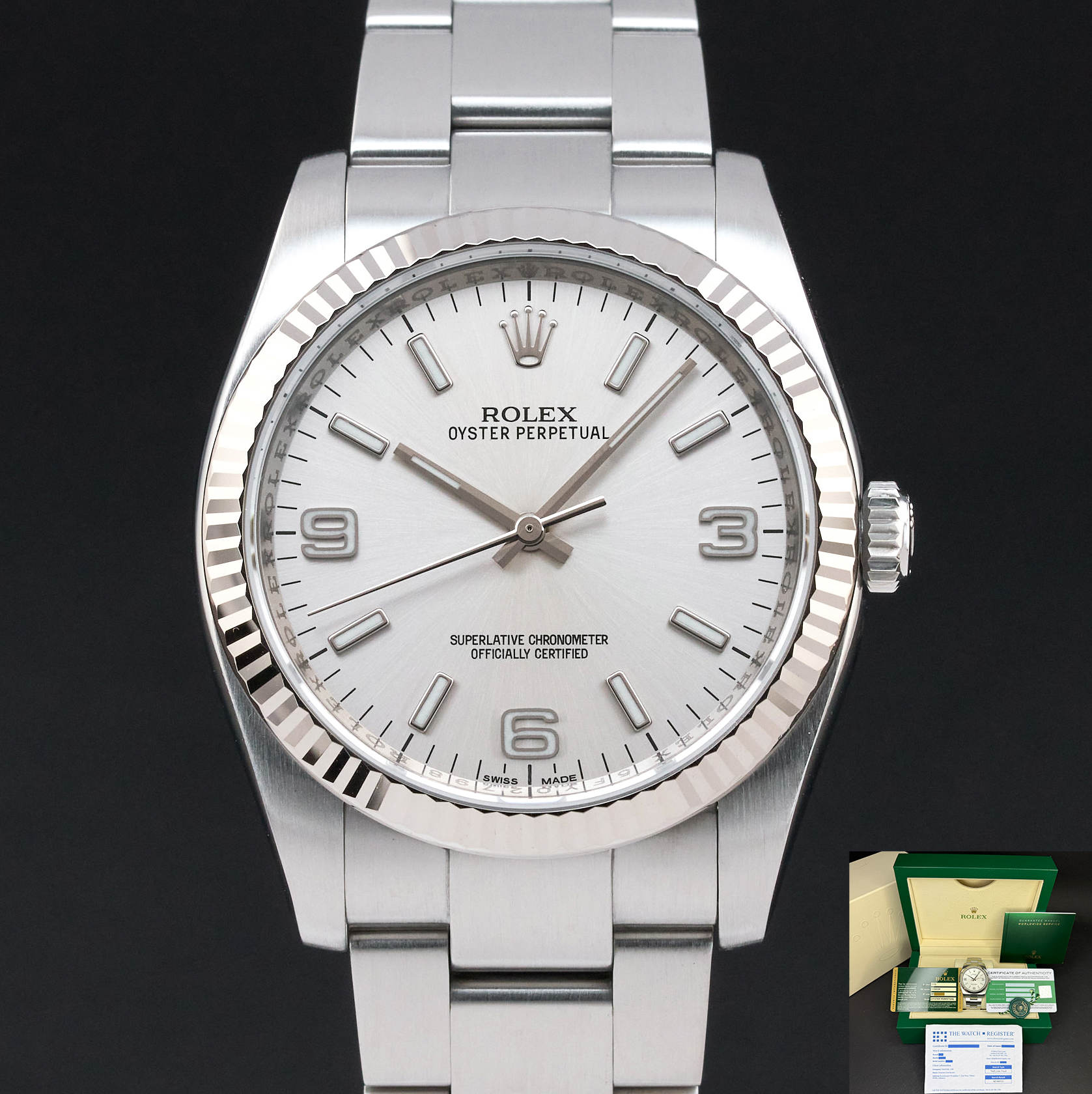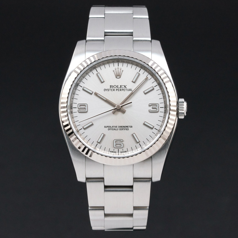 This Rolex Oyster Perpetual 116034 features a Silver Arabic dial and is crafted from stainless steel, with a production year of 2014.