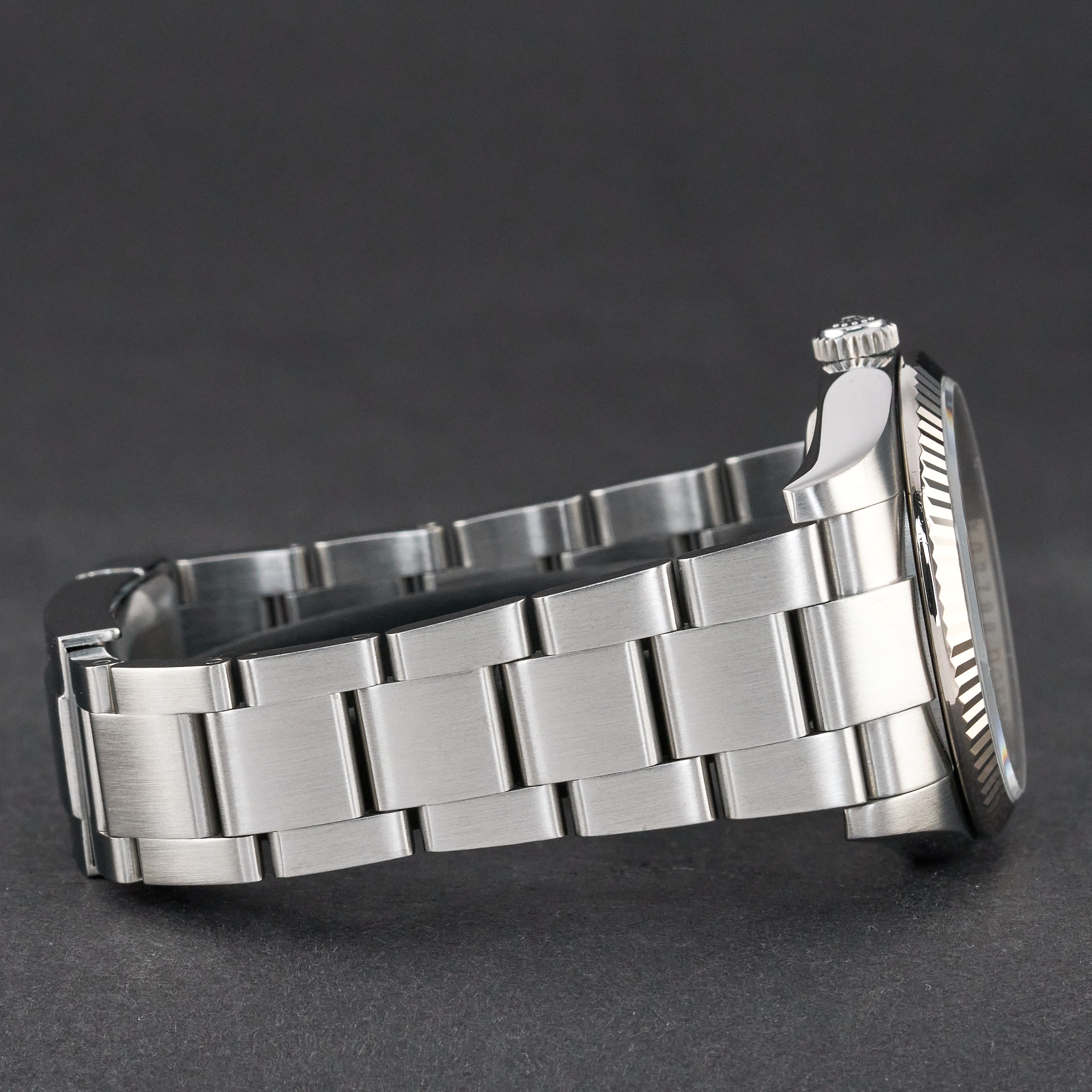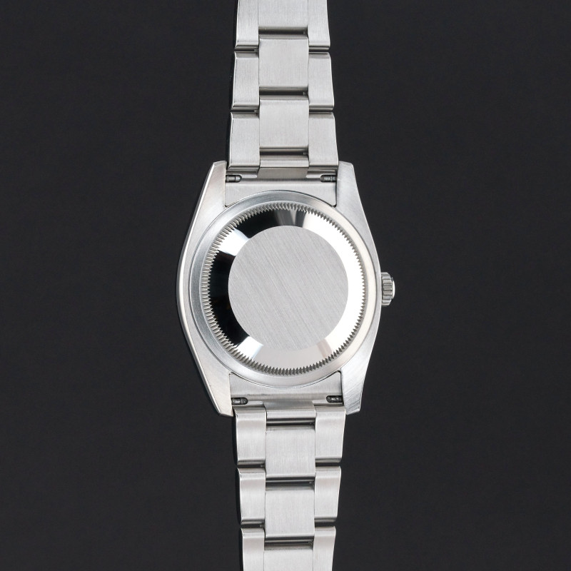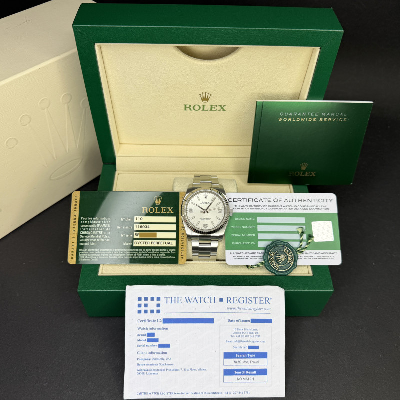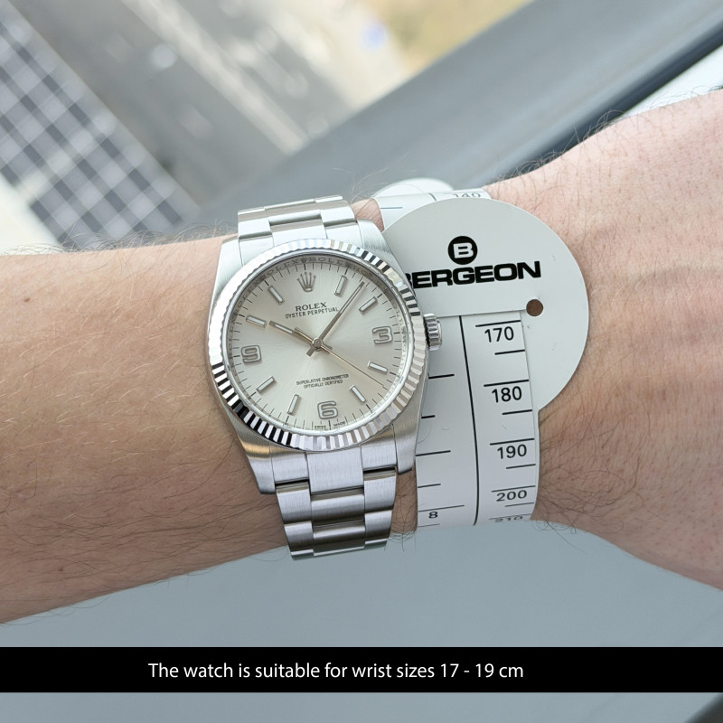 This Rolex Oyster Perpetual 116034 features a Silver Arabic dial and is crafted from stainless steel, with a production year of 2014.