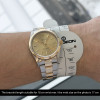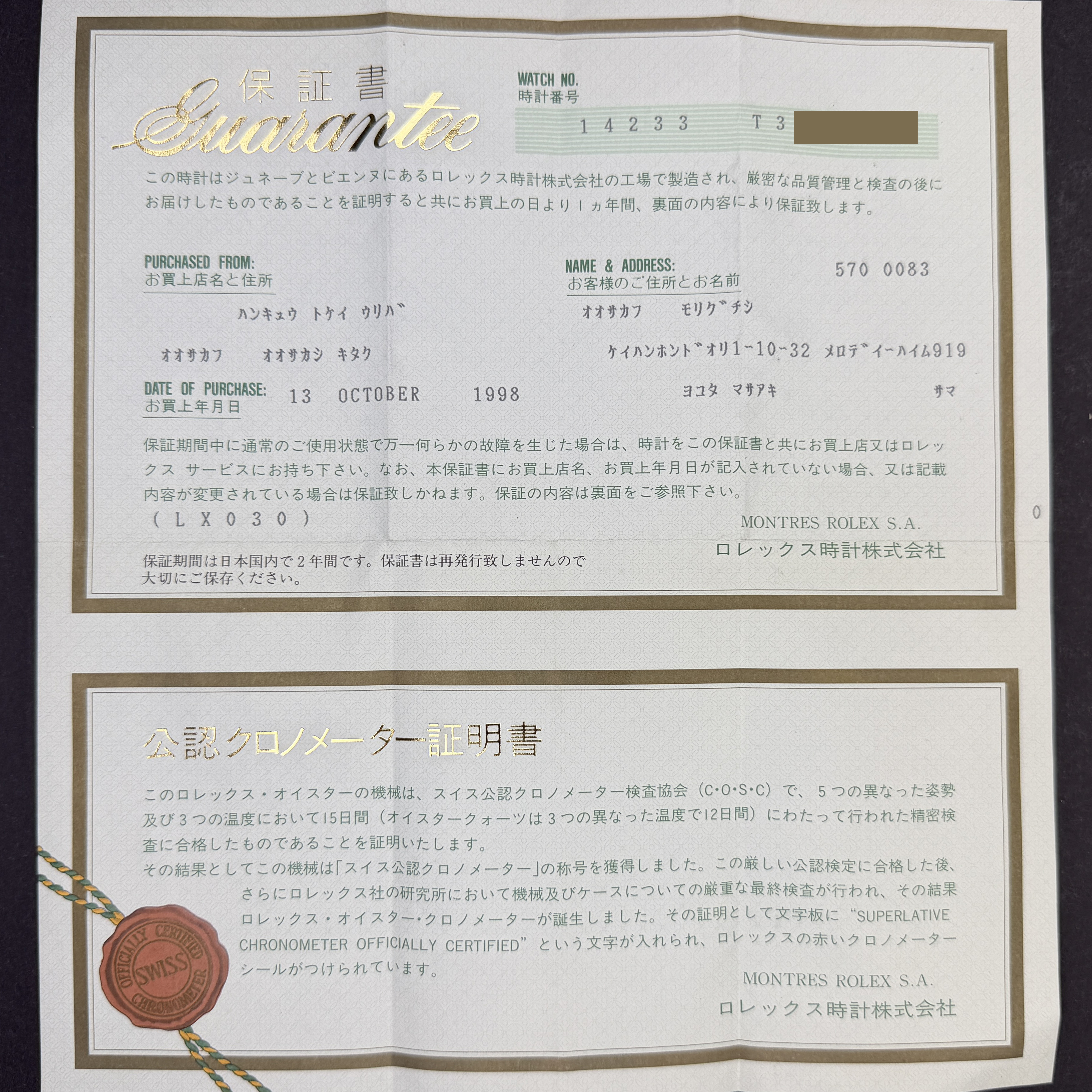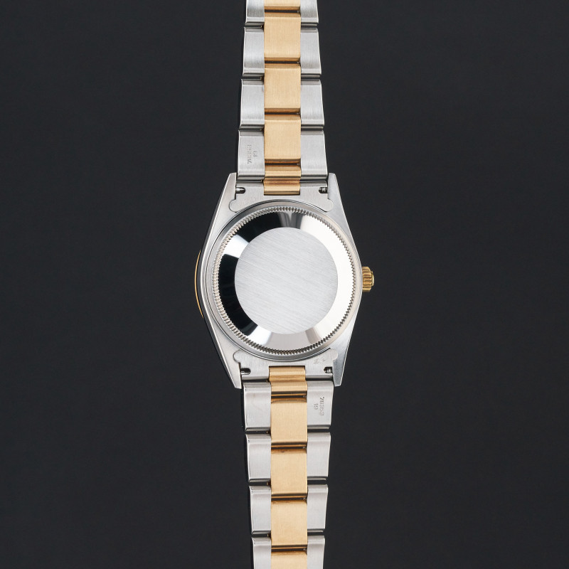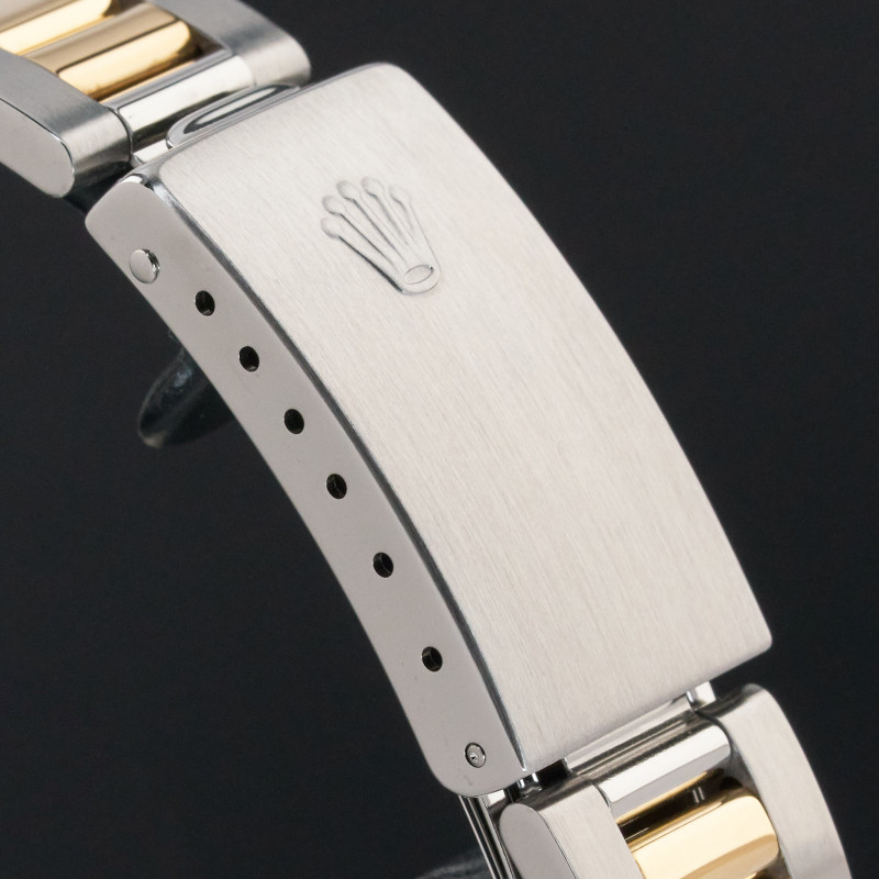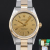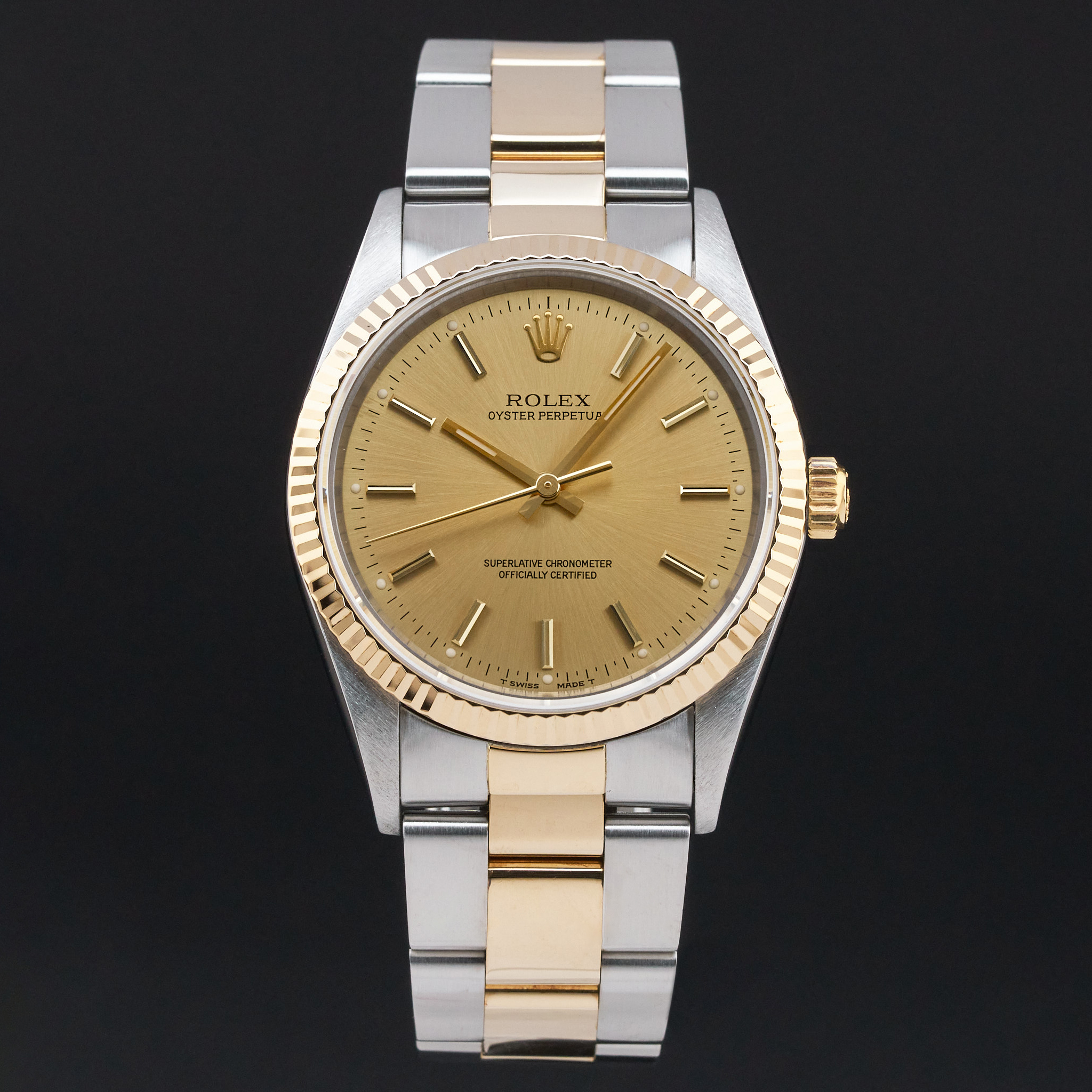 This Rolex Oyster Perpetual 14233 features a Champagne dial and is crafted from 18K yellow gold and stainless steel, with a production year of 1996.
