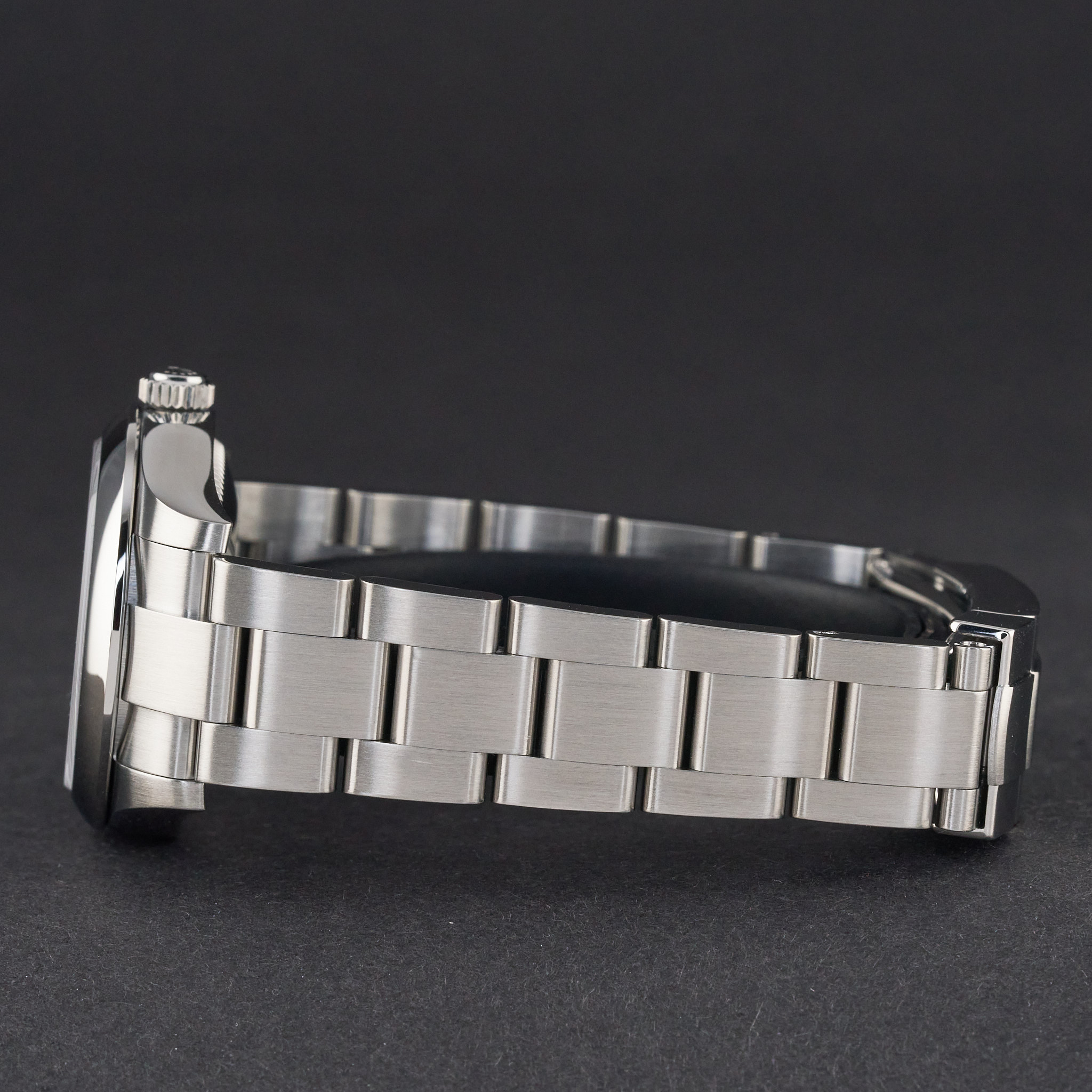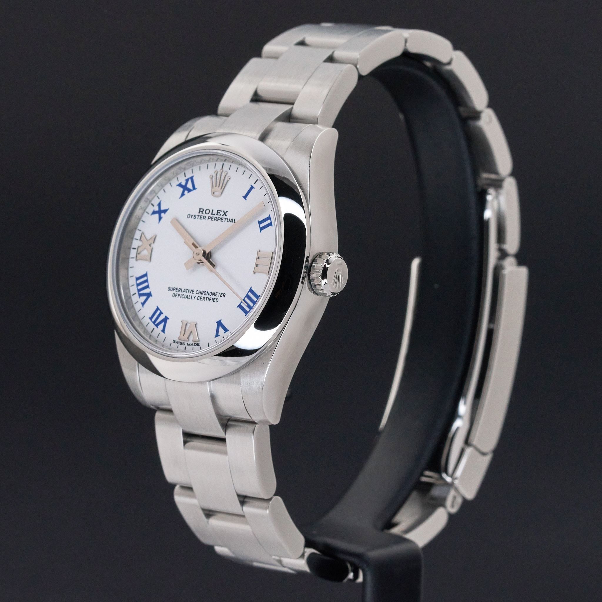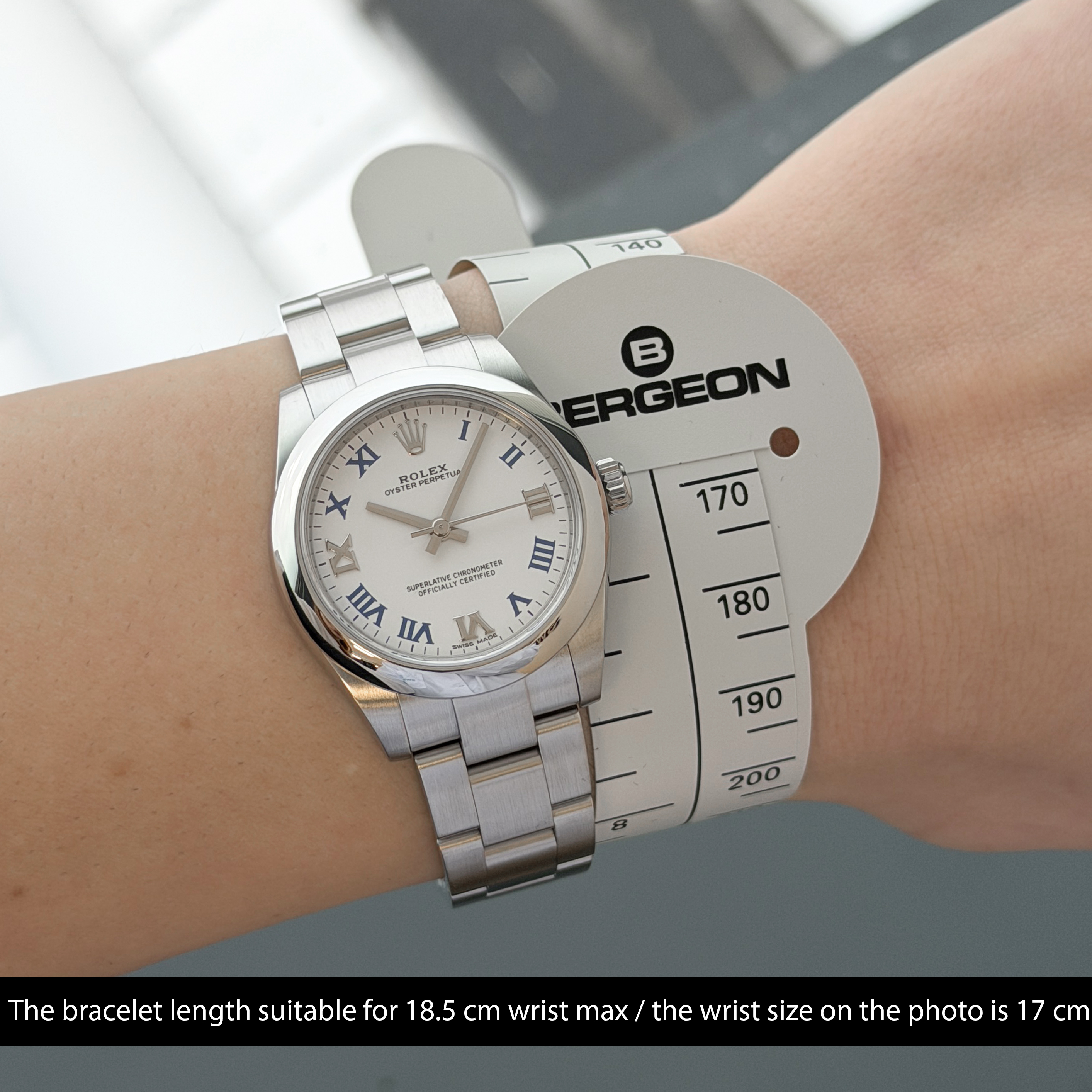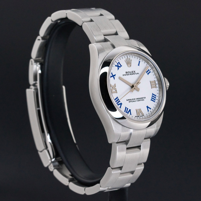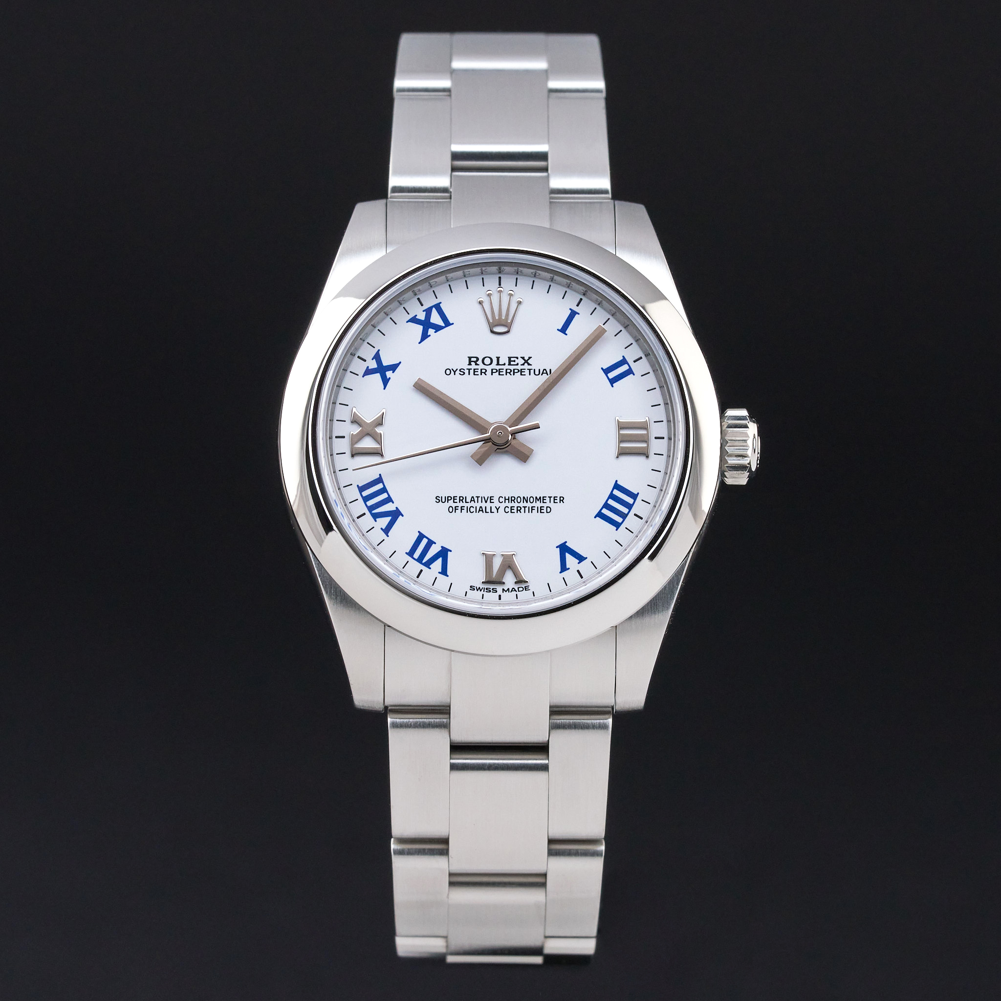 This Rolex Oyster Perpetual 177200 features a White Roman dial and is crafted from stainless steel, with a production year of 2019.