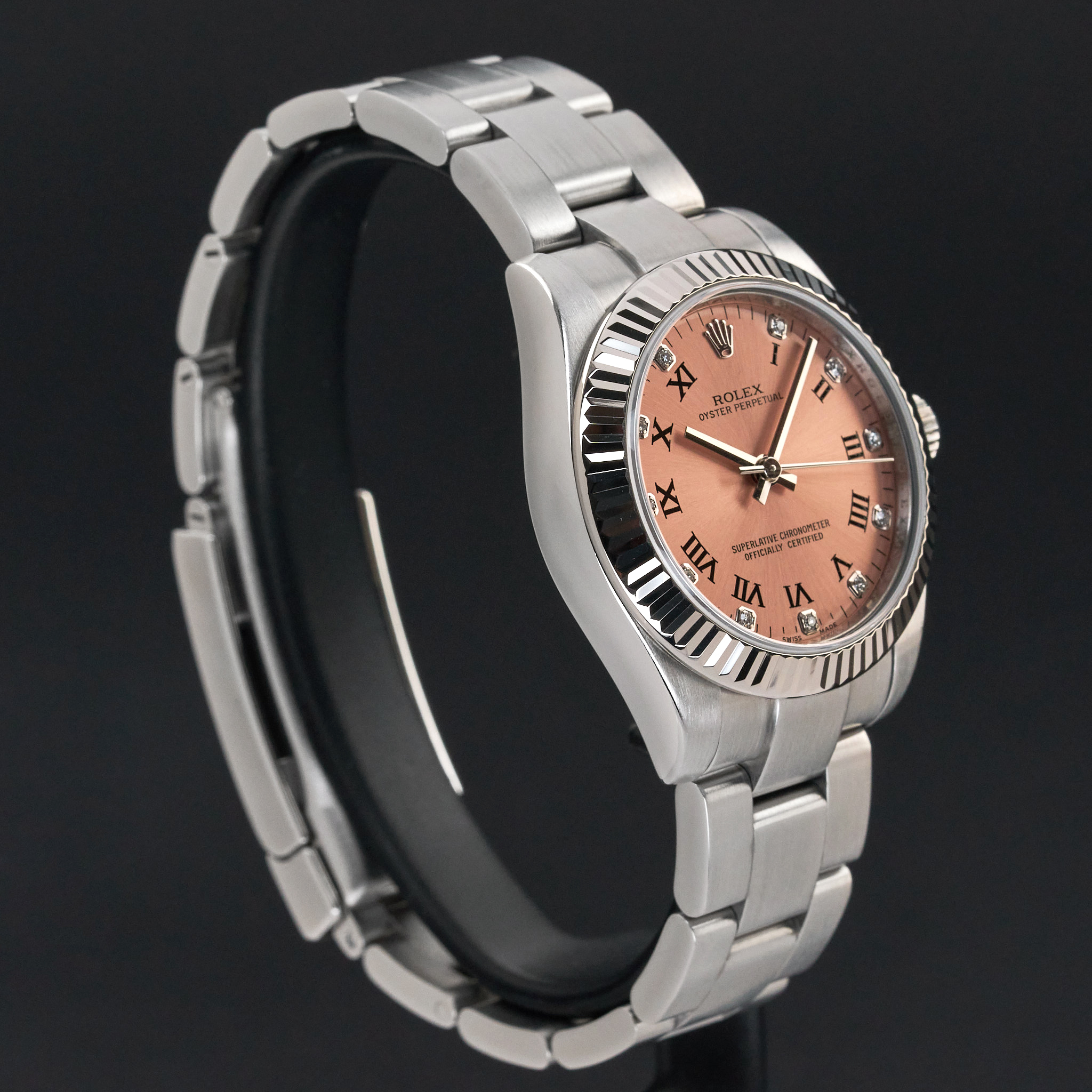 This Rolex Oyster Perpetual 177234 features a Pink Roman diamond dial and is crafted from stainless steel, with a production year of 2014.