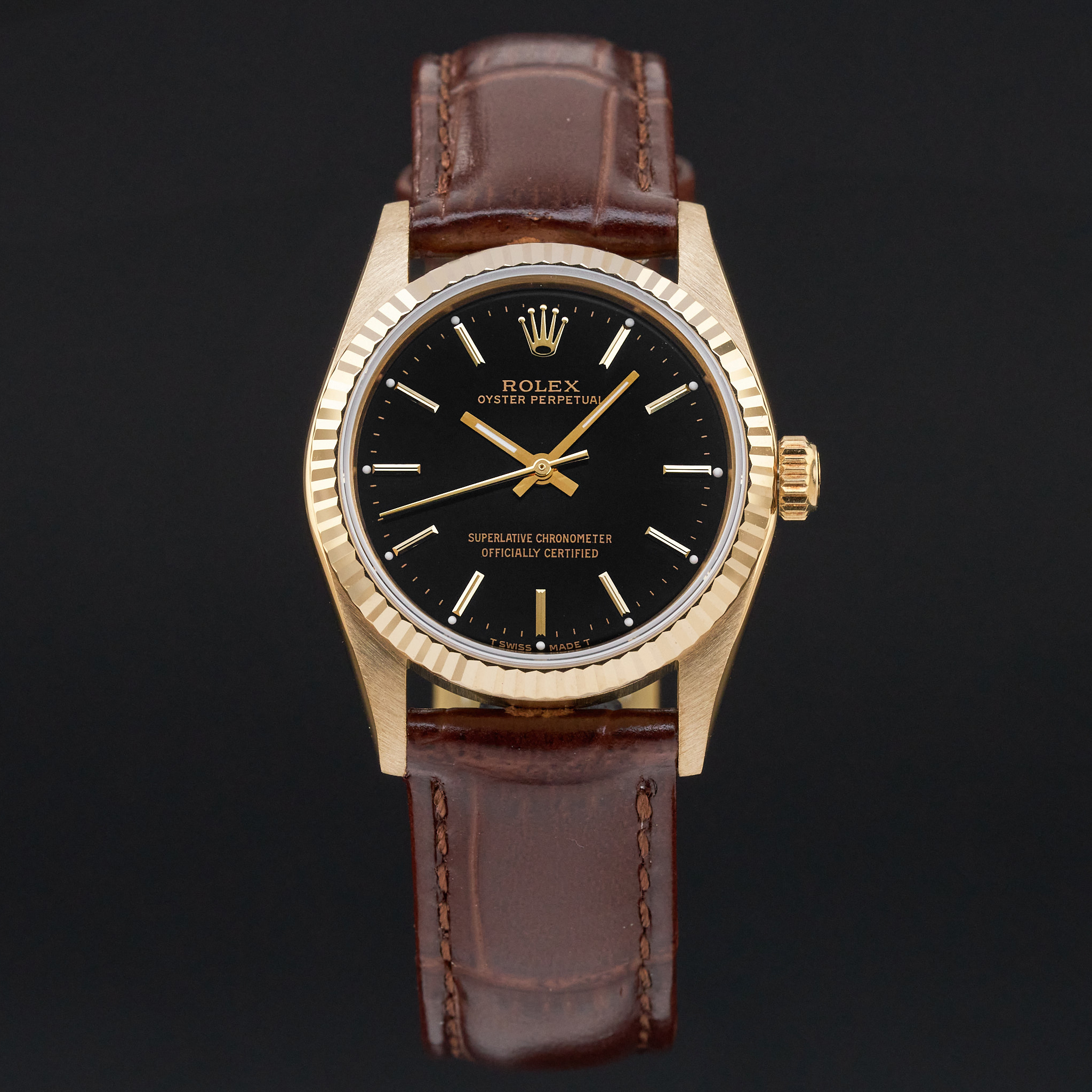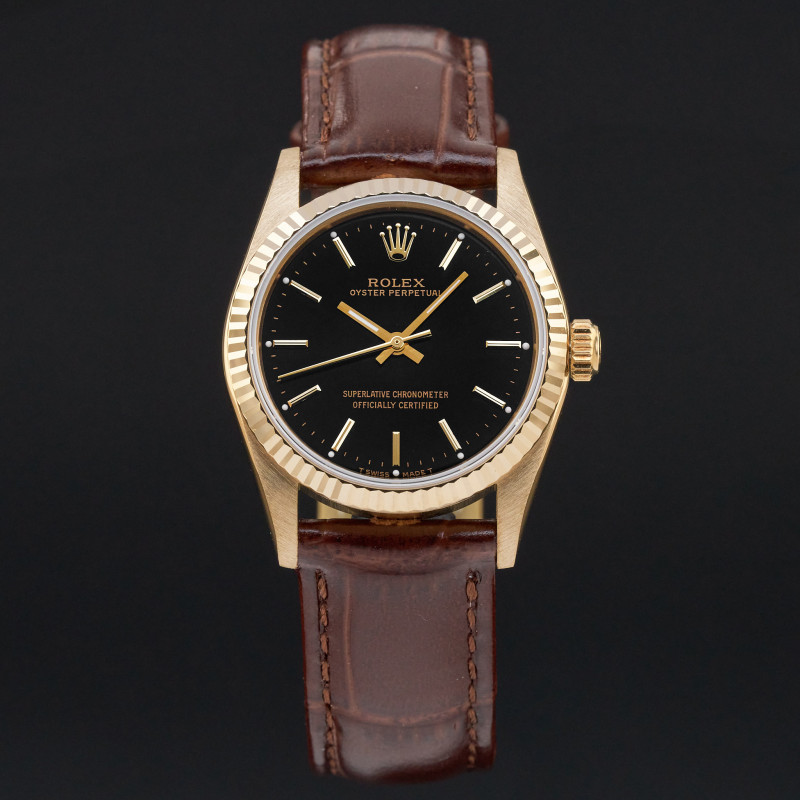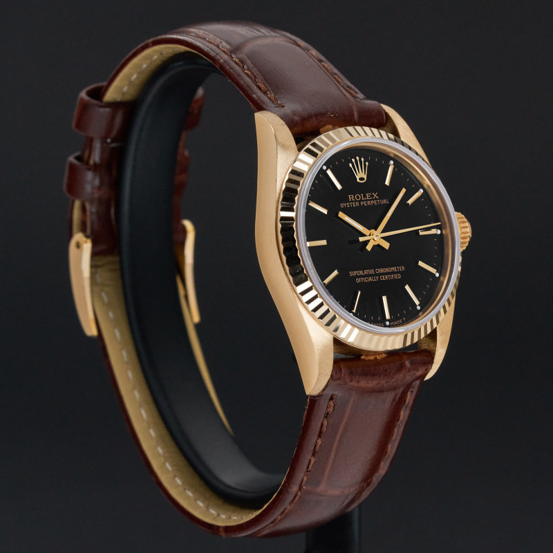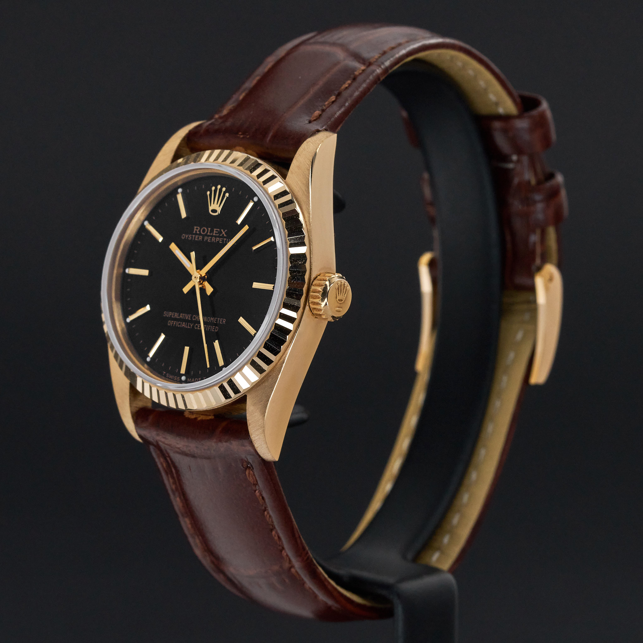 This Rolex Oyster Perpetual 67518 features a Black dial and is crafted from 18K yellow gold, with a production year of 1990.