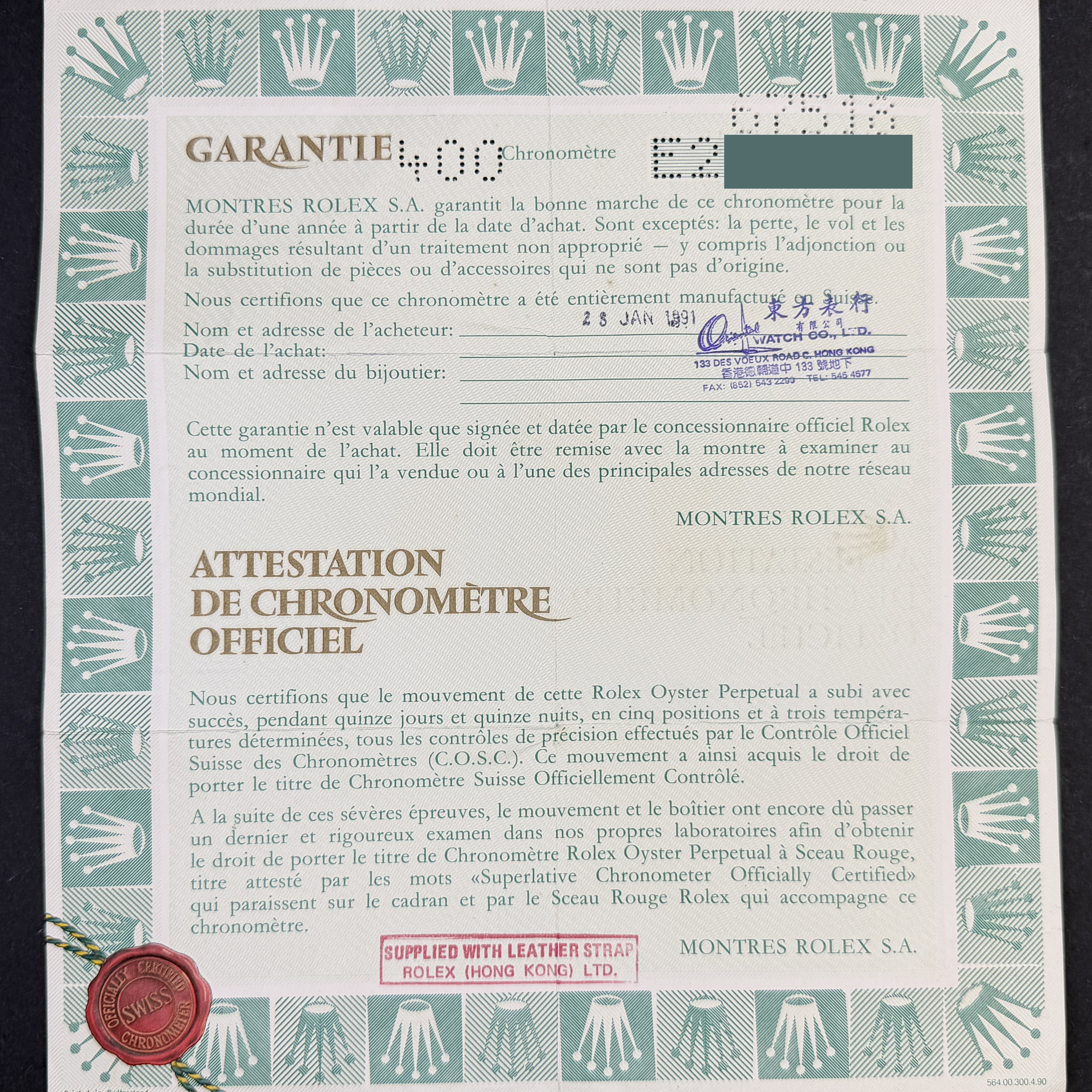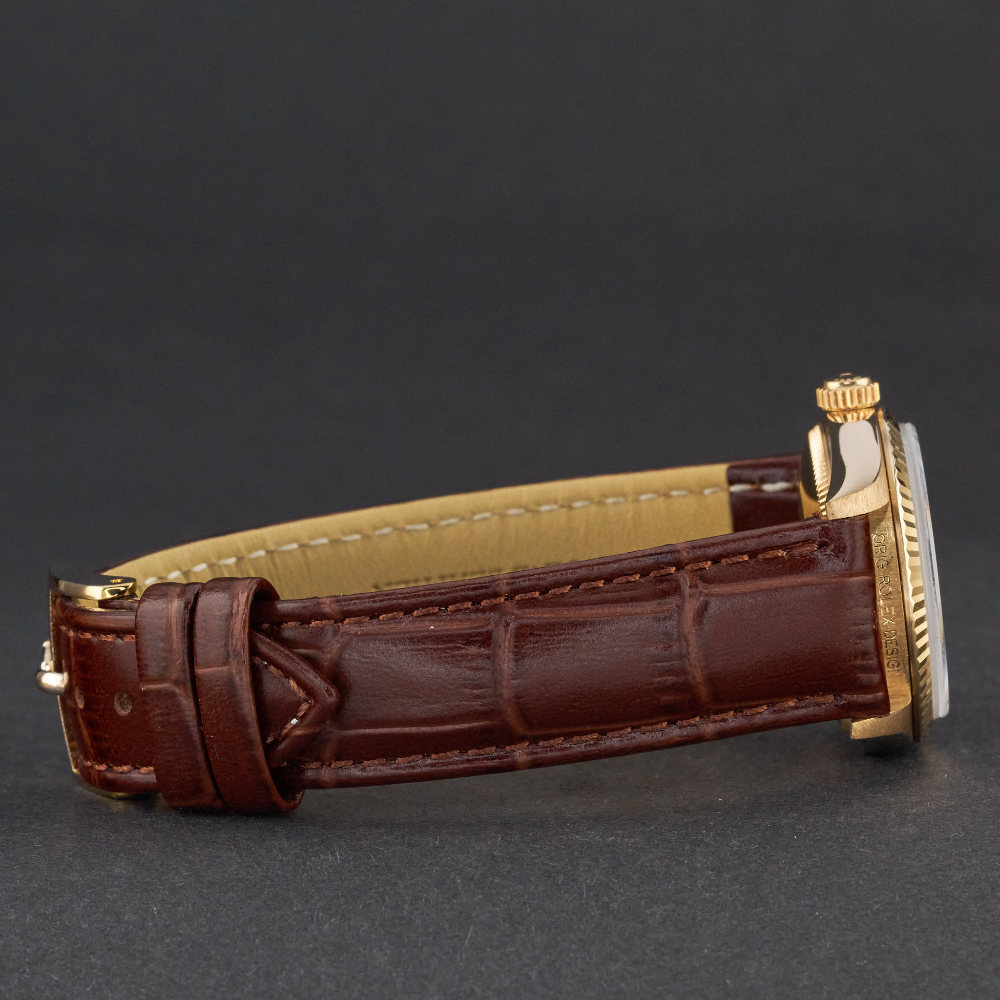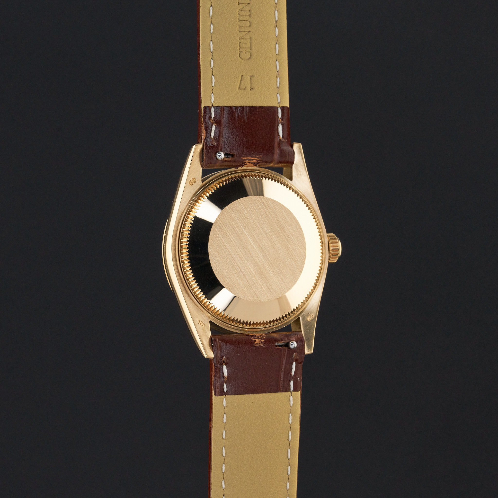 This Rolex Oyster Perpetual 67518 features a Black dial and is crafted from 18K yellow gold, with a production year of 1990.