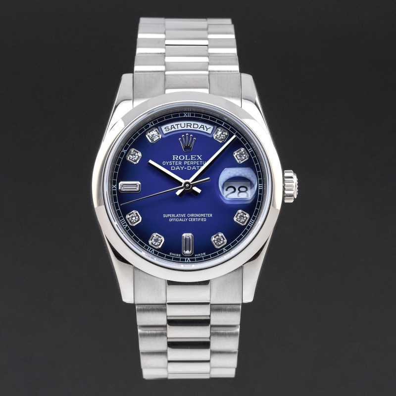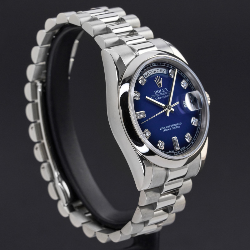 This Rolex Day-Date 118209 features a Blue Vignette diamond dial and is crafted from 18K white gold, with a production year of 2006.