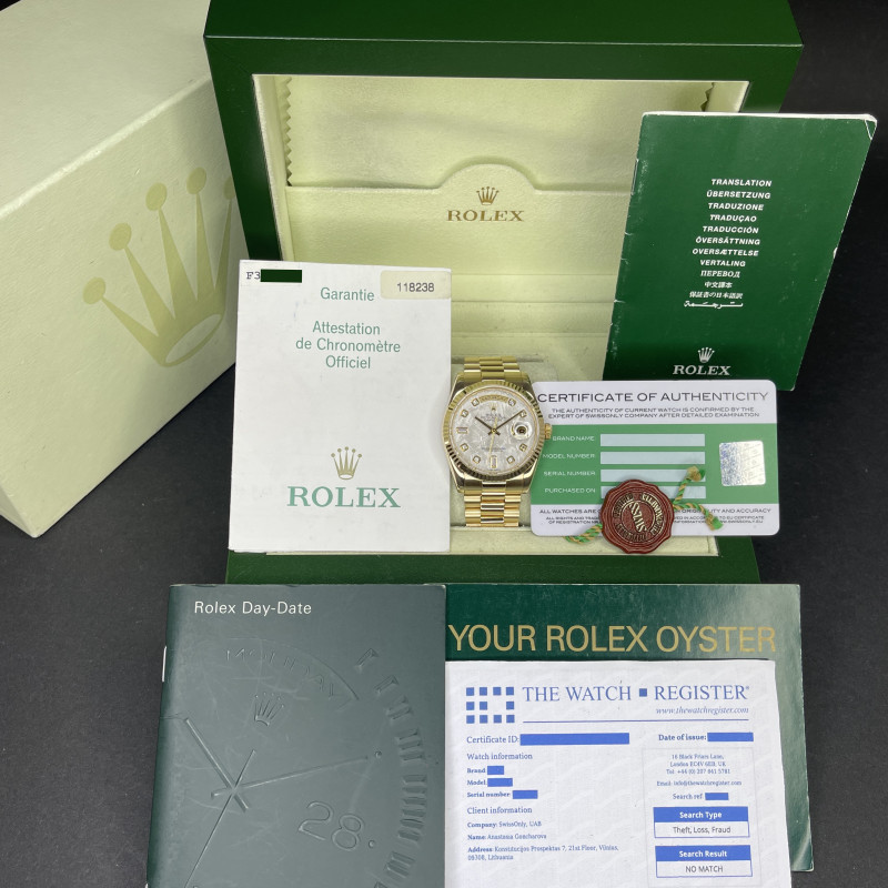 This Rolex Day-Date 118238 features a Meteorite diamond dial and is crafted from 18K yellow gold, with a production year of 2004.
