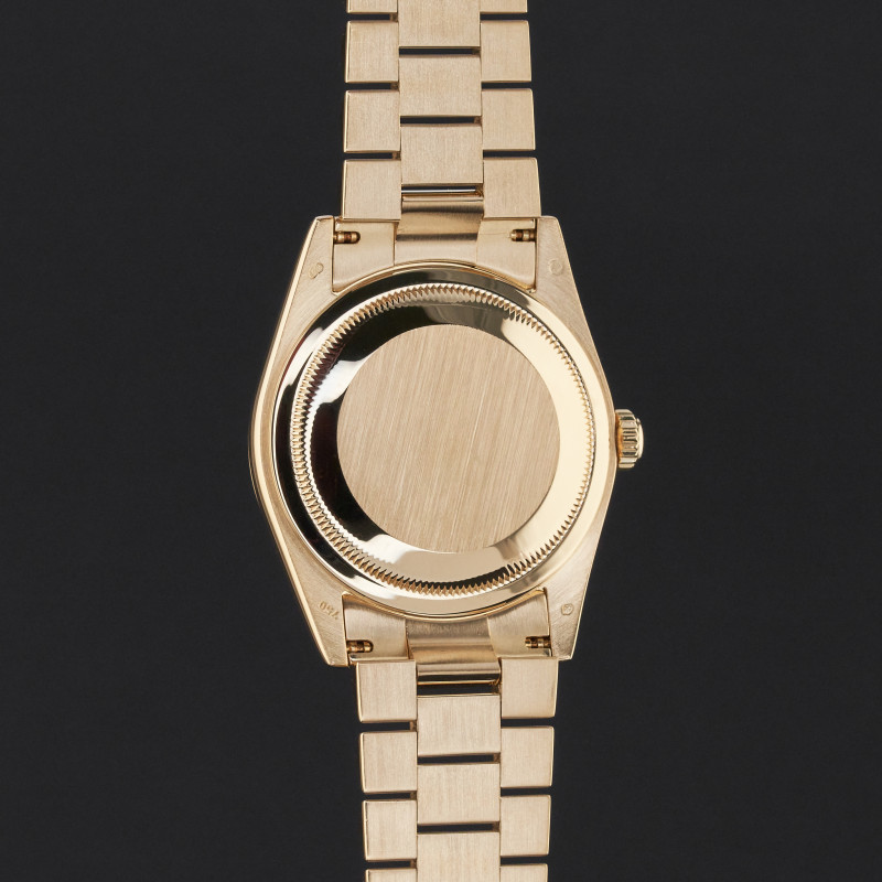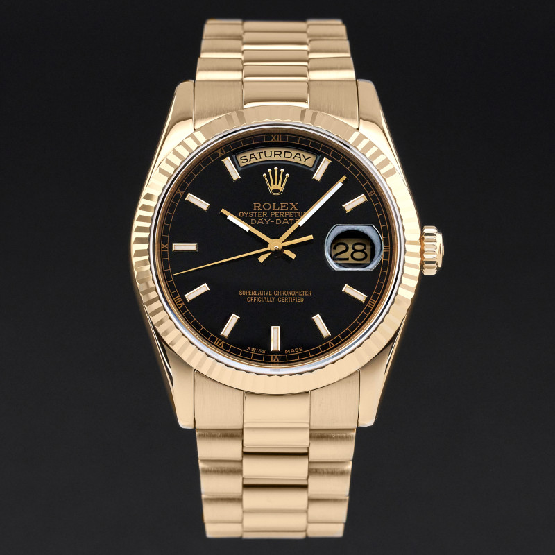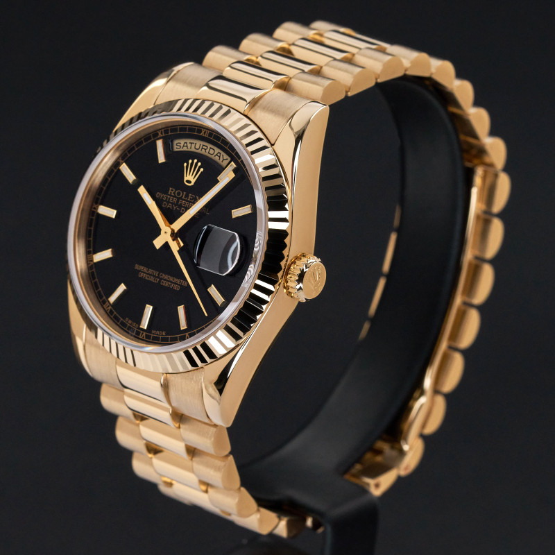 This Rolex Day-Date 118238 features a Black dial and is crafted from 18K yellow gold, with a production year of 2006.