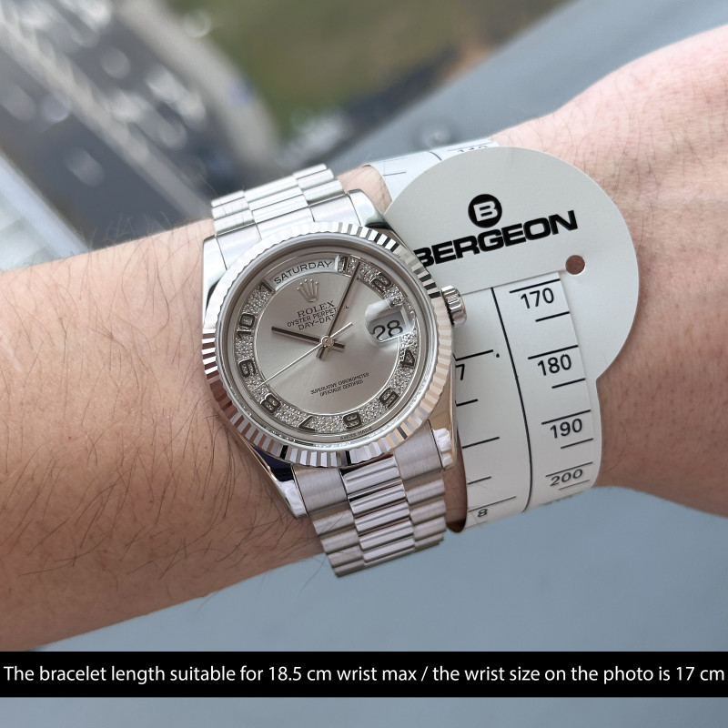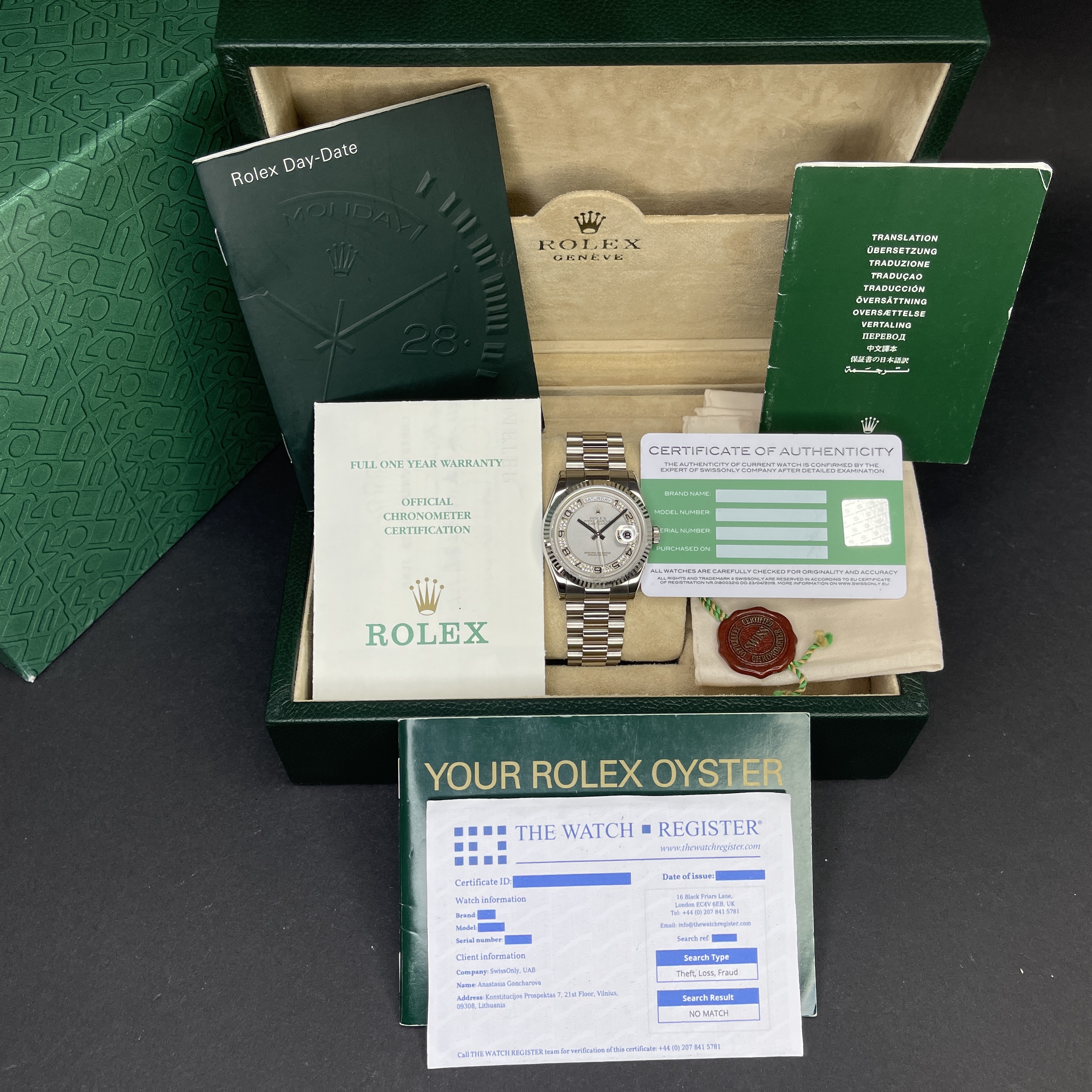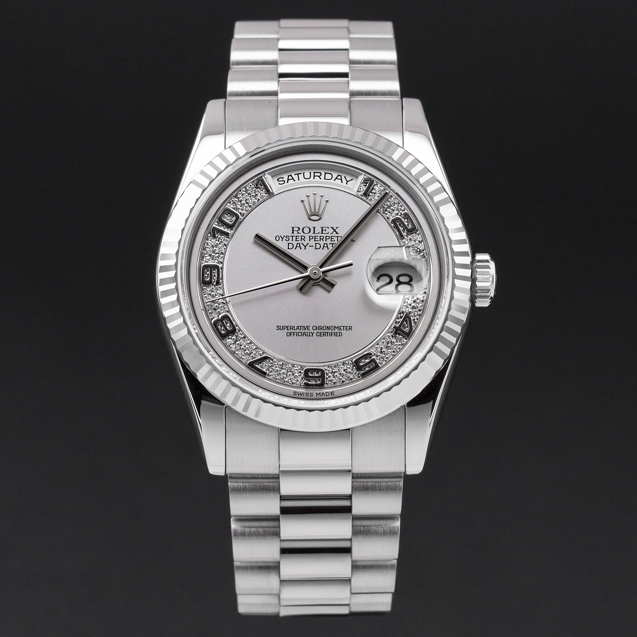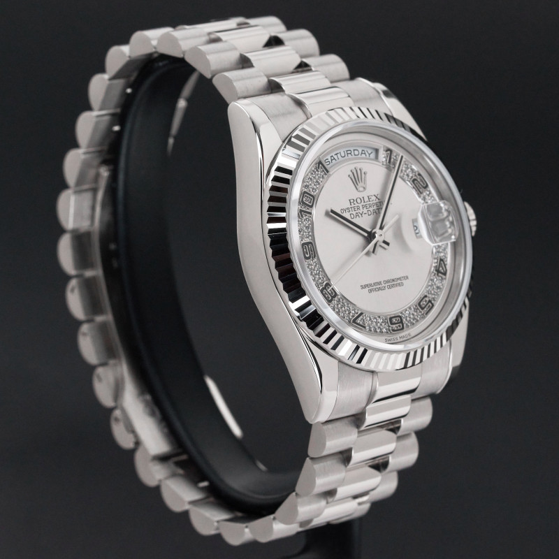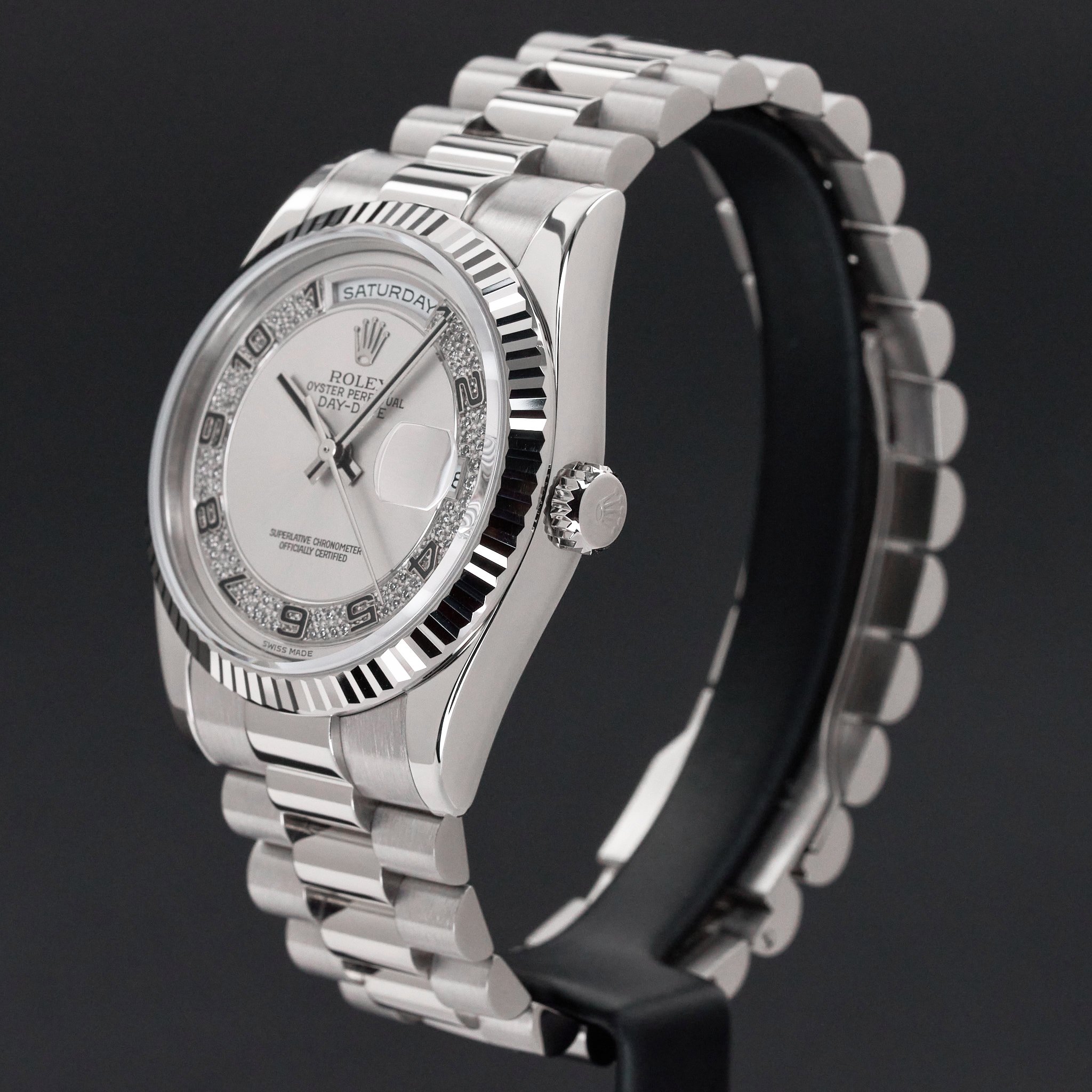 This Rolex Day-Date 118239 features a Silver myriad diamond Arabic dial and is crafted from 18K white gold, with a production year of 2000.