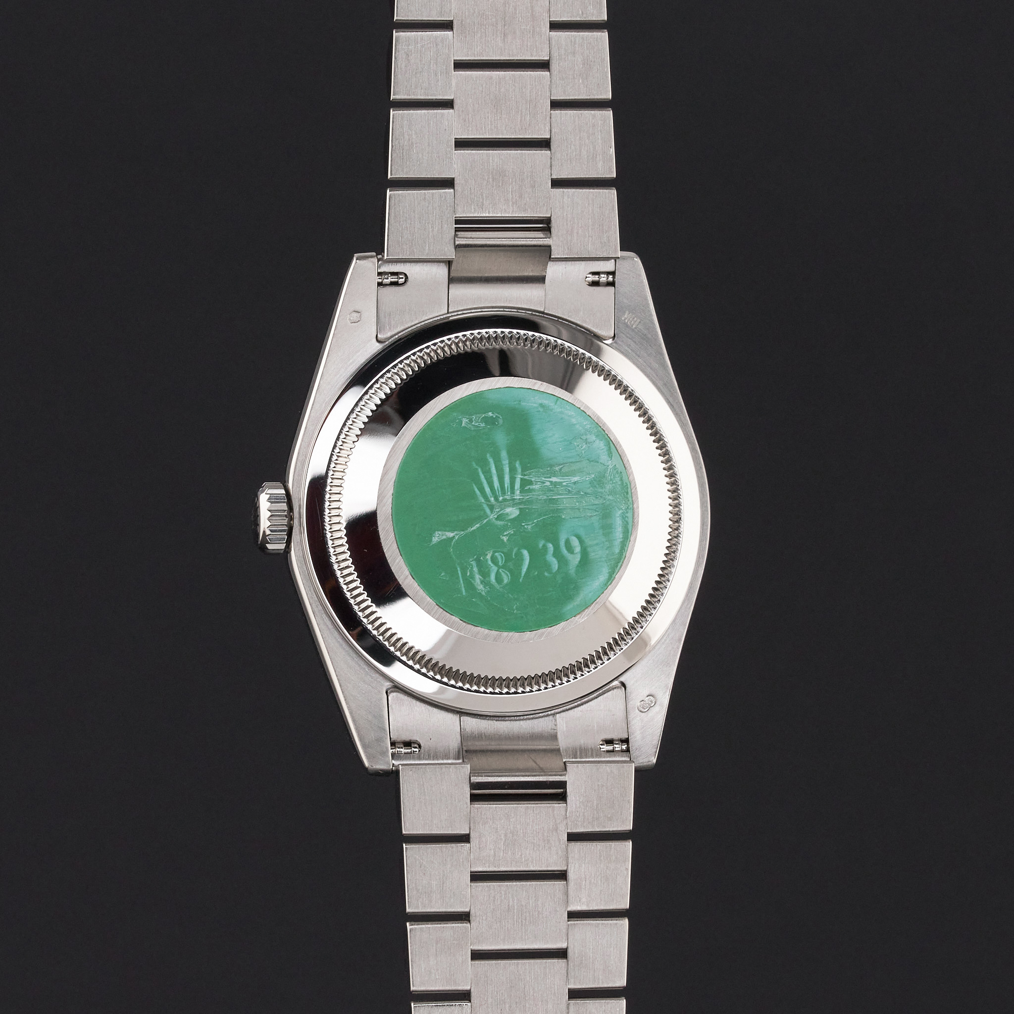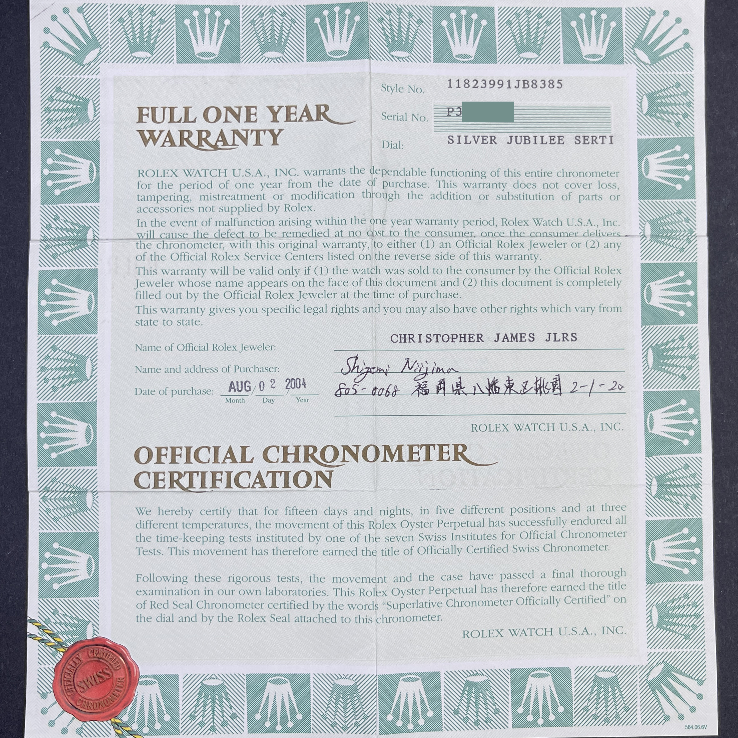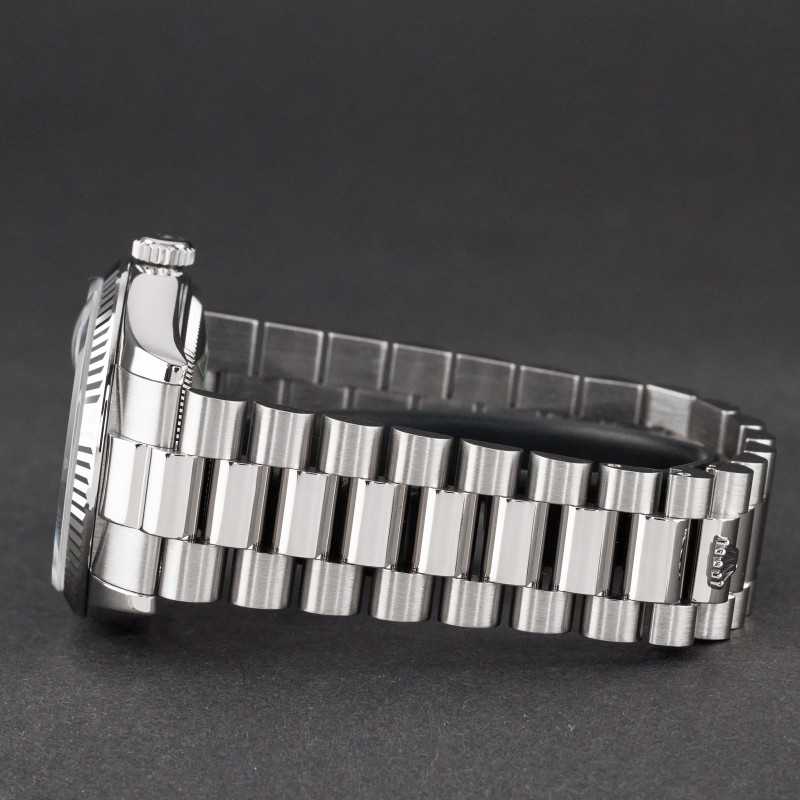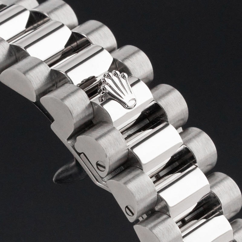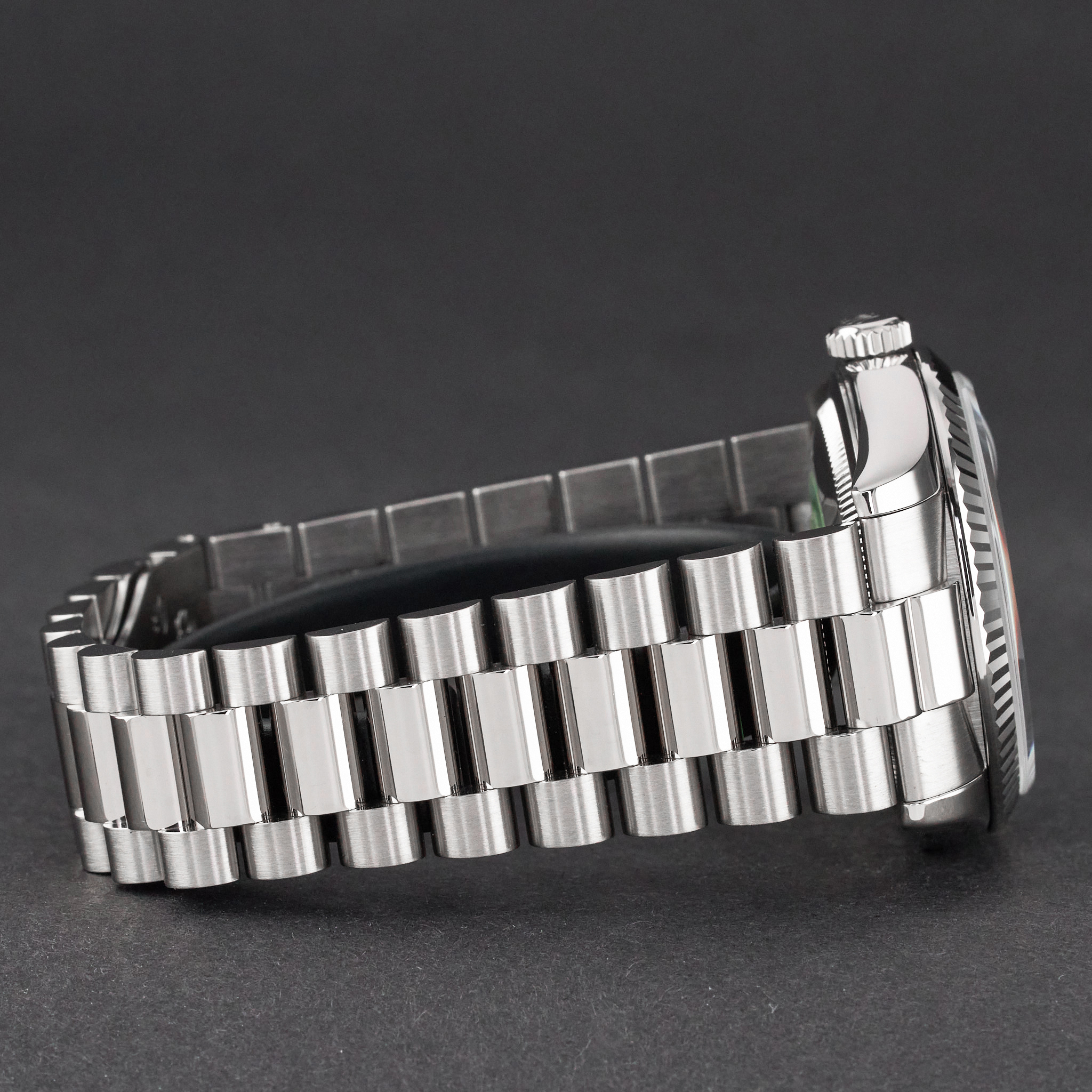 This Rolex Day-Date 118239 features a Silver myriad diamond Arabic dial and is crafted from 18K white gold, with a production year of 2000.