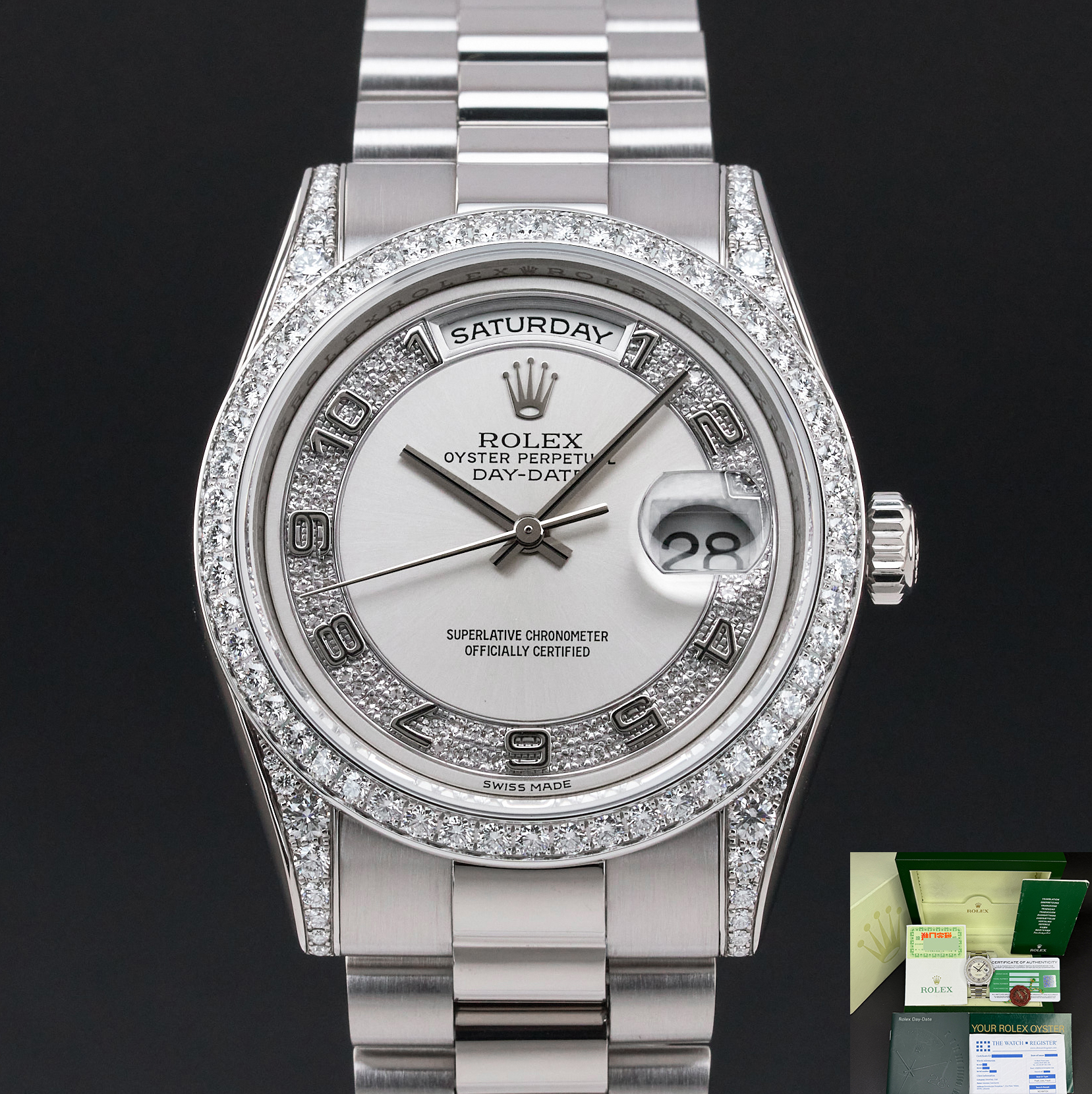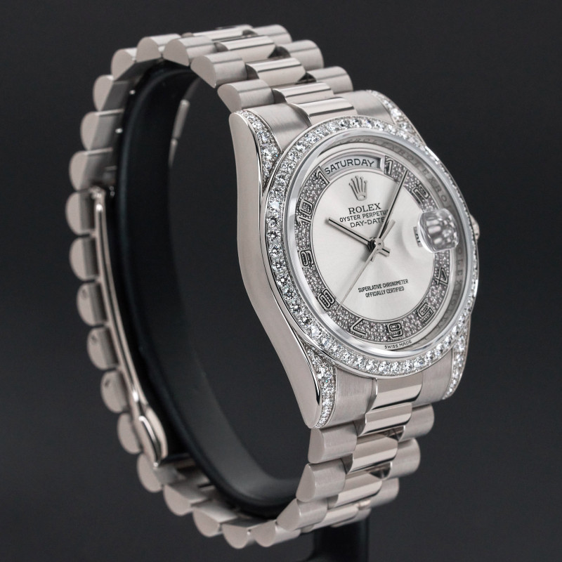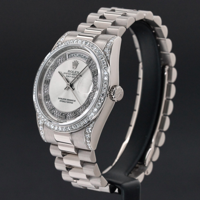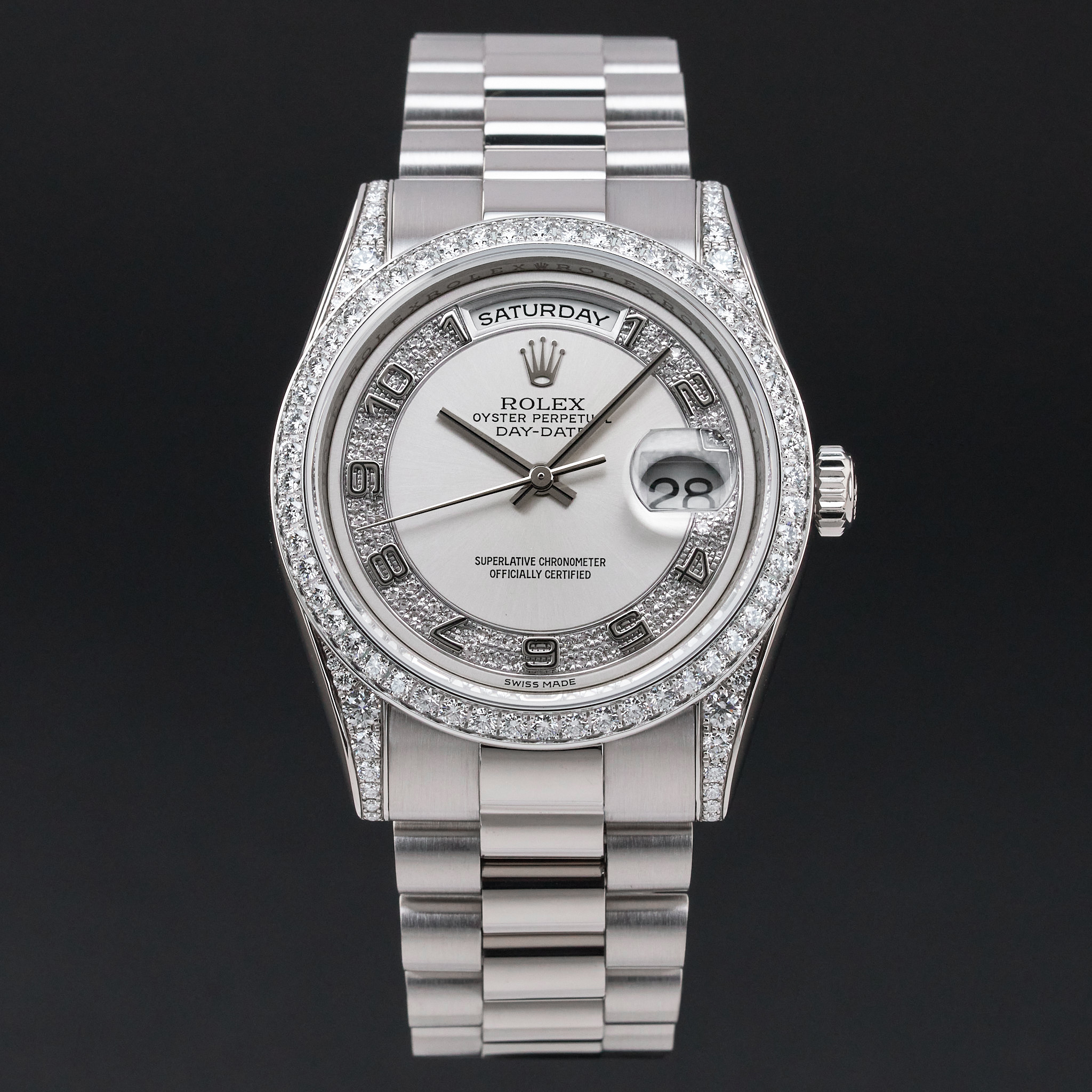 This Rolex Day-Date 118389 features a Silver myriad diamond Arabic dial and is crafted from 18K white gold, with a production year of 2006.