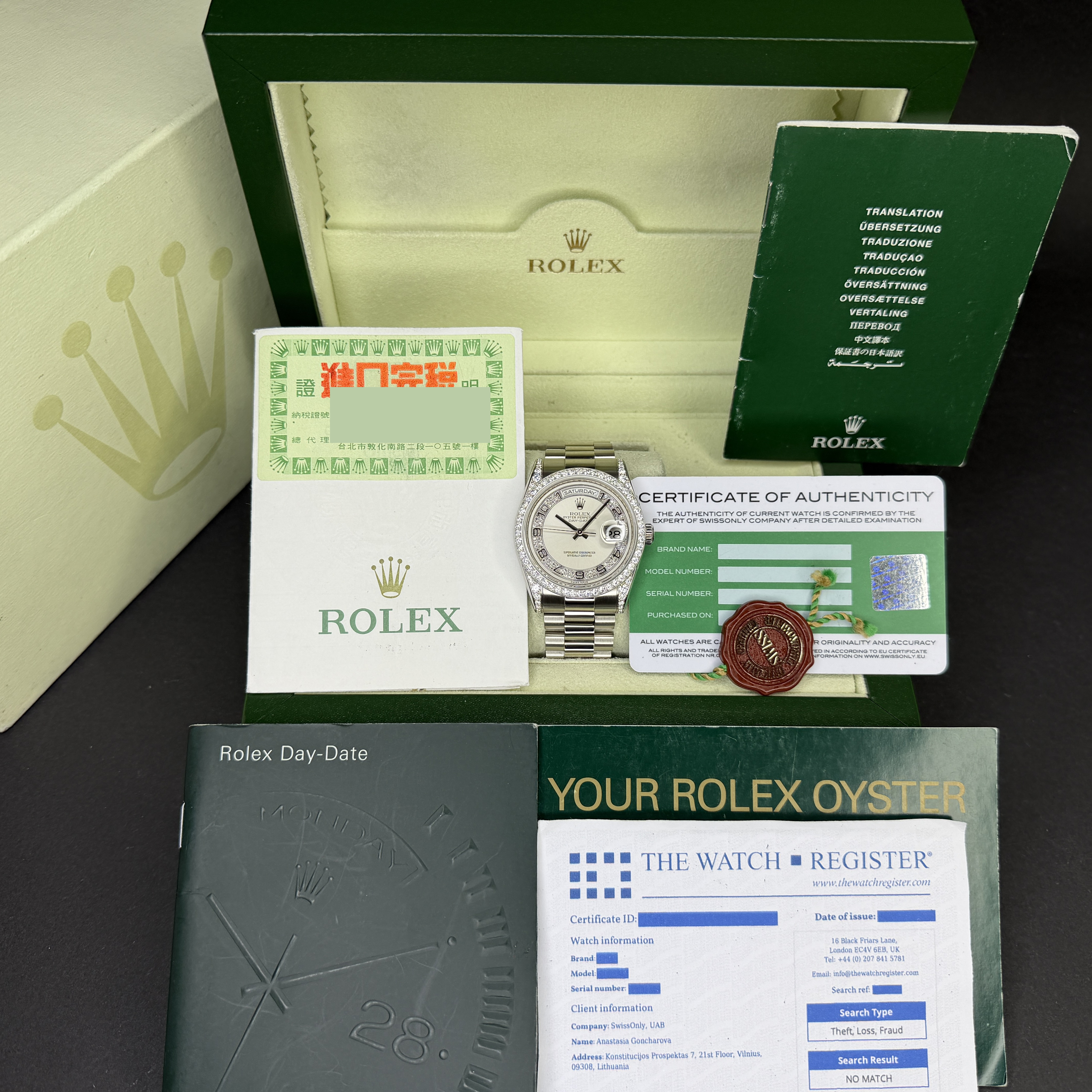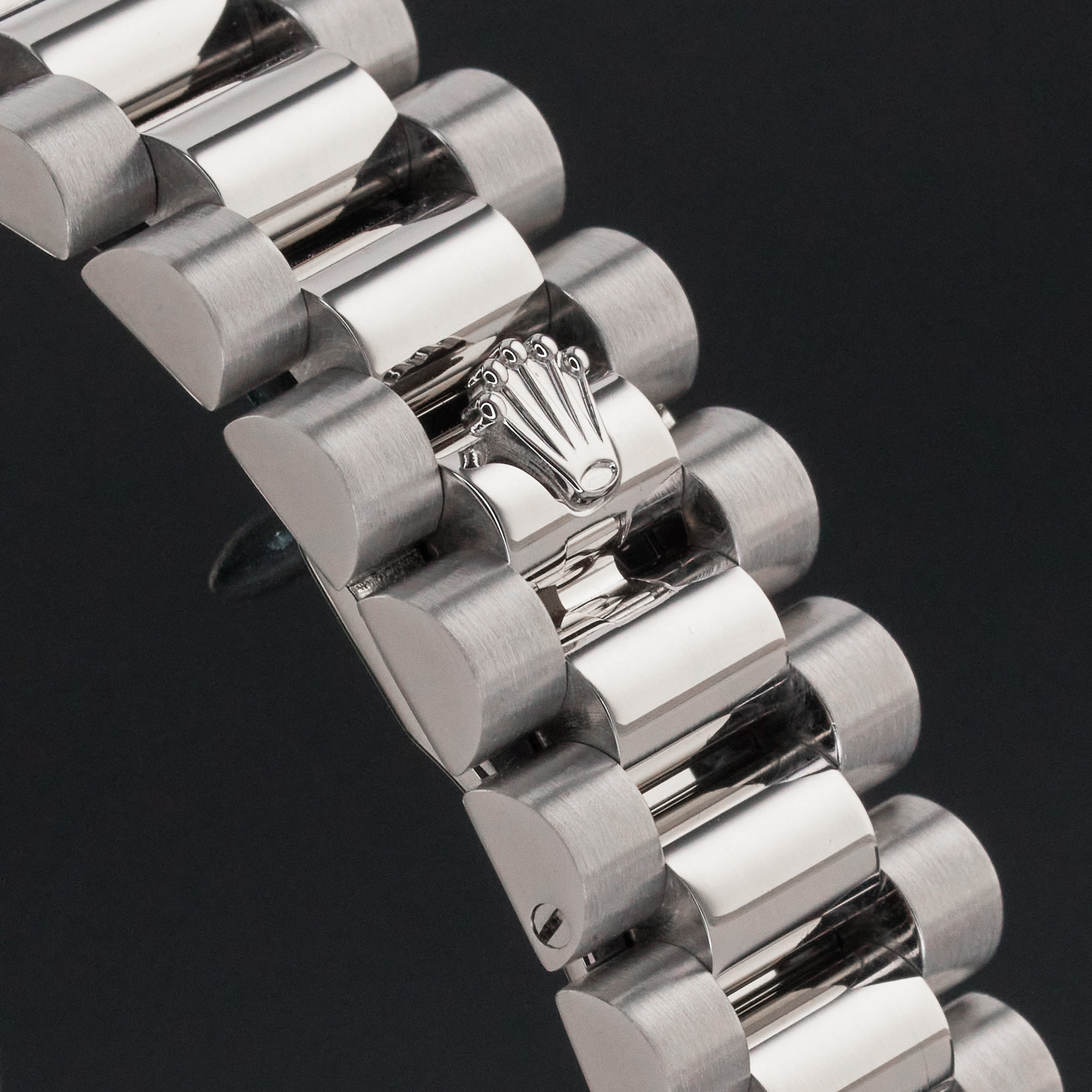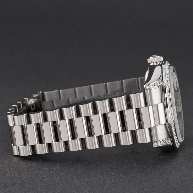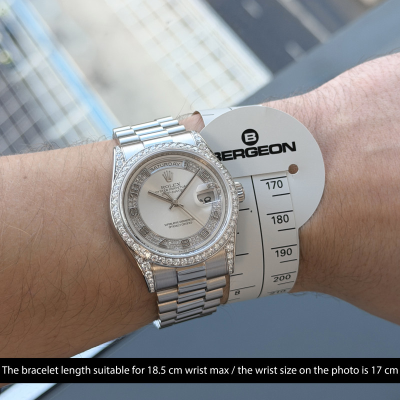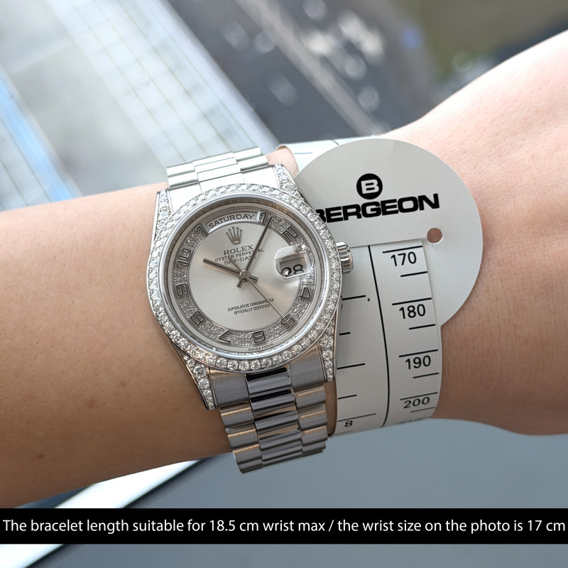 This Rolex Day-Date 118389 features a Silver myriad diamond Arabic dial and is crafted from 18K white gold, with a production year of 2006.