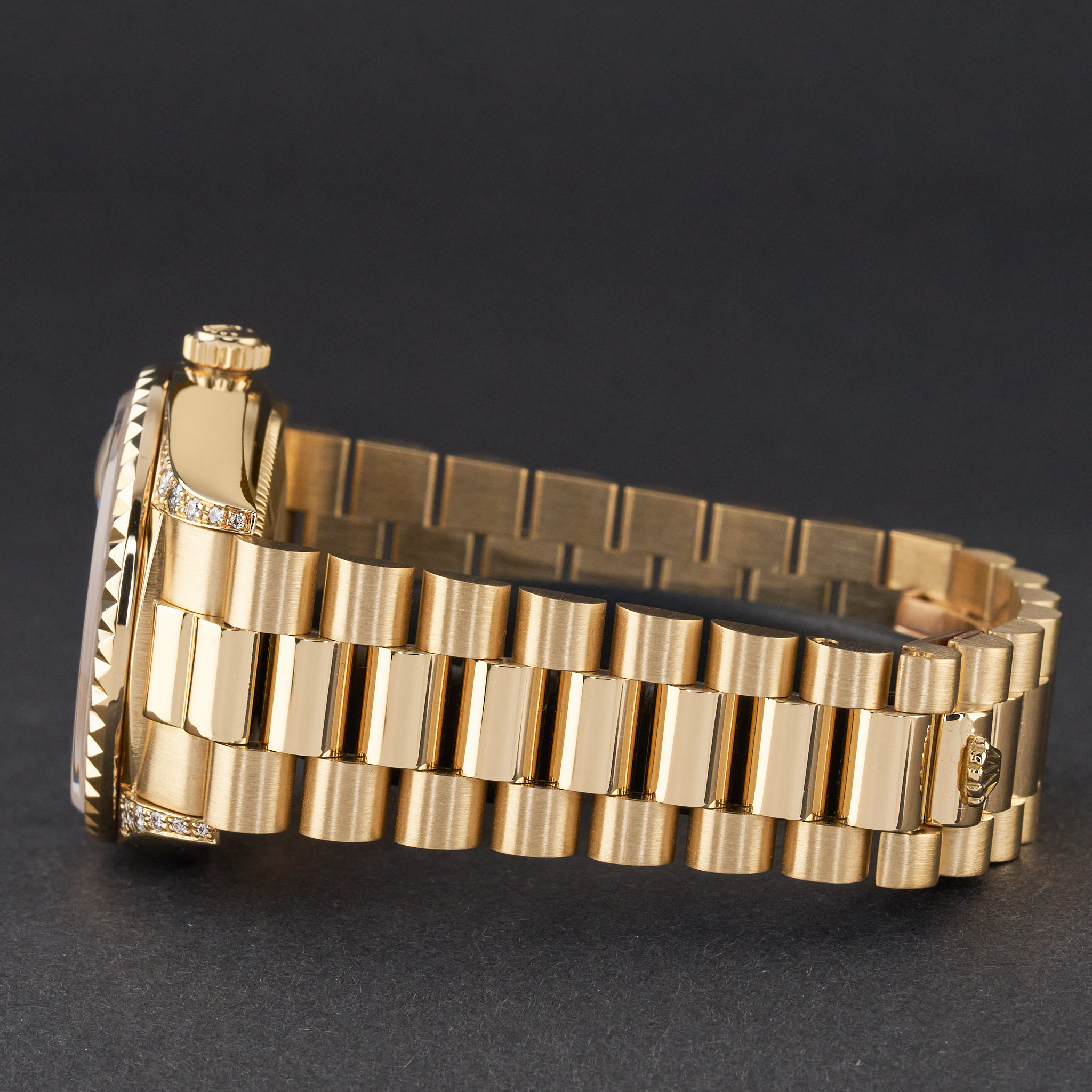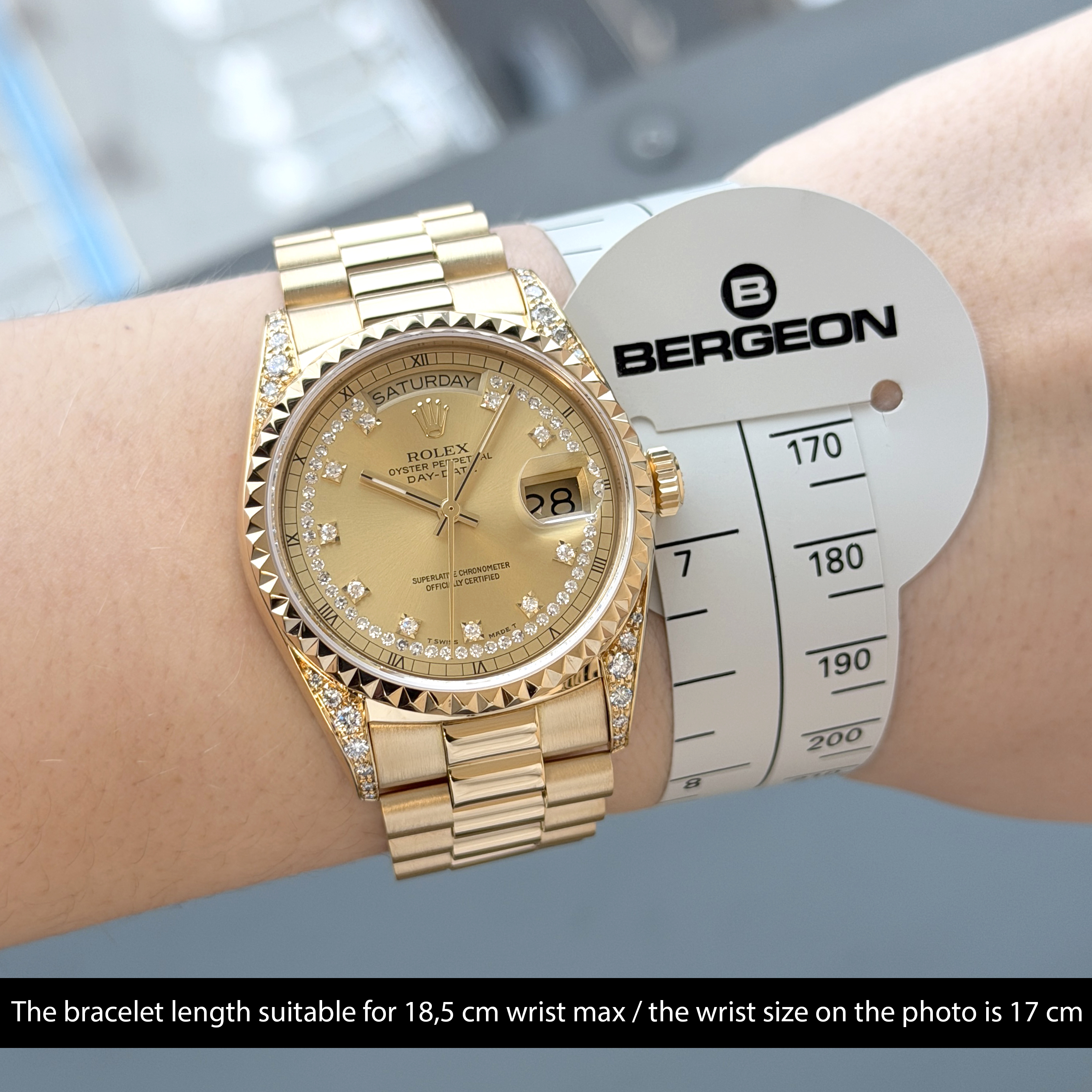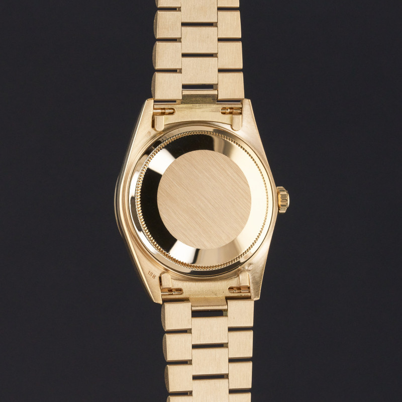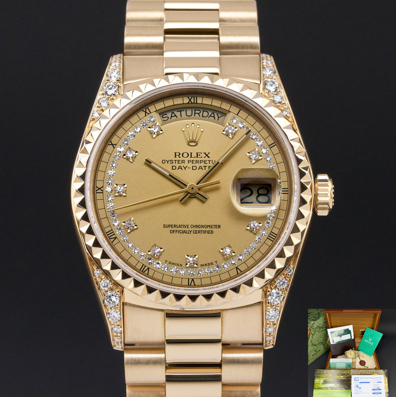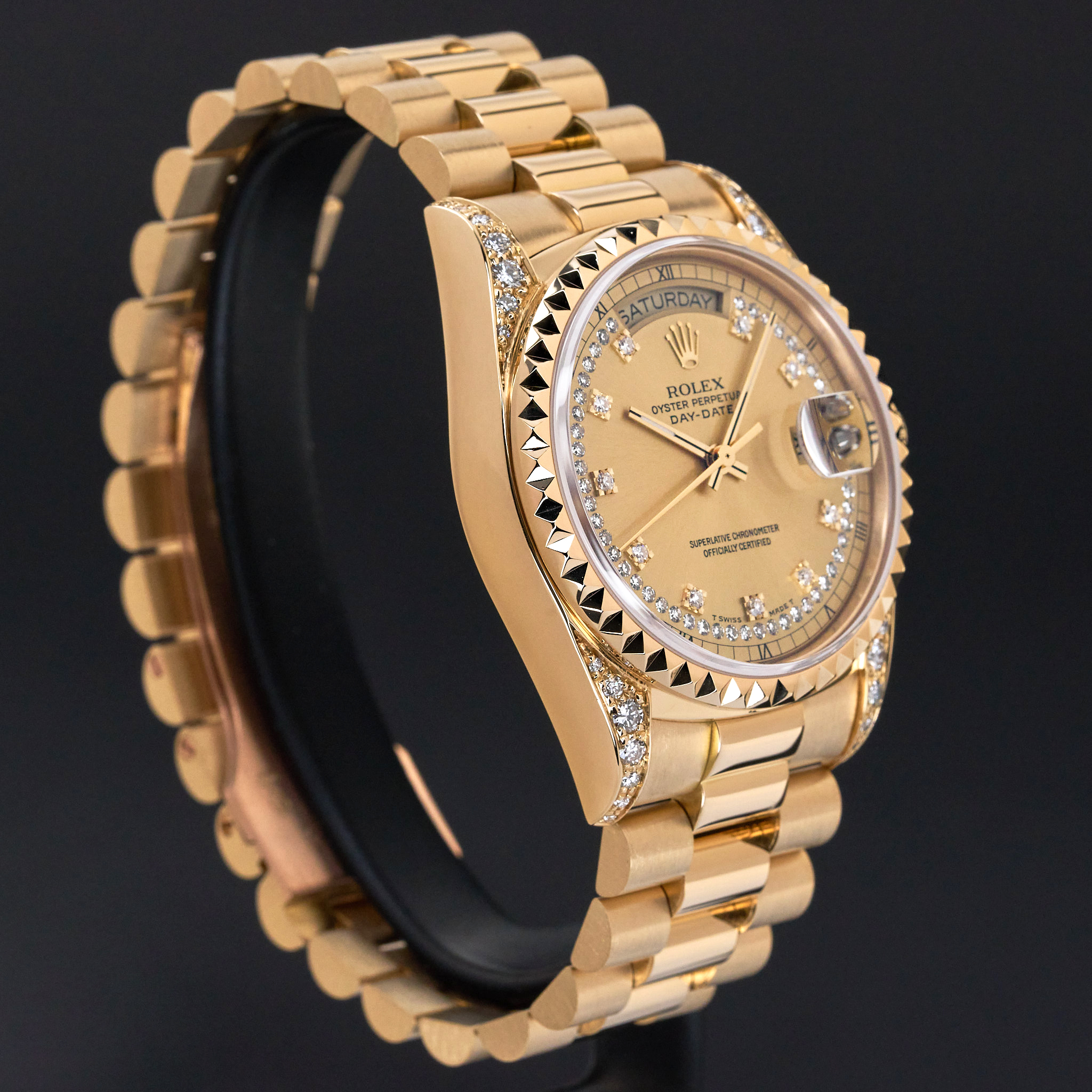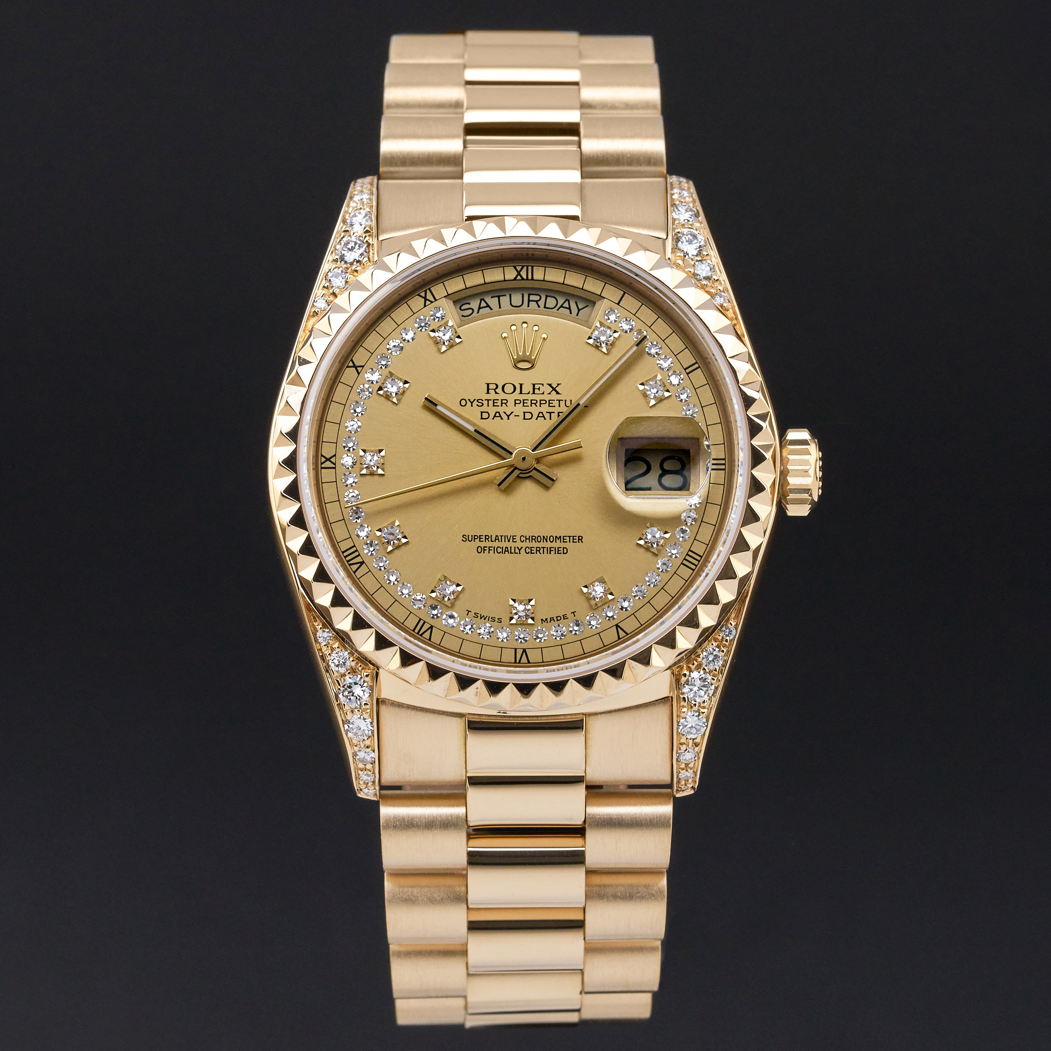 This Rolex Day-Date 18018 features a Champagne string small diamond dial and is crafted from 18K yellow gold, with a production year of 1987.