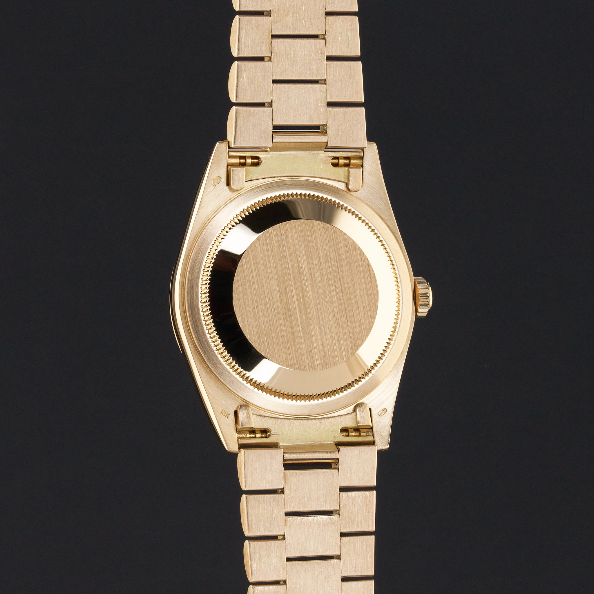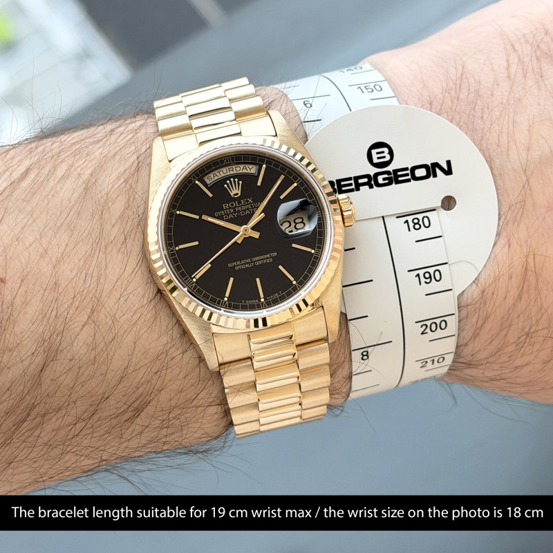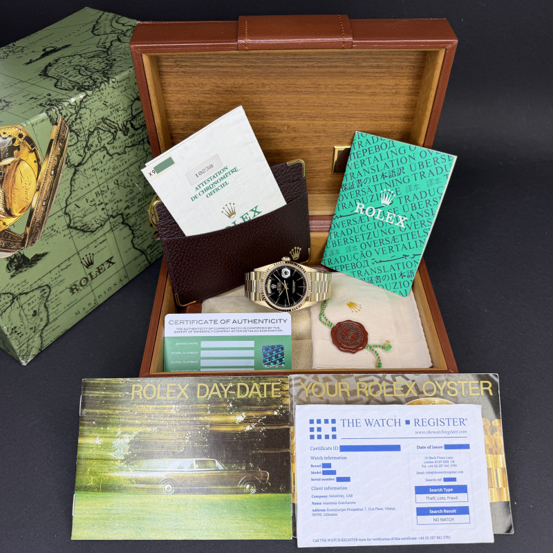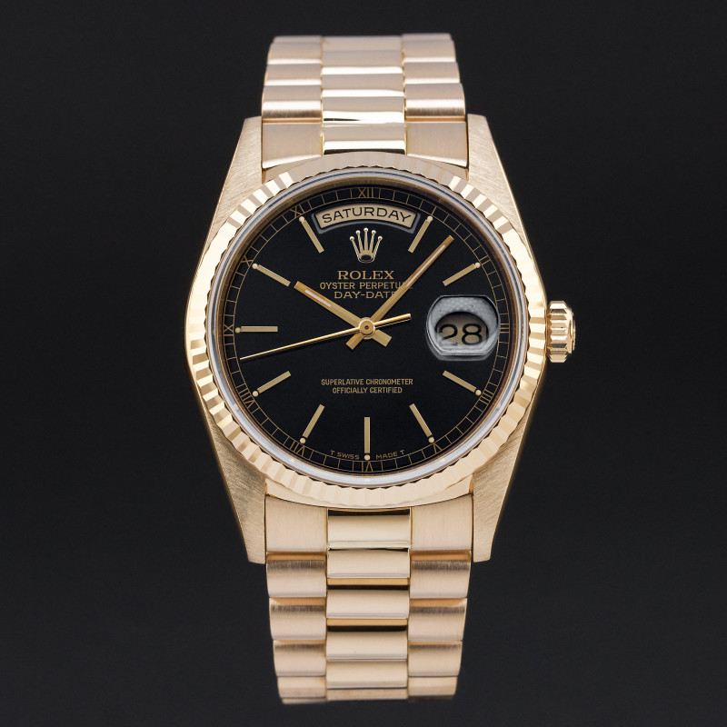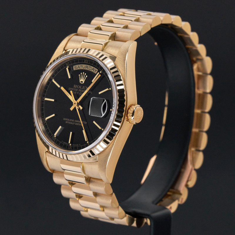 This Rolex Day-Date 18238 features a Black dial and is crafted from 18K yellow gold, with a production year of 1991.