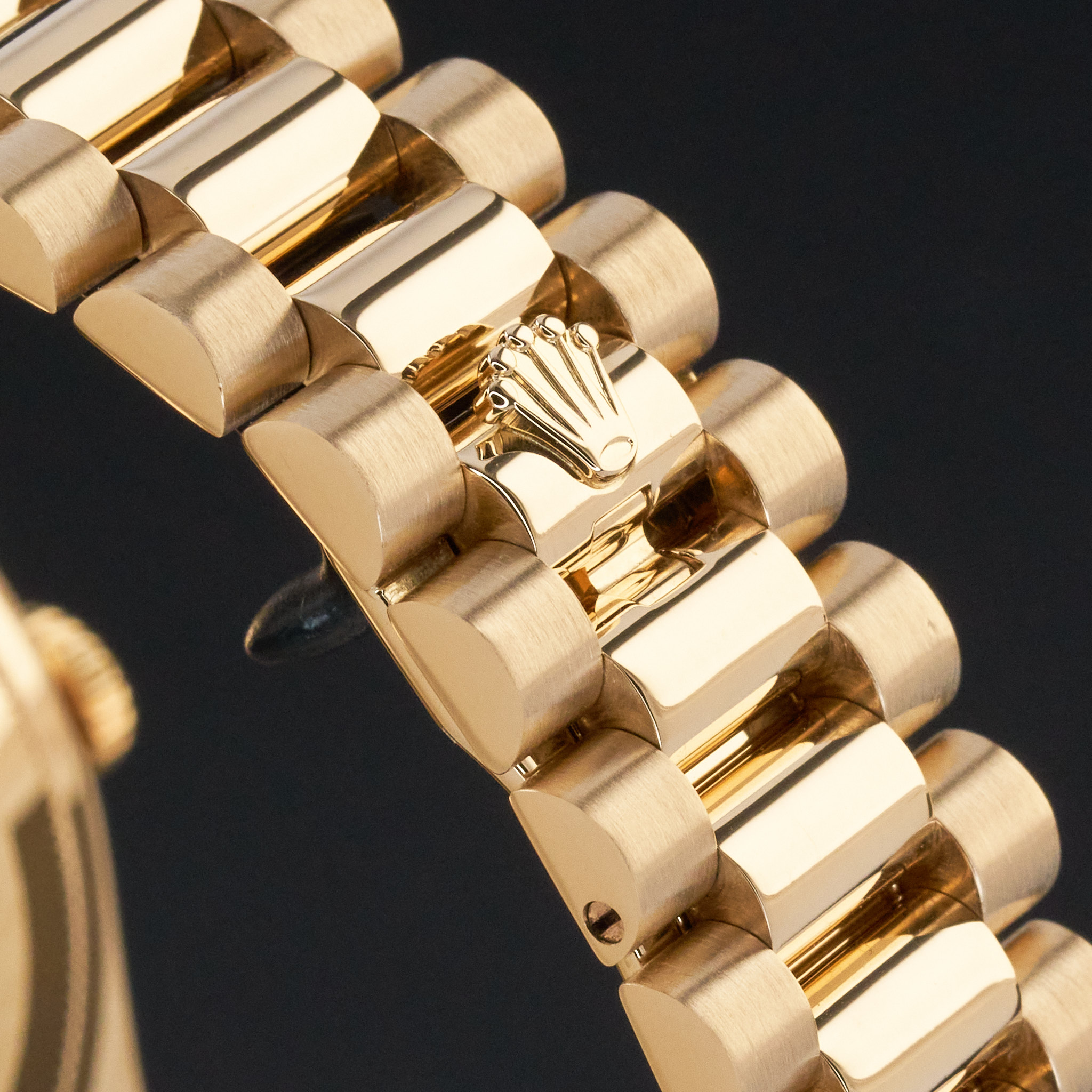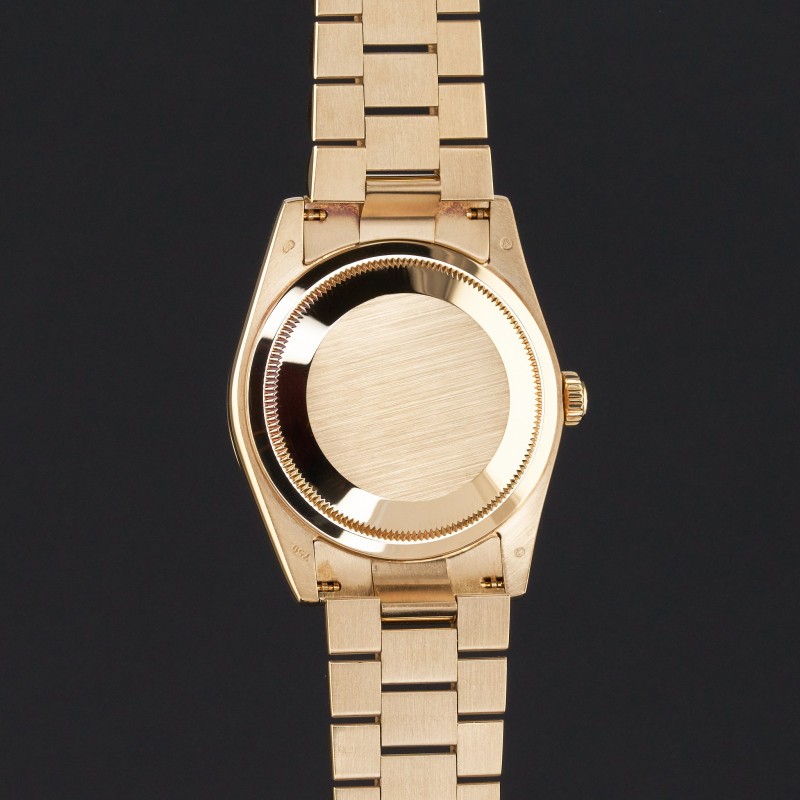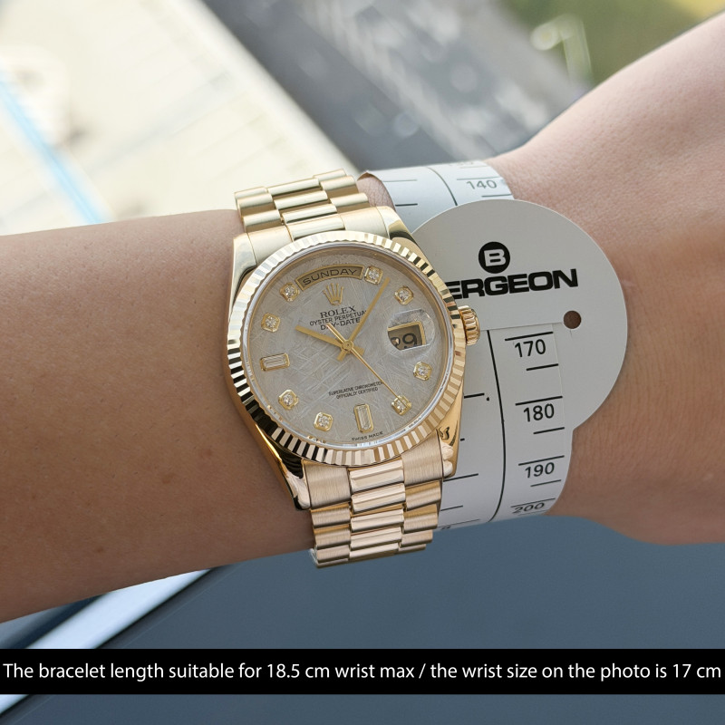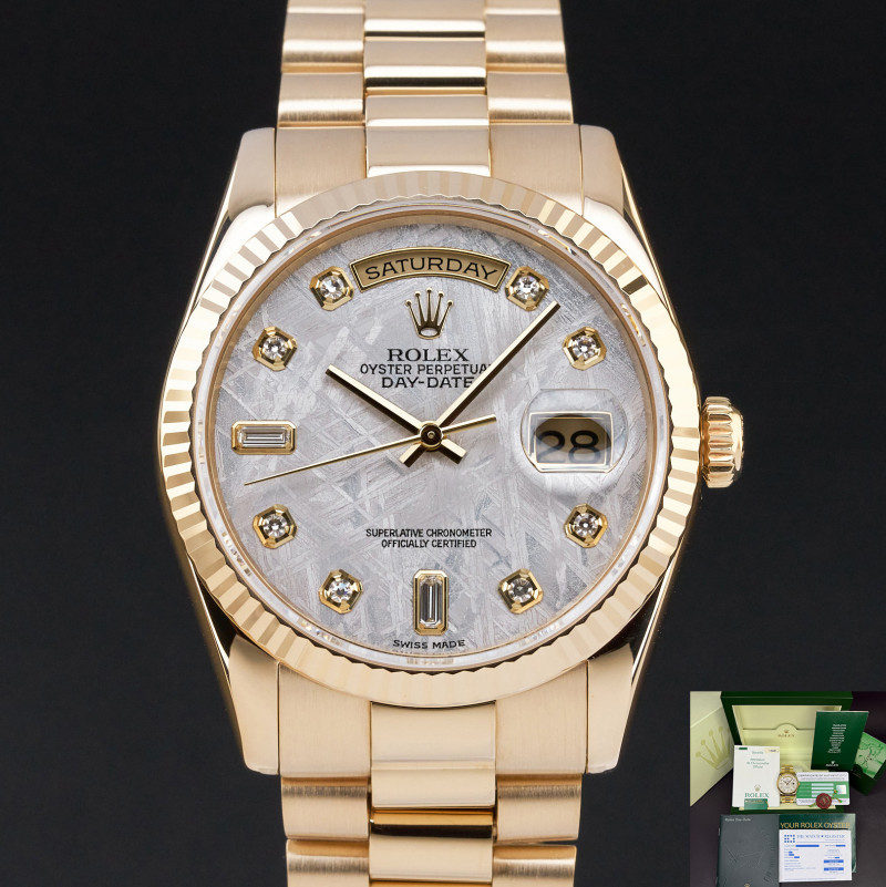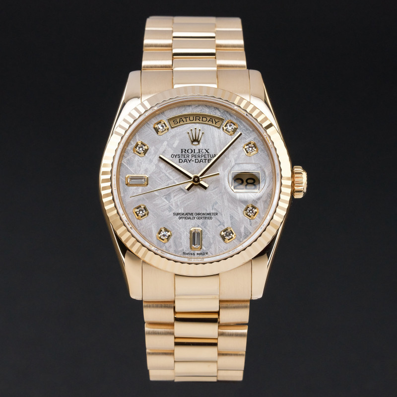 This Rolex Day-Date 118238 features a Meteorite diamond dial and is crafted from 18K yellow gold, with a production year of 2004.