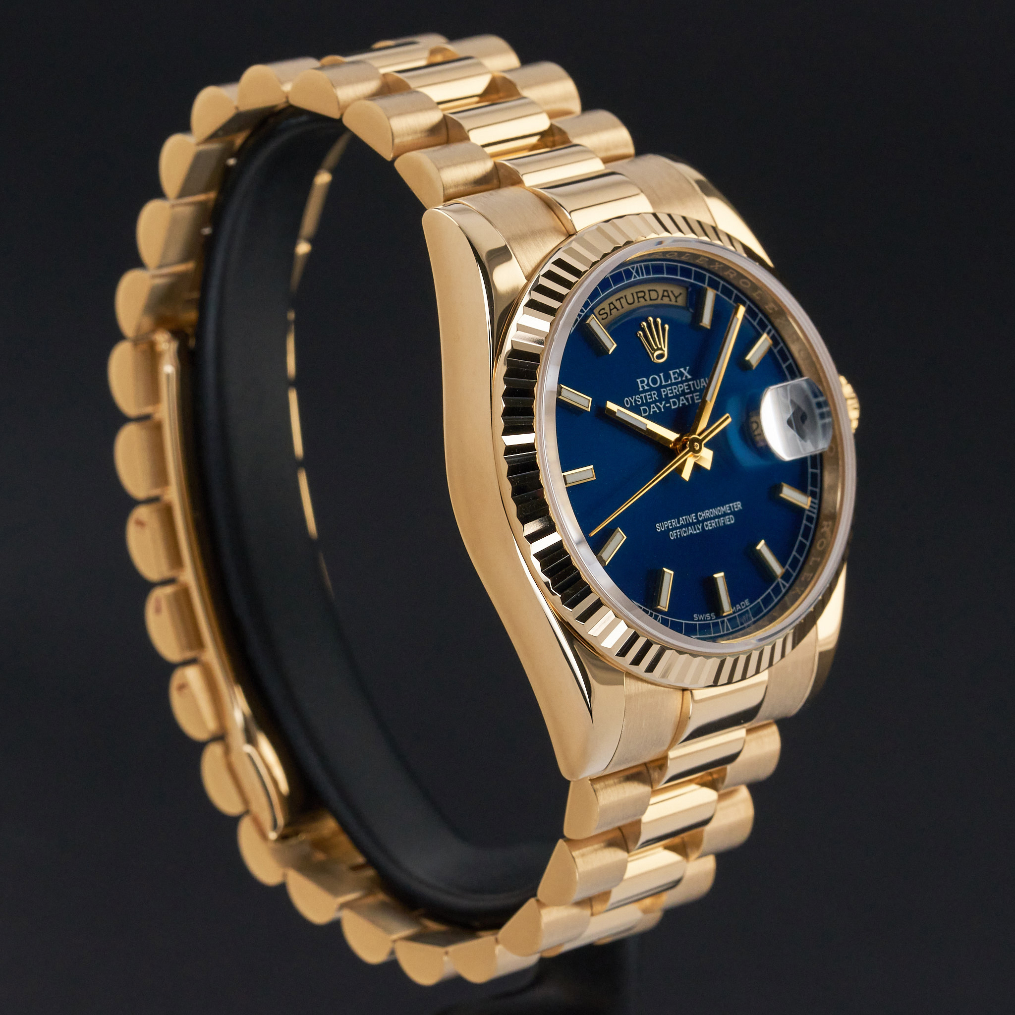 This Rolex Day-Date 118238 features a Blue dial and is crafted from 18K yellow gold, with a production year of 2009.
