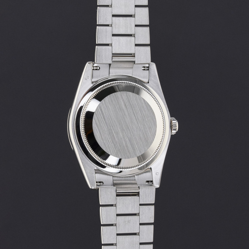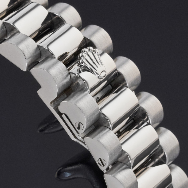 This particular Rolex Day-Date introduced in 2001, is a striking blend of prestige and bold refinement. It's rich blue vignette dial is set with large diamond hour markers, creating a dramatic contrast and a radiant visual impact. The watch combines signature Day-Date functionality with timeless design elements that elevate any presence.
