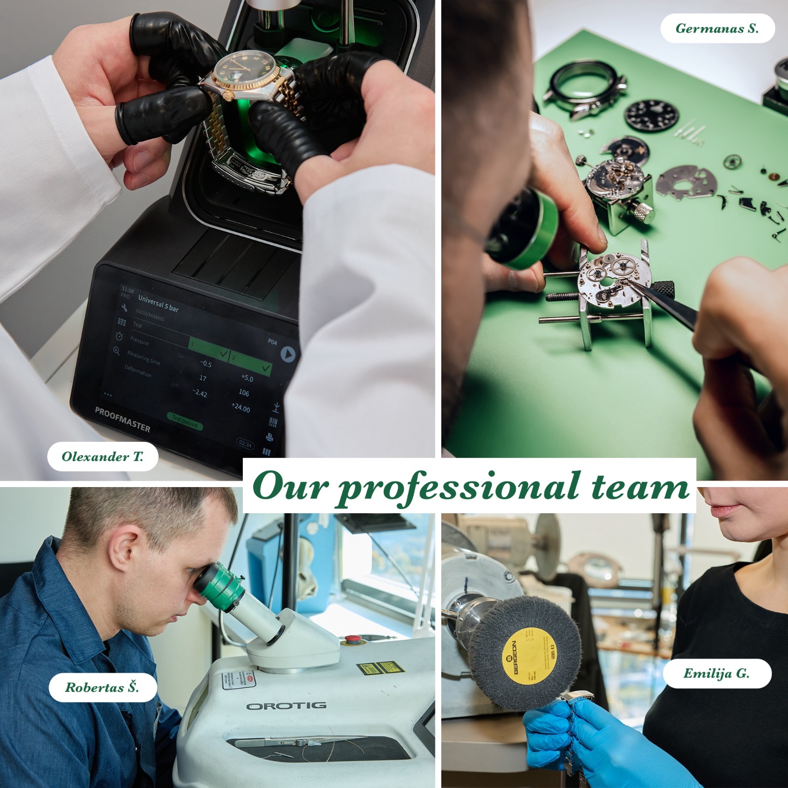 • Watches are serviced in our own workshop by our 12 experienced watchmakers.