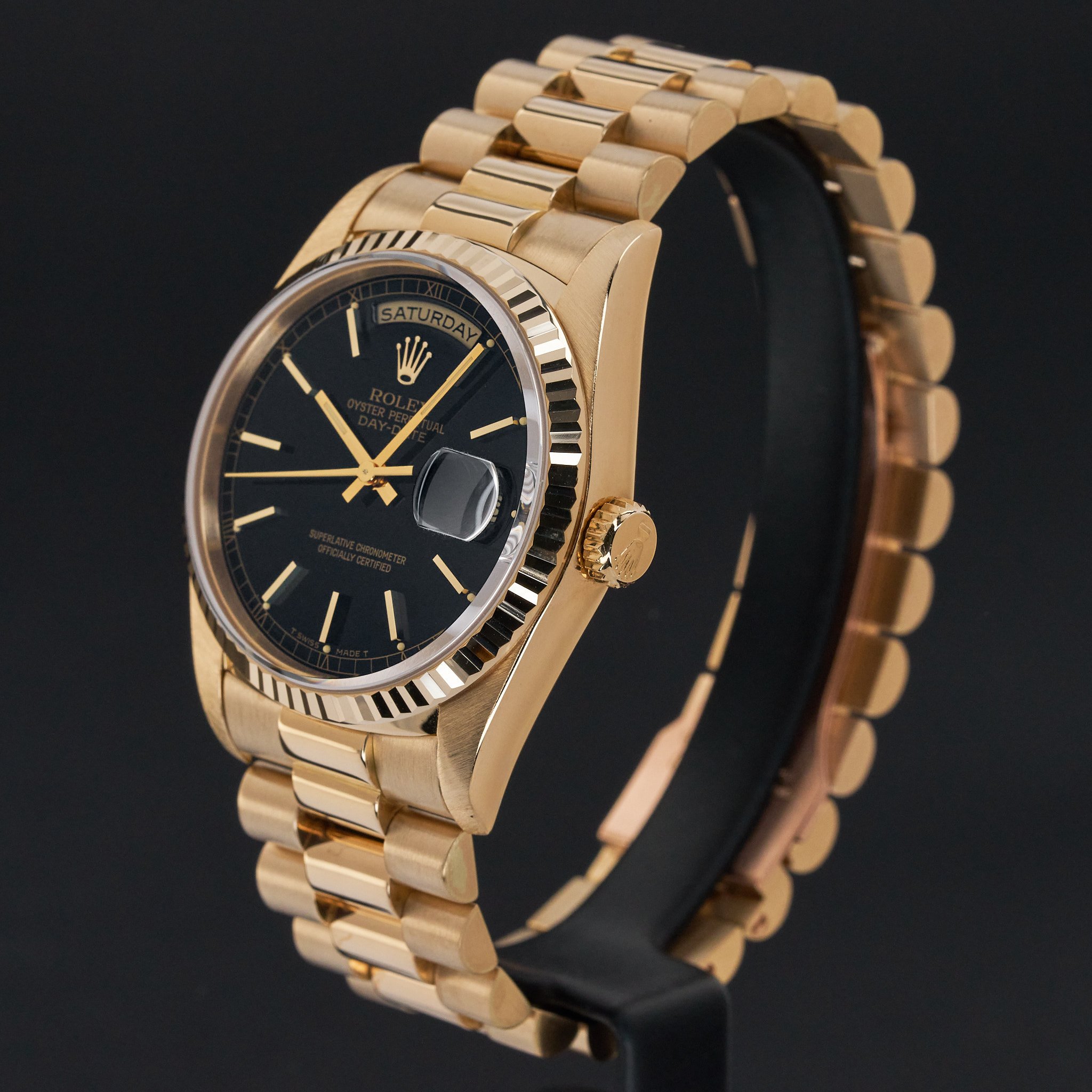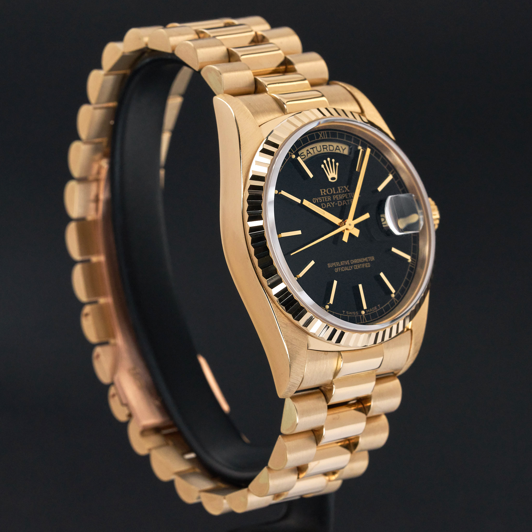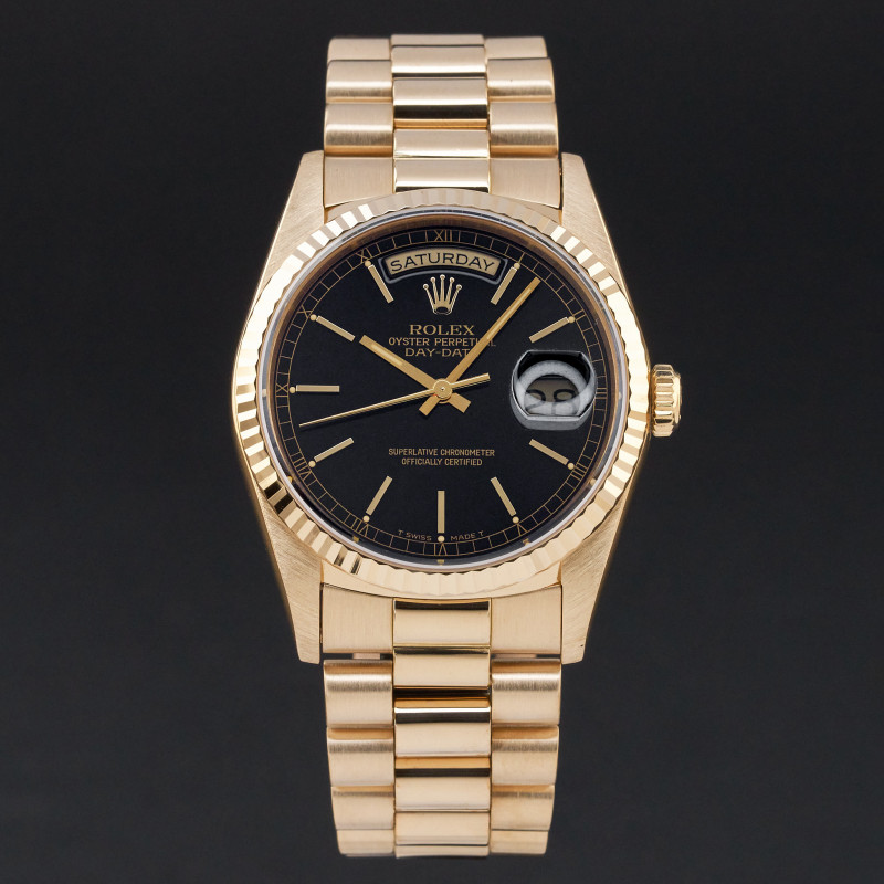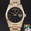 This Rolex Day-Date 18238 features a Black dial and is crafted from 18K yellow gold, with a production year of 1990.