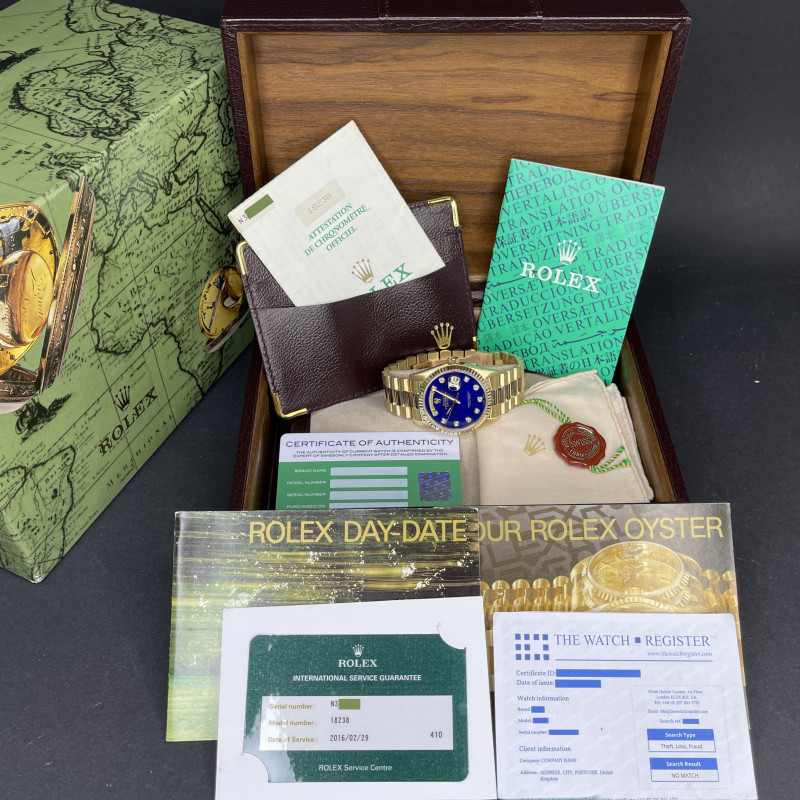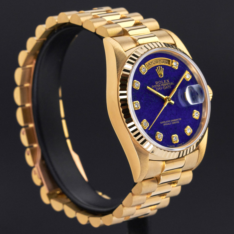 This Rolex Day-Date 18238 features a Lapis Lazuli Diamond dial and is crafted from 18K yellow gold, with a production year of 1991.
