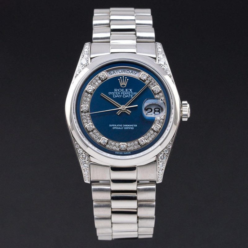This Rolex Day-Date 18296 features a Blue myriad big diamond dial and is crafted from platinum, with a production year of 1995.