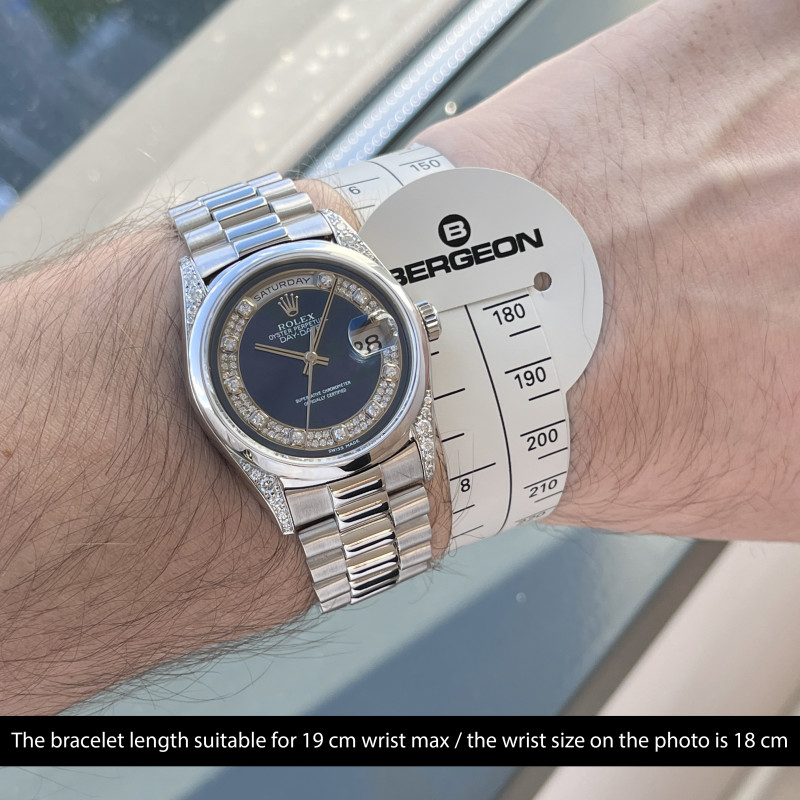 This particular Rolex Day-Date introduced in 1995, represents the pinnacle of refinement and exclusivity. Crafted in platinum, this exceptional timepiece radiates sophistication and power. The mesmerizing blue Myriad dial, adorned with large diamond hour markers, creates an extraordinary play of light and depth – a perfect harmony between luxury and craftsmanship.