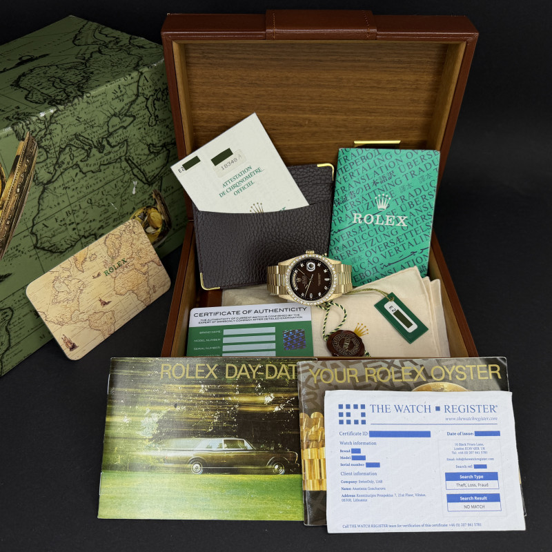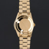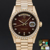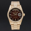 This Rolex Day-Date 18348 features a Brown vignette diamond small dial and is crafted from 18K yellow gold, with a production year of 1990.
