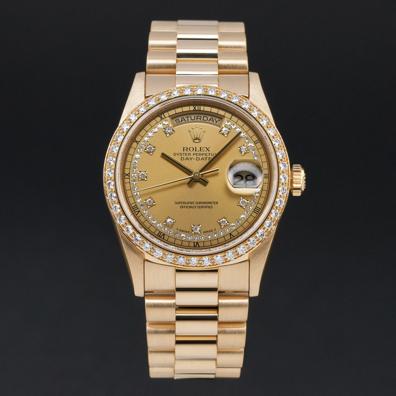 This Rolex Day-Date 18348 features a Champagne string diamond dial and is crafted from 18K yellow gold, with a production year of 1995.