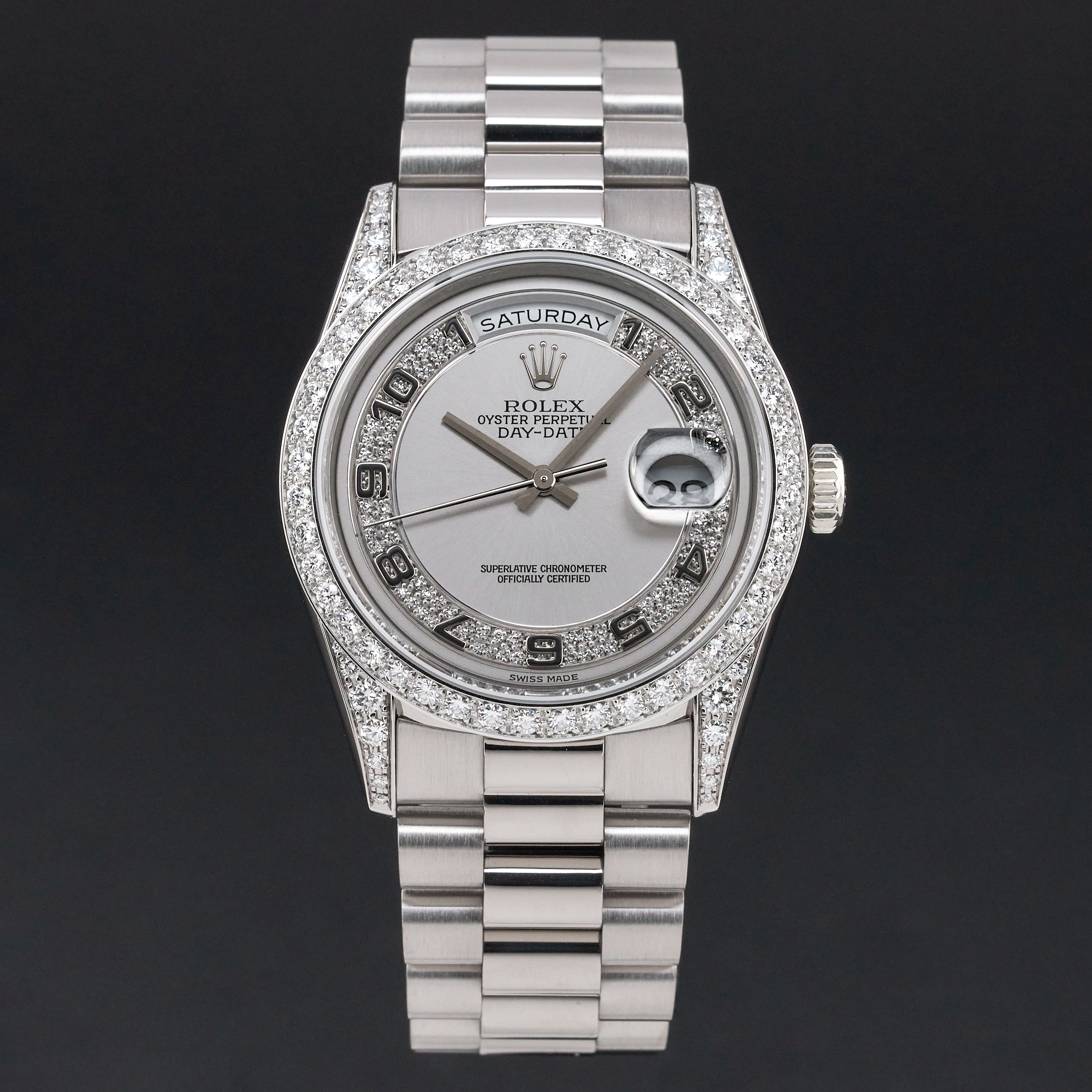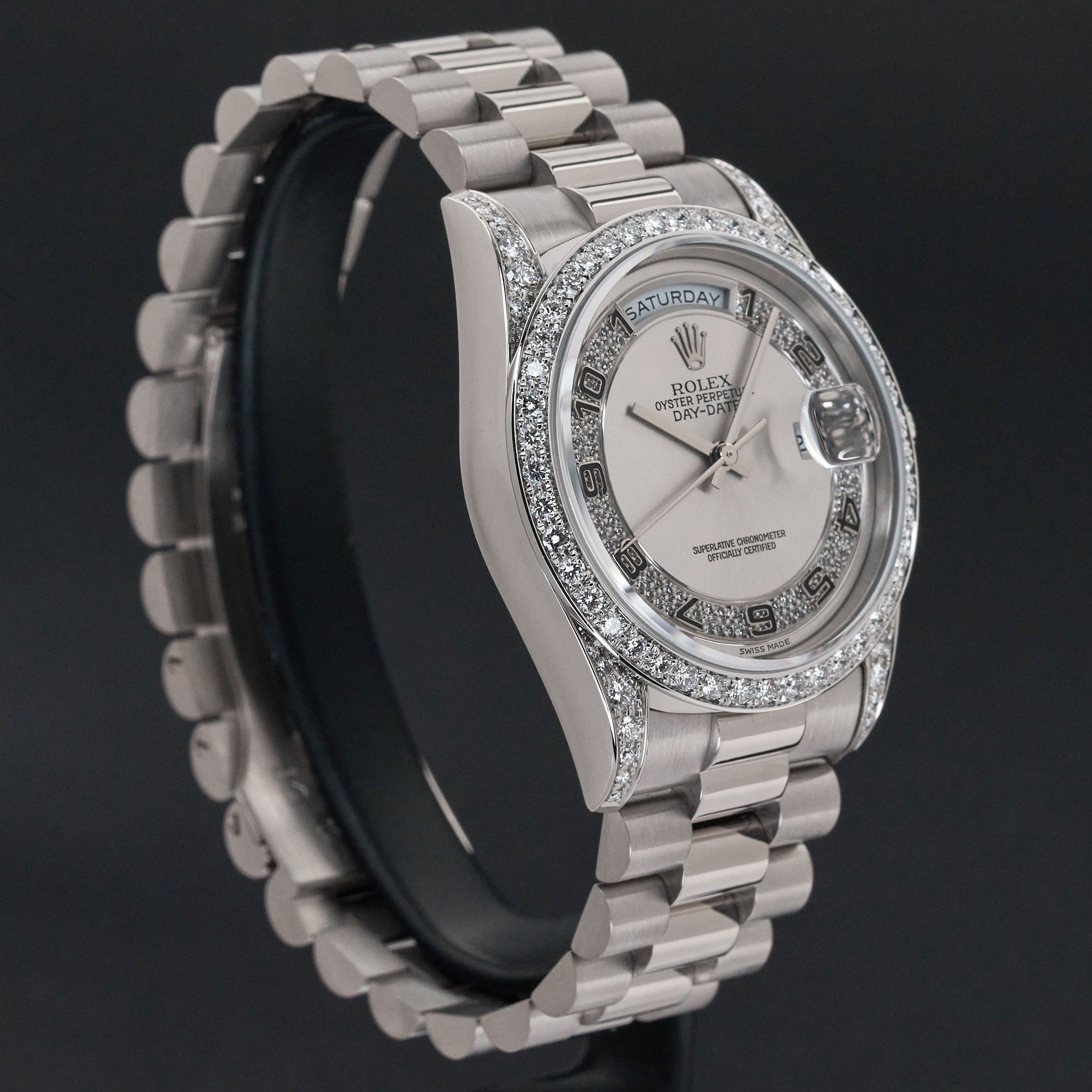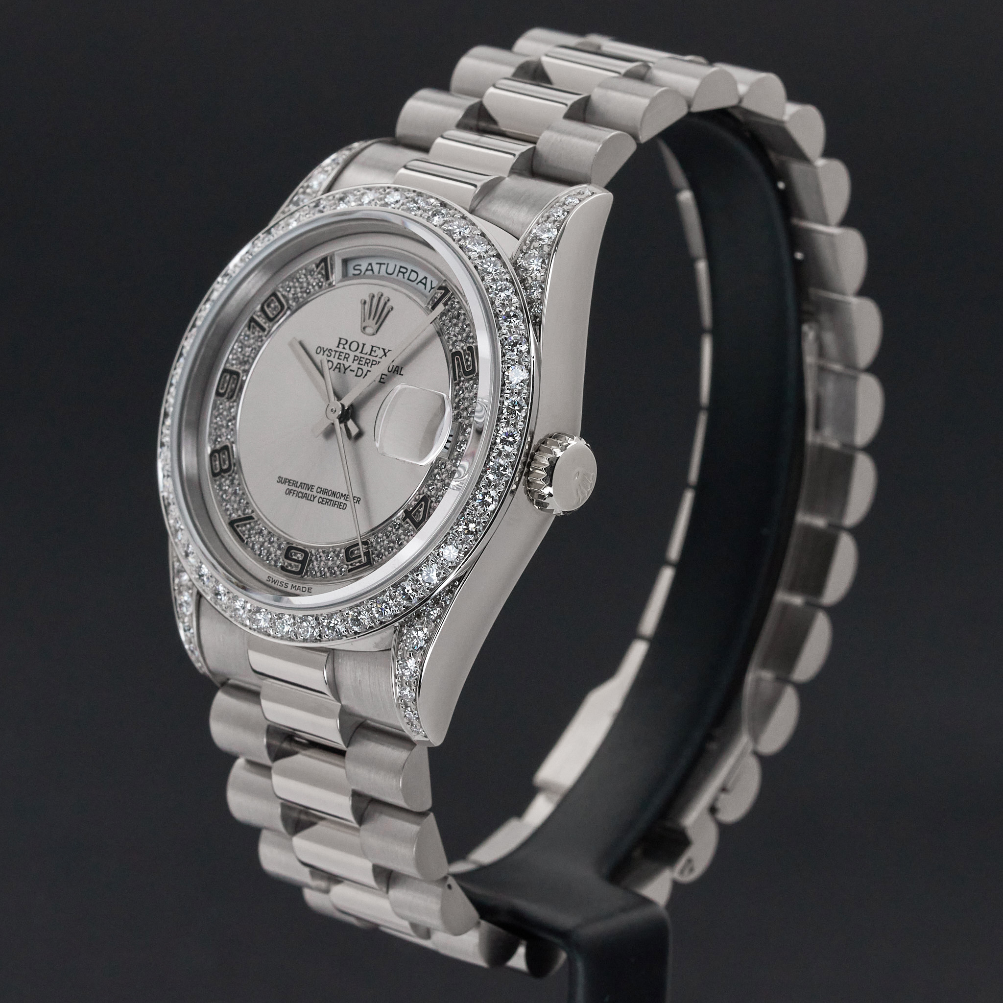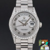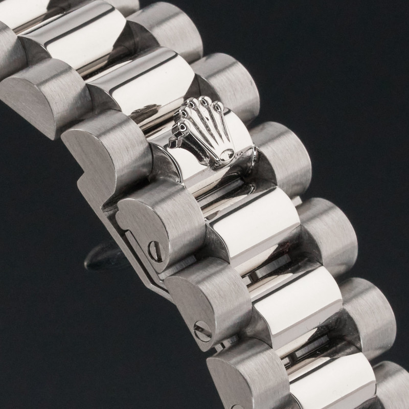 This particular Rolex Day-Date introduced in 1995, stands out with its unique dial. The silver background with Arabic numerals, enhanced by diamonds, creates a balance between elegance and refined style. The dial adds depth and allure to the watch, with its delicate texture and light reflections.