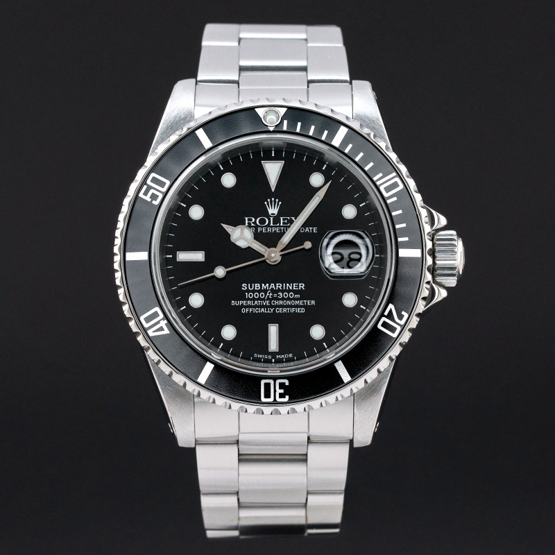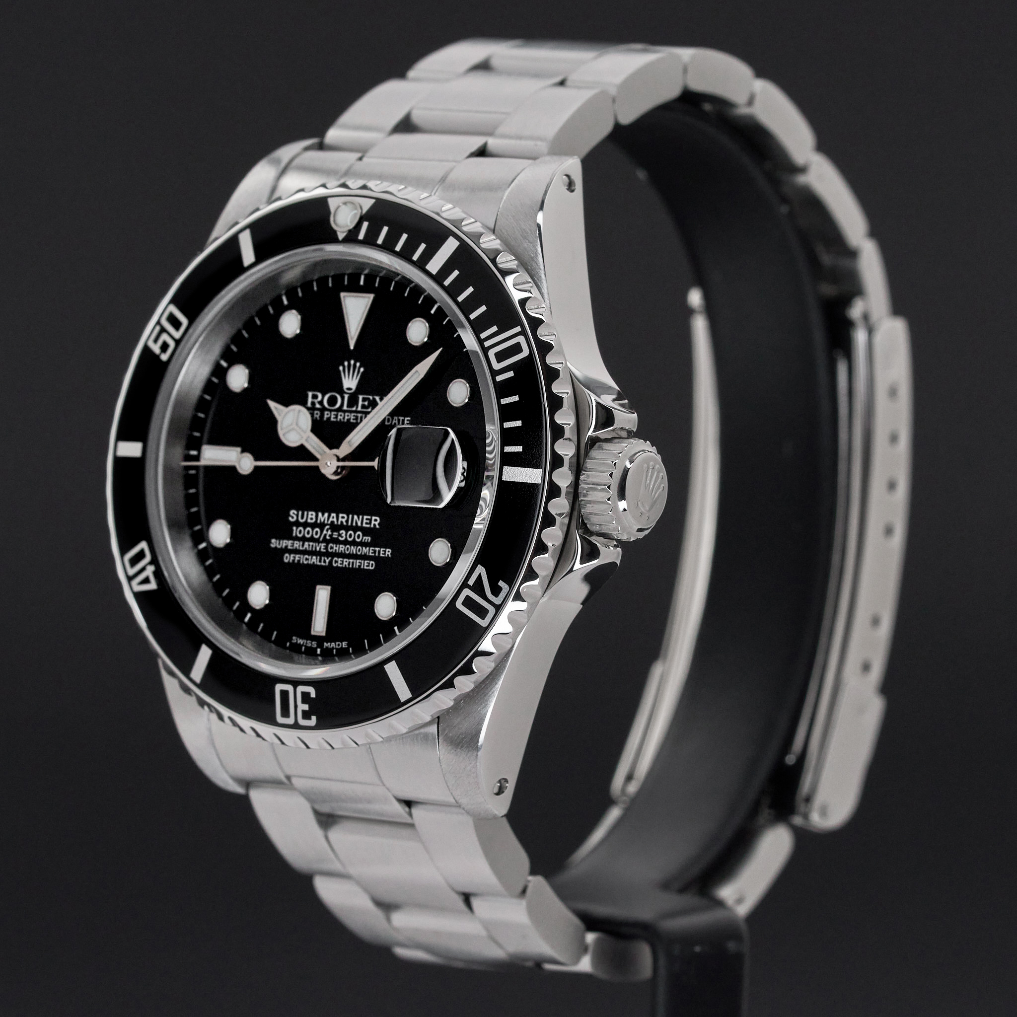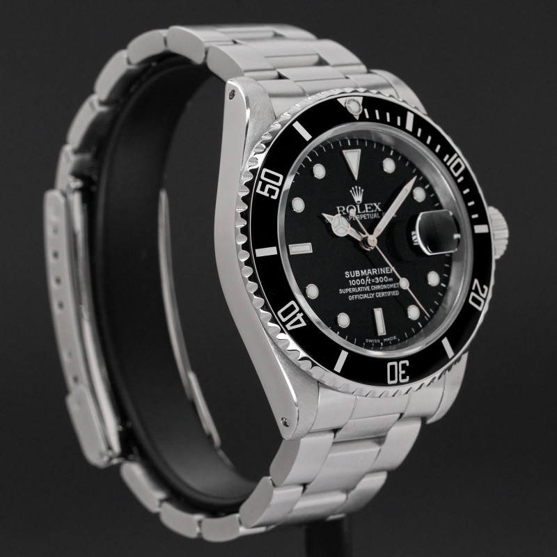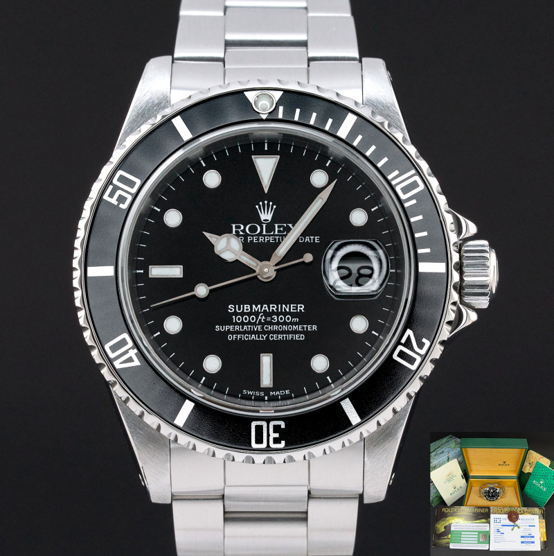 This Rolex Submariner Date 16610 features a Black dial and is crafted from stainless steel, with a production year of 1988.