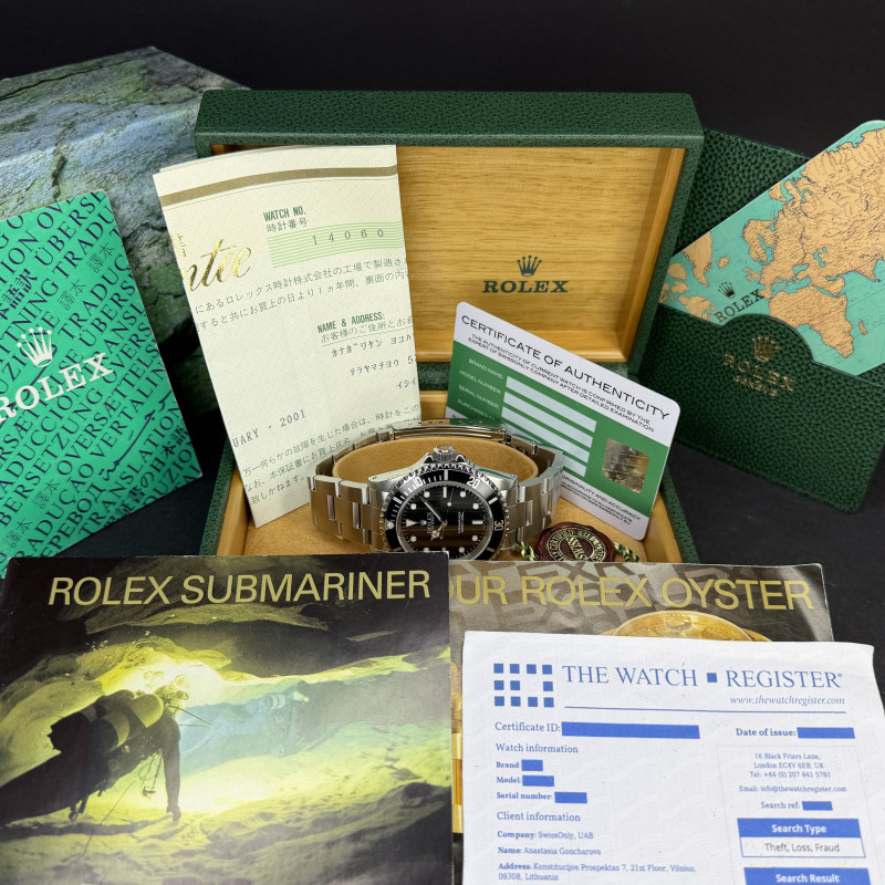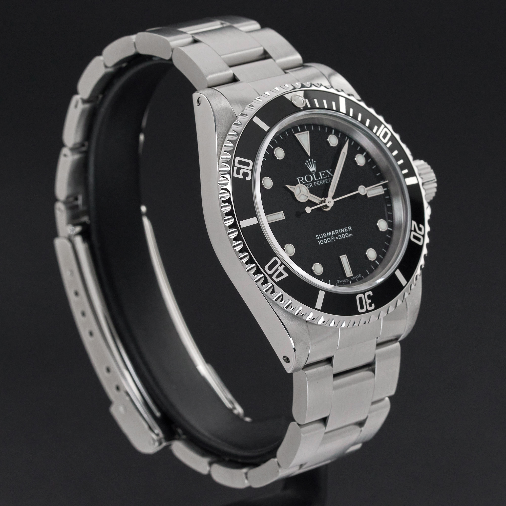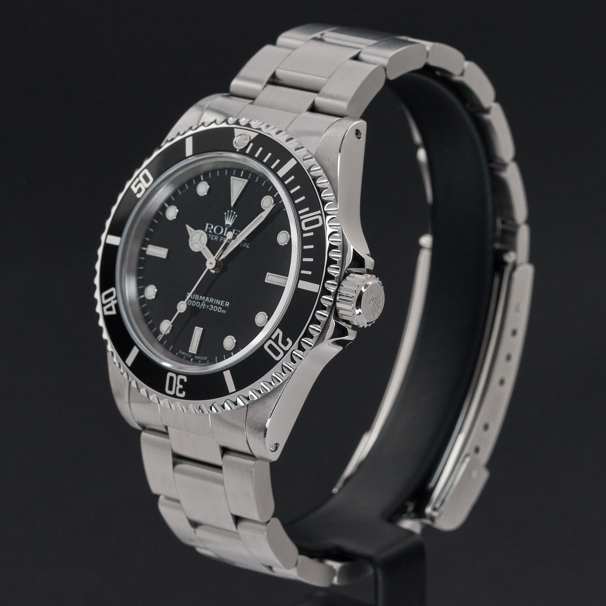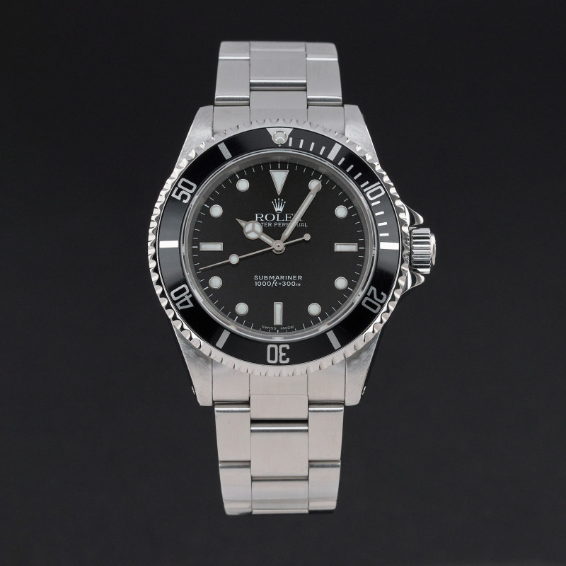 This Rolex Submariner (No Date) 14060 features a Black dial and is crafted from stainless steel, with a production year of 1999.